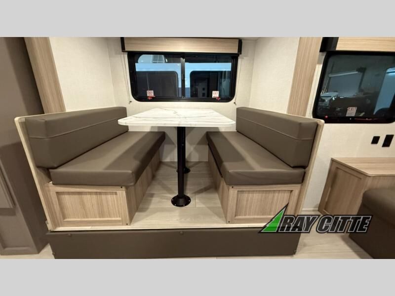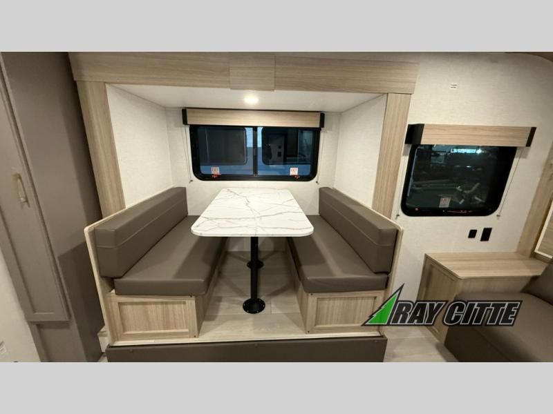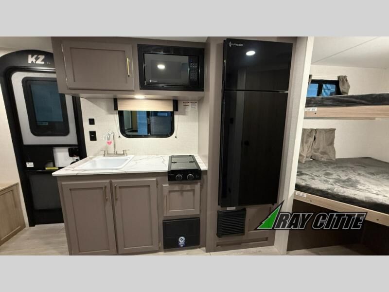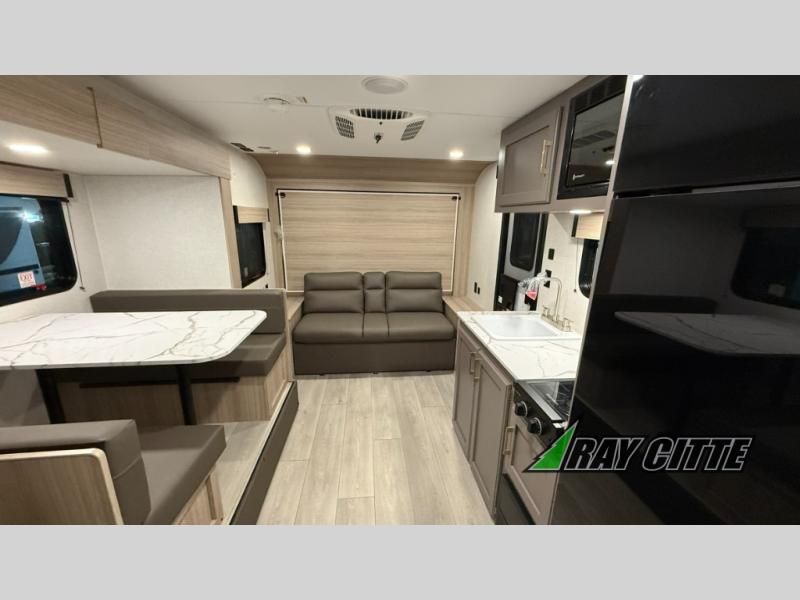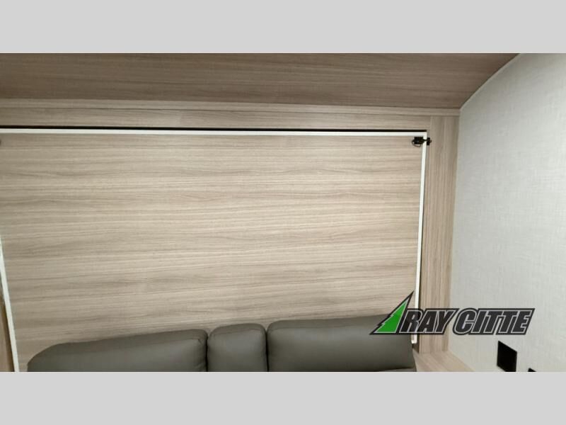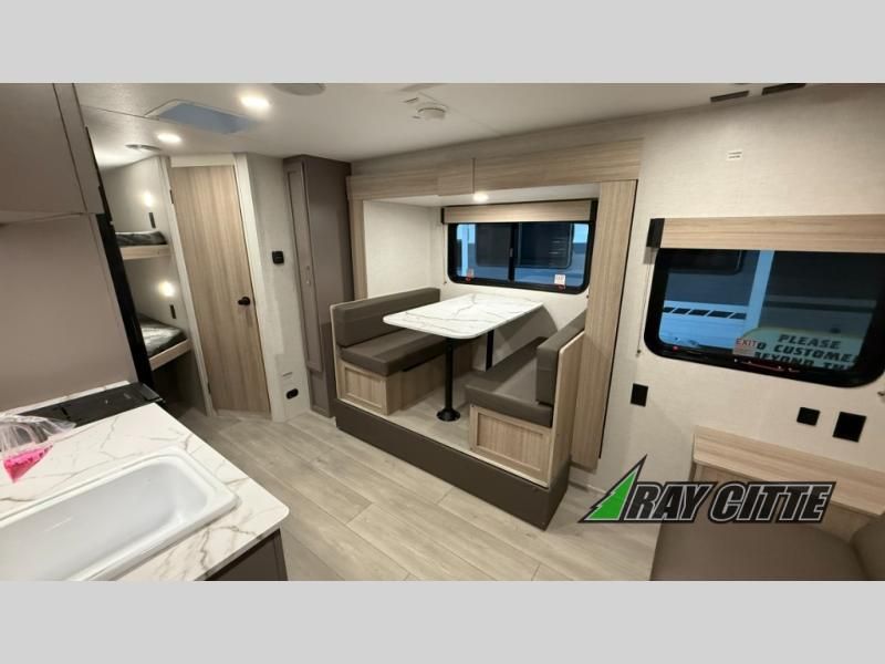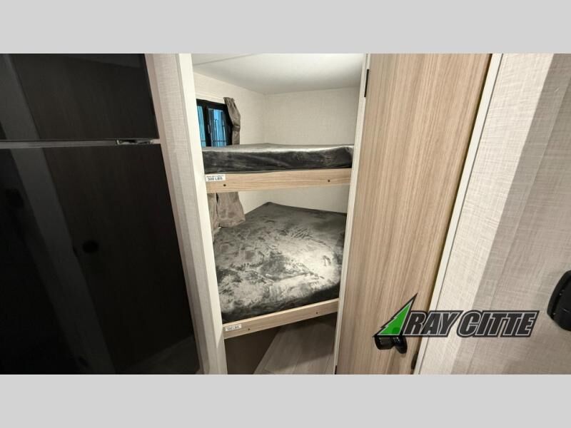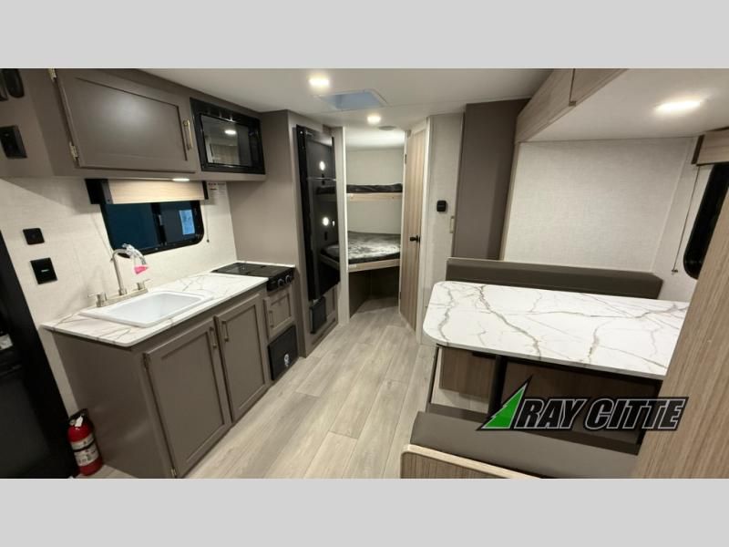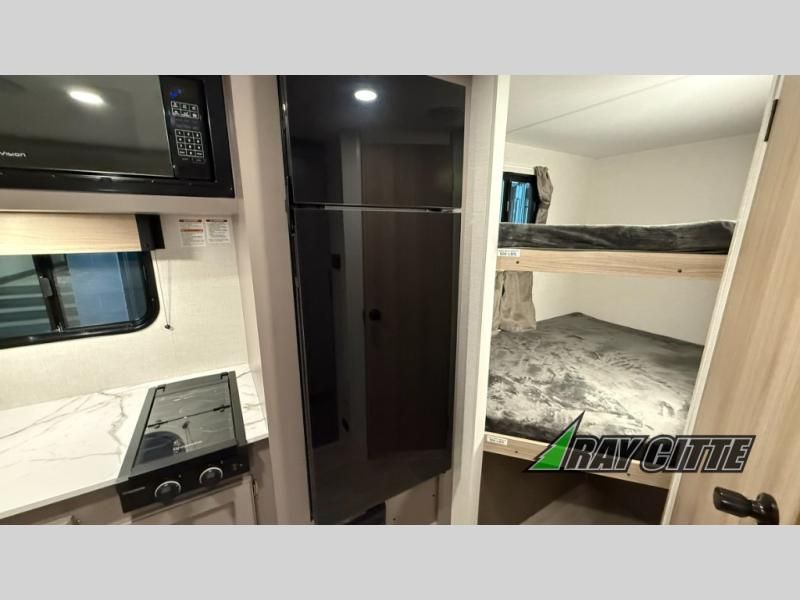 The spacious double-size bunk beds are perfect for families or groups, providing ample sleeping space for a restful night's sleep. There is a 60” jiffy sofa and a murphy bed that offers additional sleeping space or a comfortable spot to relax, making it ideal for families or couples. Further, the cozy booth dinette is a perfect spot for meals or playing board games, creating lasting memories with loved ones. In the kitchen area, the 12V refrigerator keeps your food and drinks fresh, while the microwave provides a convenient way to prepare meals on the go. And after a long day, the full bathroom will be a haven for convenience and comfort, featuring everything you need to freshen up on the go.
