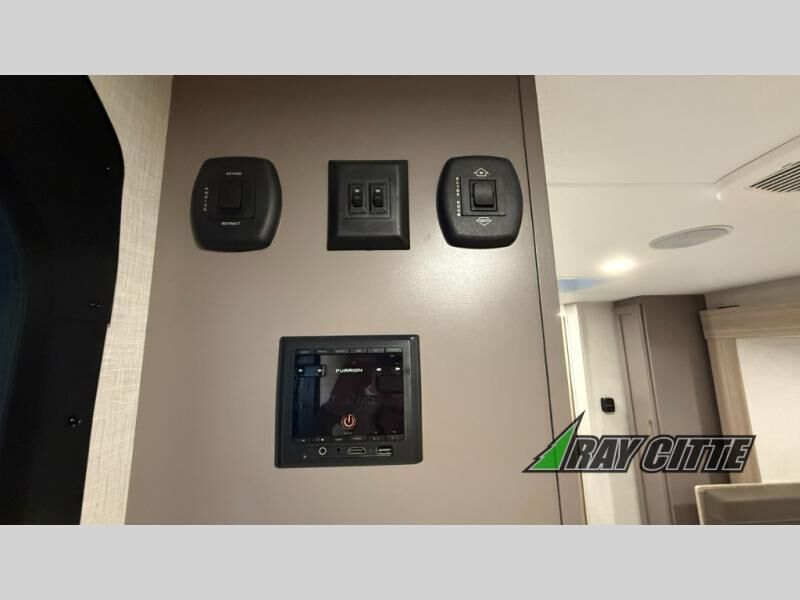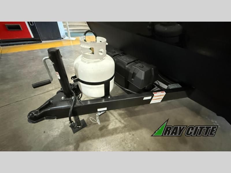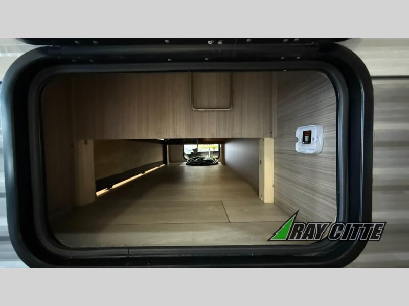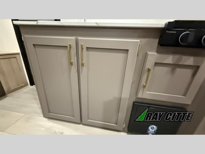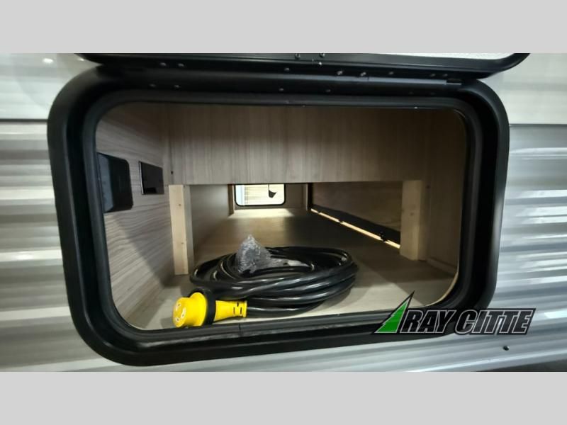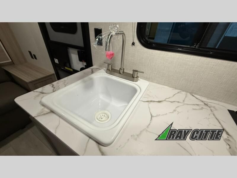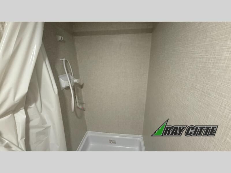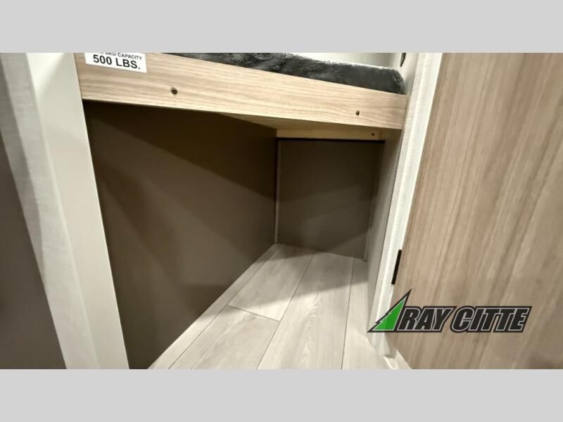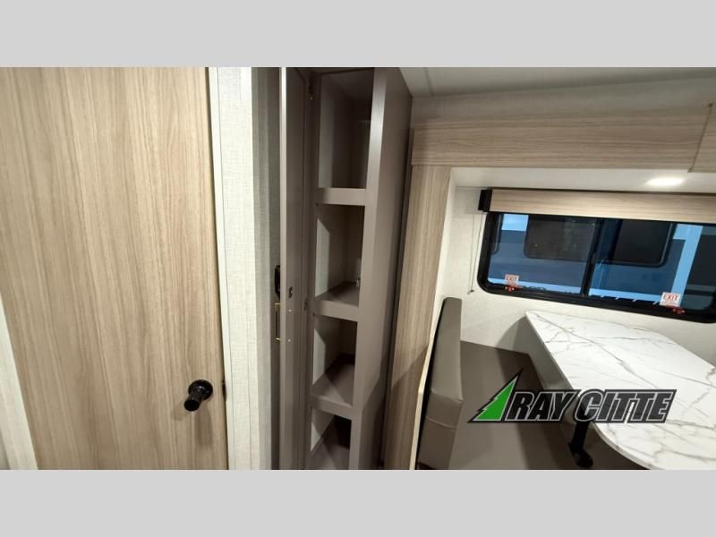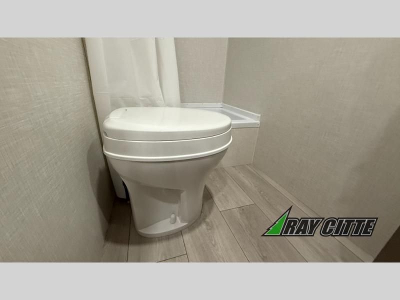 The spacious double-size bunk beds are perfect for families or groups, providing ample sleeping space for a restful night's sleep. There is a 60” jiffy sofa and a murphy bed that offers additional sleeping space or a comfortable spot to relax, making it ideal for families or couples. Further, the cozy booth dinette is a perfect spot for meals or playing board games, creating lasting memories with loved ones. In the kitchen area, the 12V refrigerator keeps your food and drinks fresh, while the microwave provides a convenient way to prepare meals on the go. And after a long day, the full bathroom will be a haven for convenience and comfort, featuring everything you need to freshen up on the go.