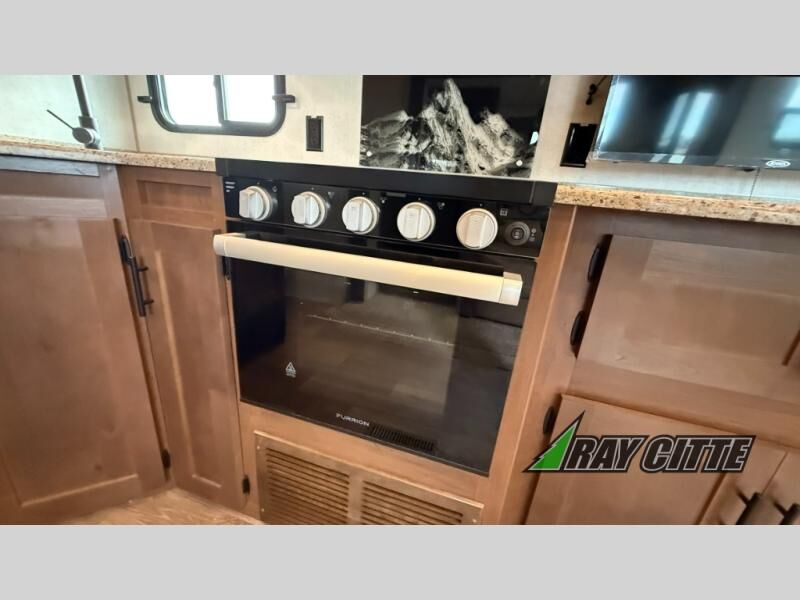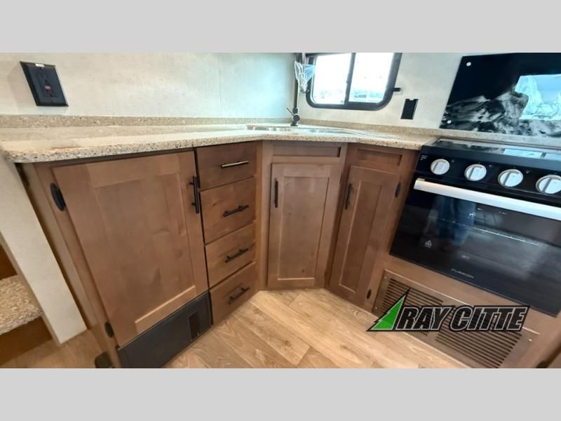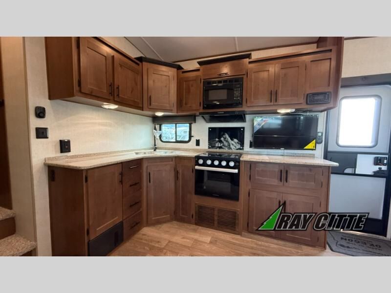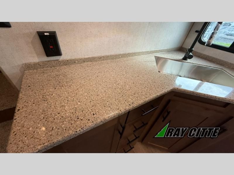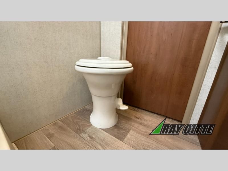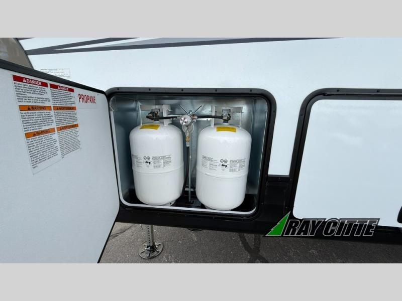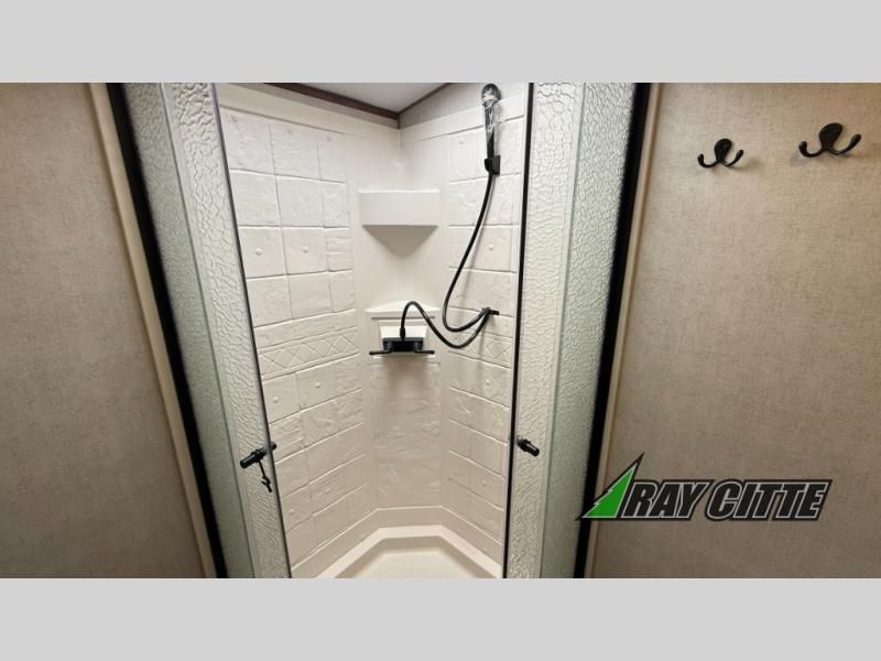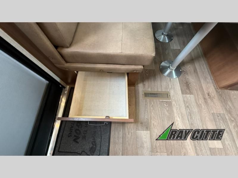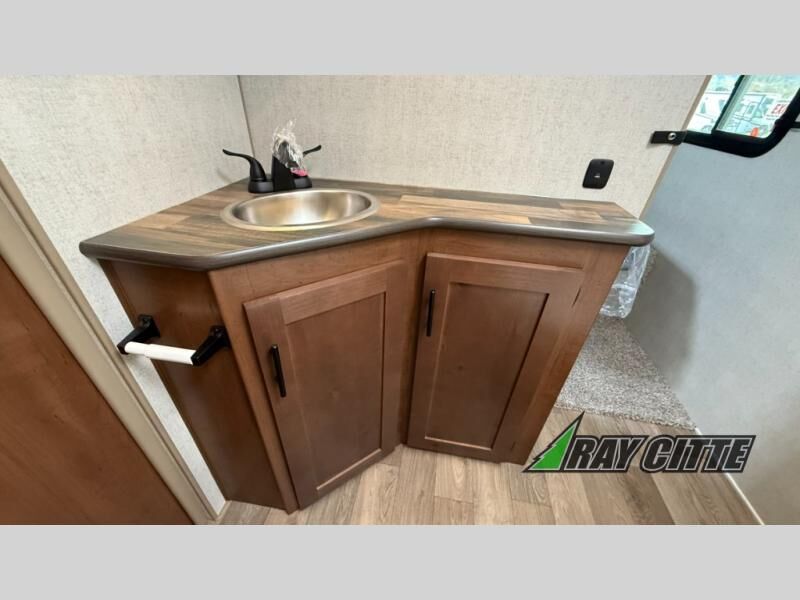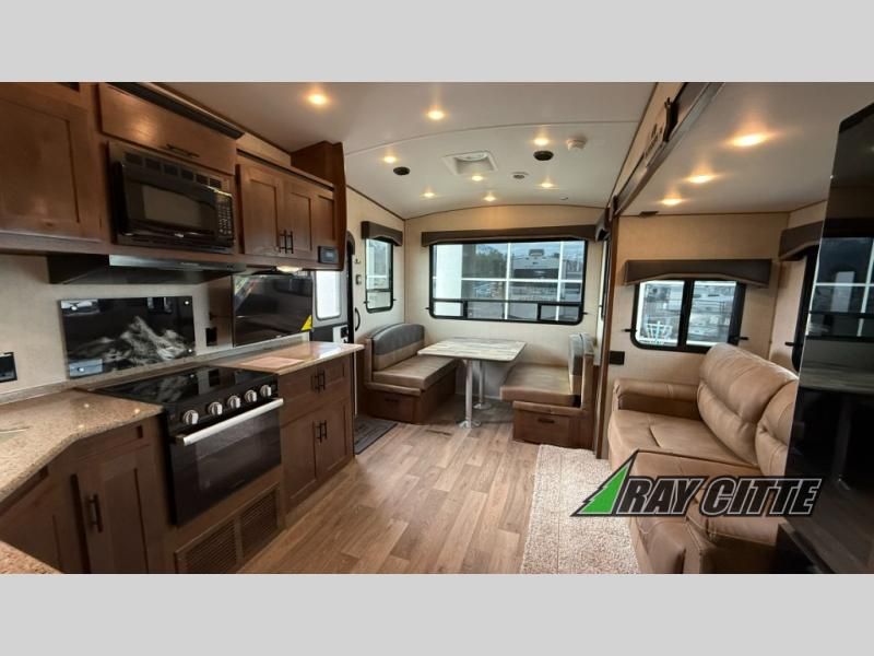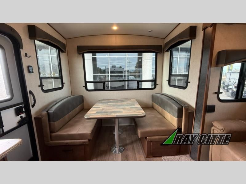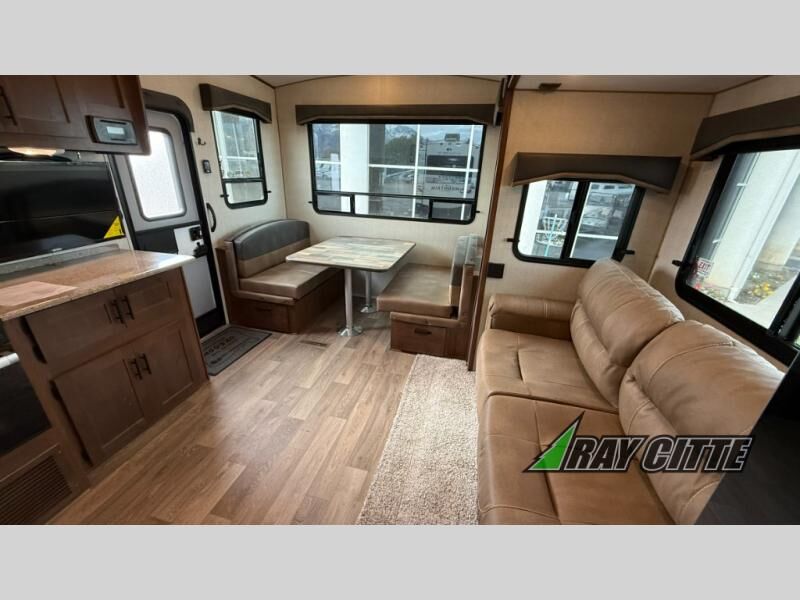 Enjoy time at the campground in this spacious travel trailer. There is a sleeper sofa slide out that will provide more floor space, along with sleeping space for guests! Once the chef makes dinner in the full kitchen, you can dine at the 45" x 84" mountain dinette. A full bath with a radius shower will let you clean up each day, and the front private bedroom will make you feel right at home. There is also a wardrobe slide here to give you additional storage and floor space!