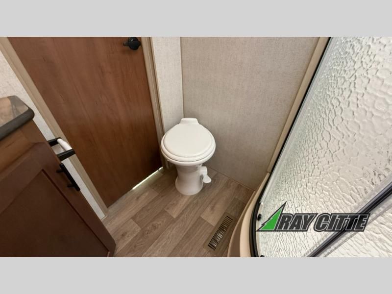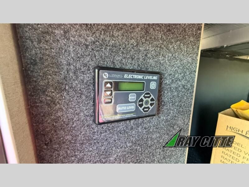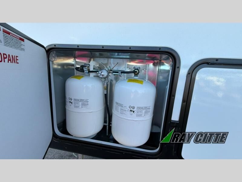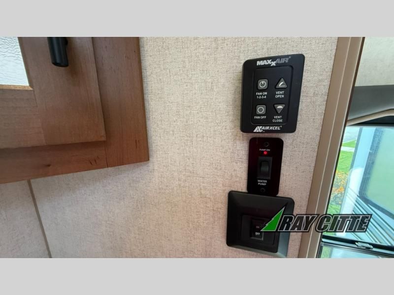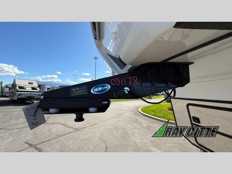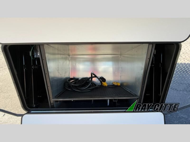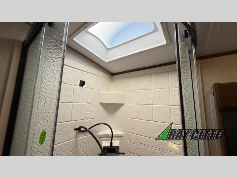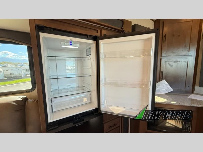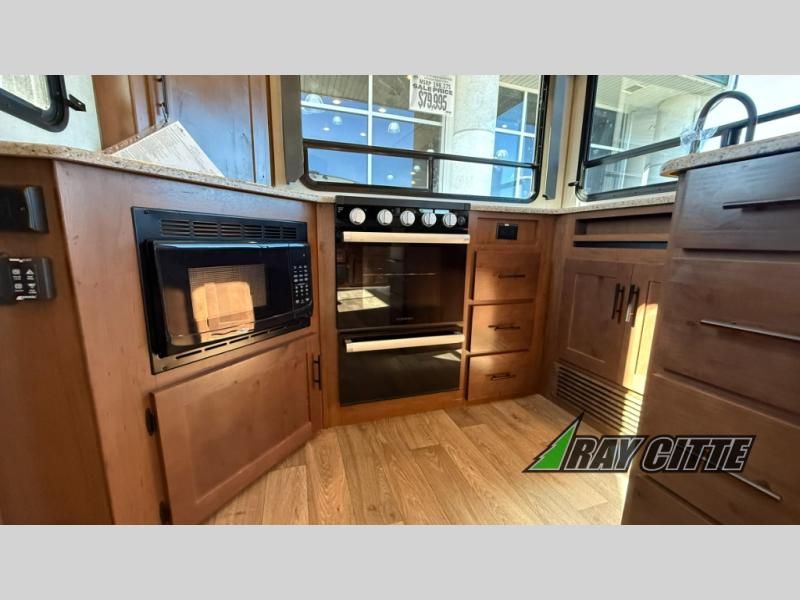 The cook will love this rear kitchen with the views out of the window and the U-shaped counter space to work from, plus having full amenities to make any type of meal. The pantry and refrigerator are next to the residential sofa within a slide out providing more interior floor space and a quick way to grab a snack before using the sofa built-in recliners to relax. There is another slide in this area with a mountain dinette, and both furnishings can provide extra sleeping space when needed. The entertainment center includes a swing-out 50" TV so everyone will have a good view. The front bedroom offers a queen bed to sleep on after a fun day outdoors, plus a wardrobe/linen slide giving both the bedroom and bathroom more space.