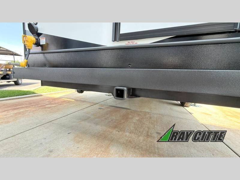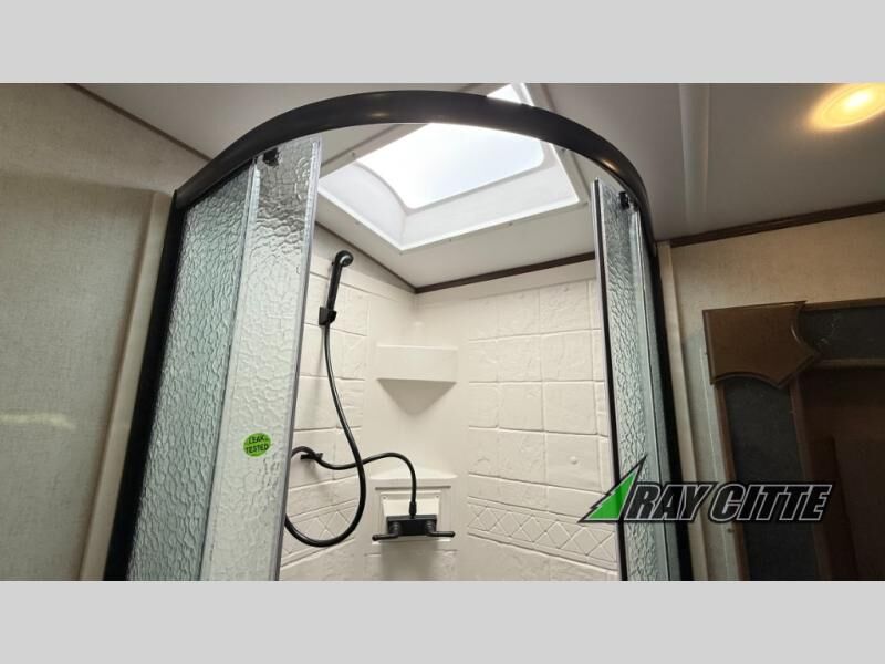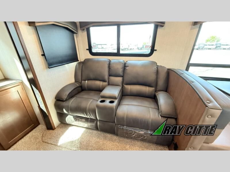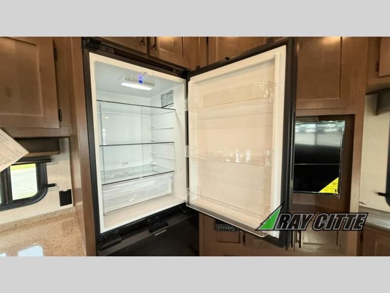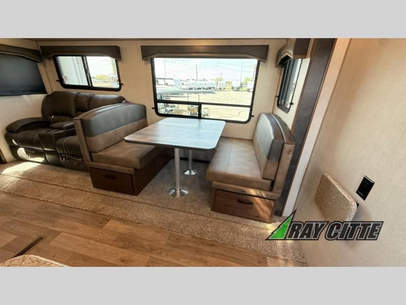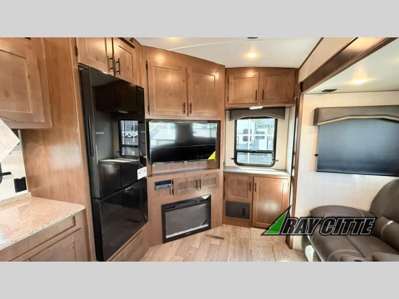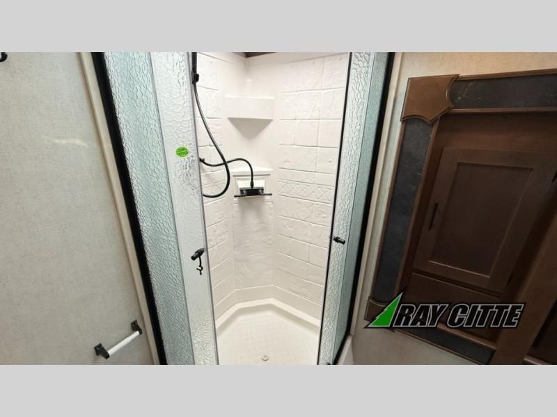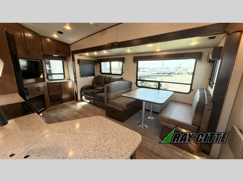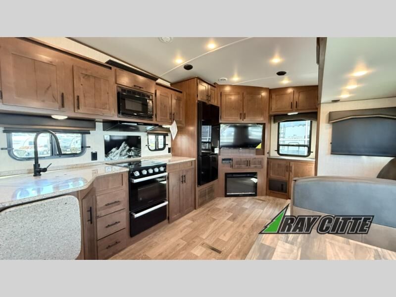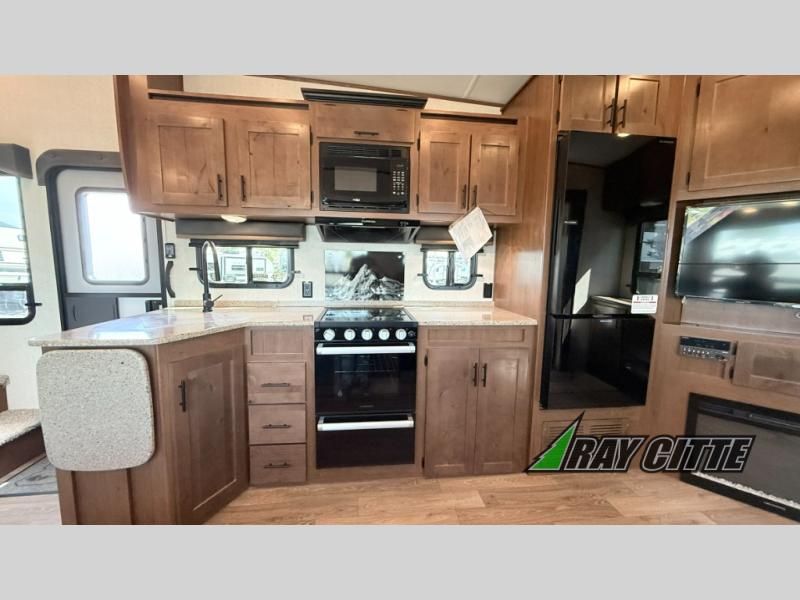 You can travel to the mountains, hilltops or the ocean with this fifth wheel hitched up to your vehicle! Once at your destination, you can easily setup the two slide outs, and the 20' power awning. Then you can relax inside while watching the swing-out 40" TV and sitting on the residential sofa with built-in recliners or the mountain dinette, both are within a large slide and both provide sleeping space for overnight guests. The kitchen is across the way and offers full amenities to make warm meals and store leftovers in the 12V refrigerator. You will find lots of storage inside as well as outside. When you are ready for bed, head to the front private bedroom after getting cleaned up in the double entry bathroom.