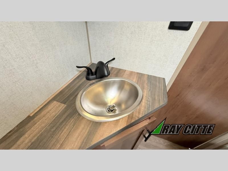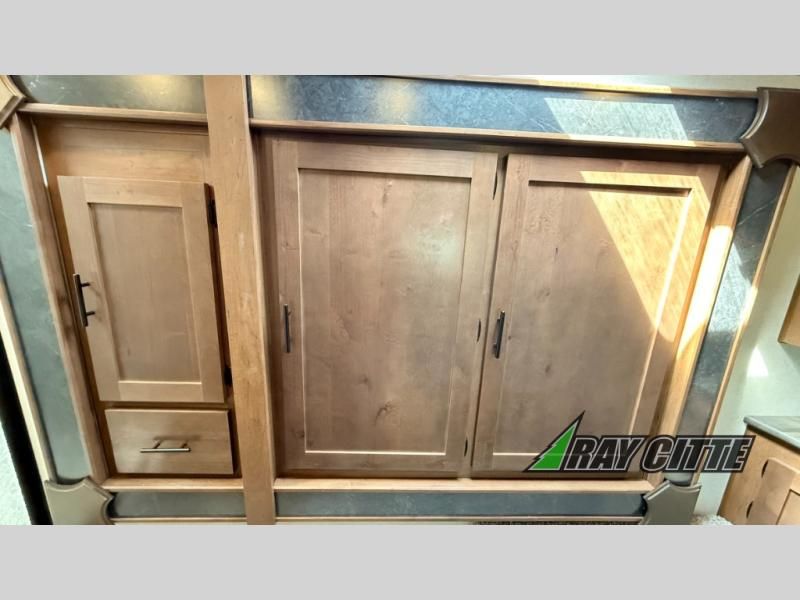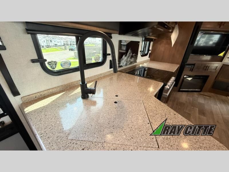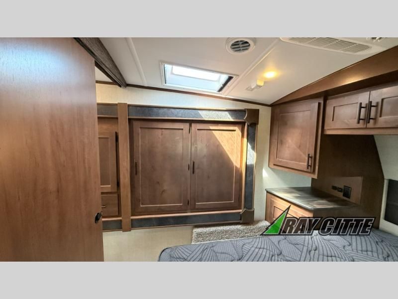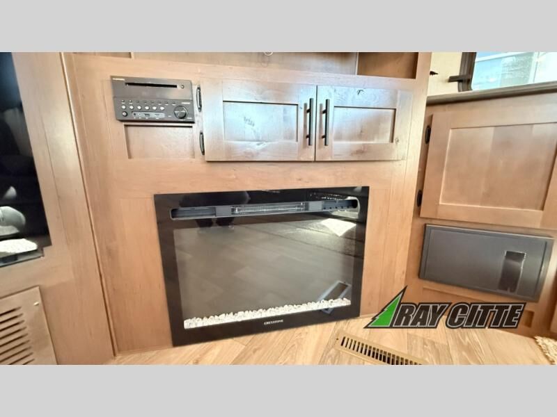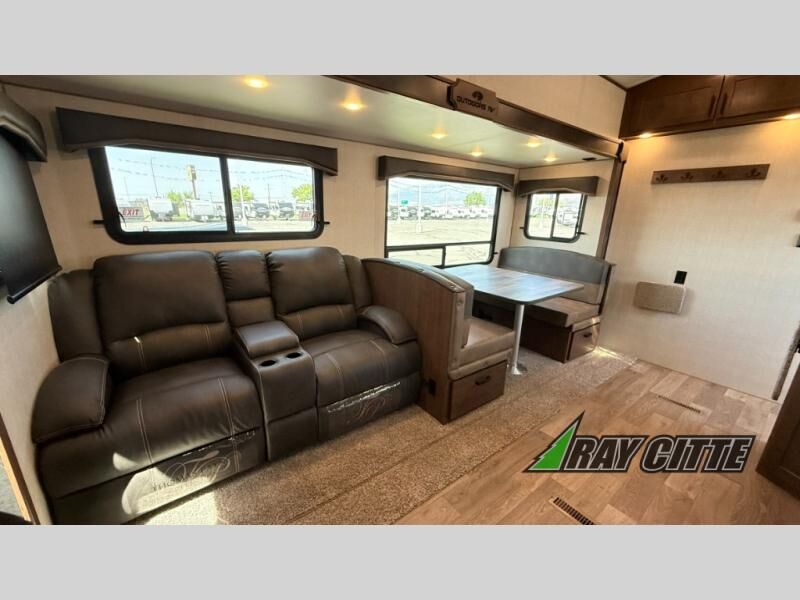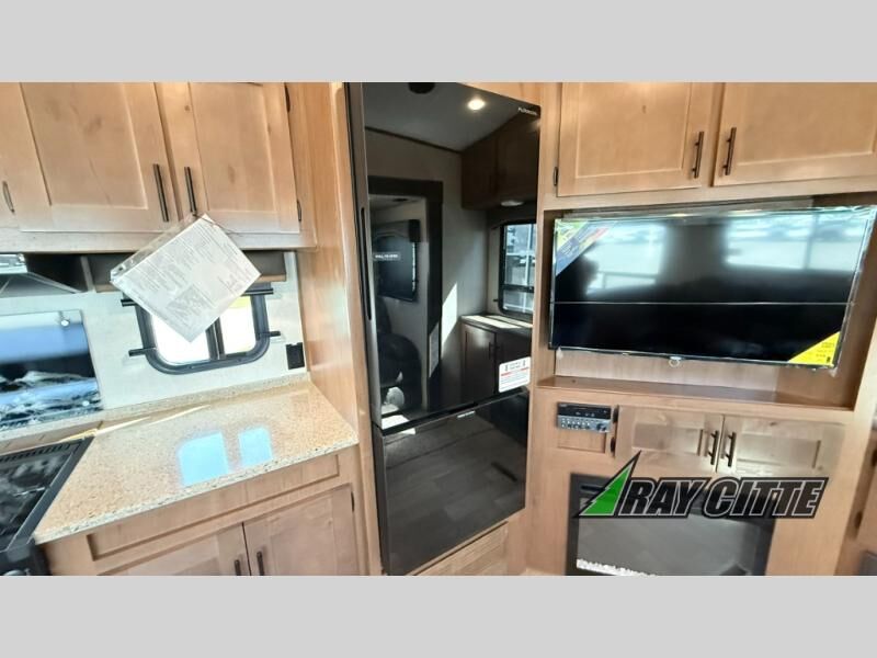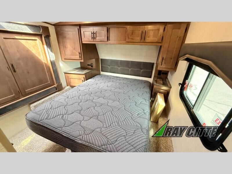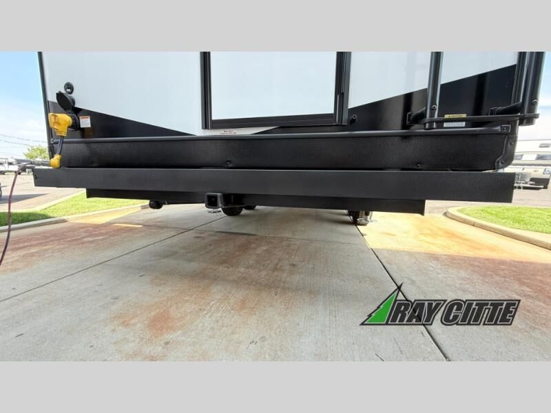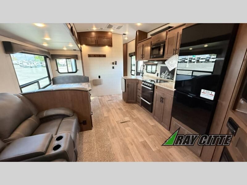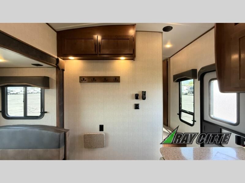 You can travel to the mountains, hilltops or the ocean with this fifth wheel hitched up to your vehicle! Once at your destination, you can easily setup the two slide outs, and the 20' power awning. Then you can relax inside while watching the swing-out 40" TV and sitting on the residential sofa with built-in recliners or the mountain dinette, both are within a large slide and both provide sleeping space for overnight guests. The kitchen is across the way and offers full amenities to make warm meals and store leftovers in the 12V refrigerator. You will find lots of storage inside as well as outside. When you are ready for bed, head to the front private bedroom after getting cleaned up in the double entry bathroom.