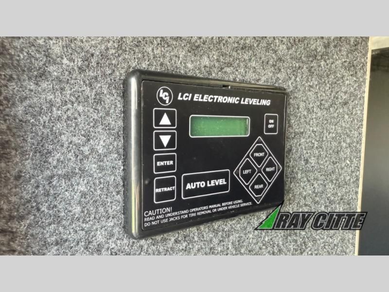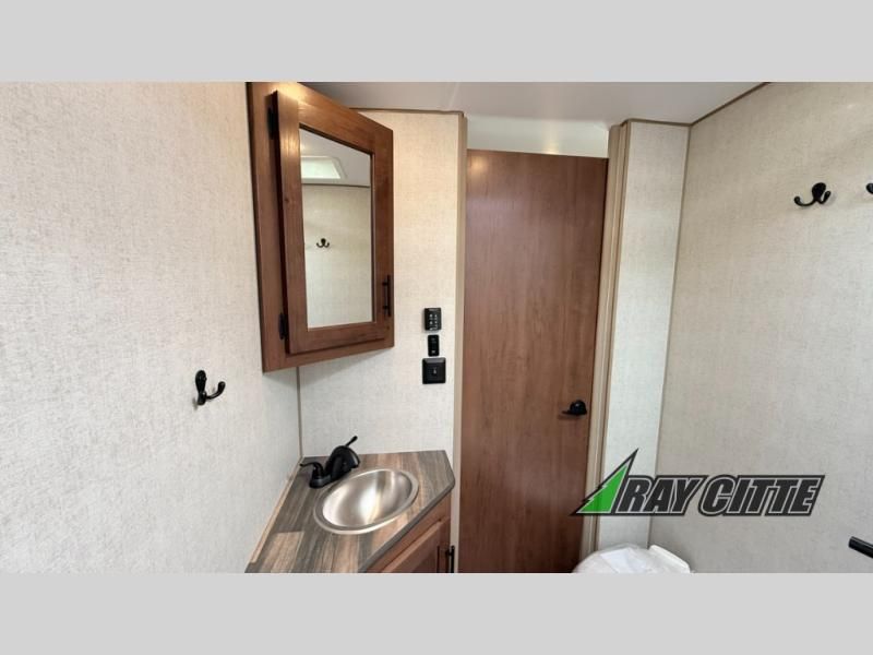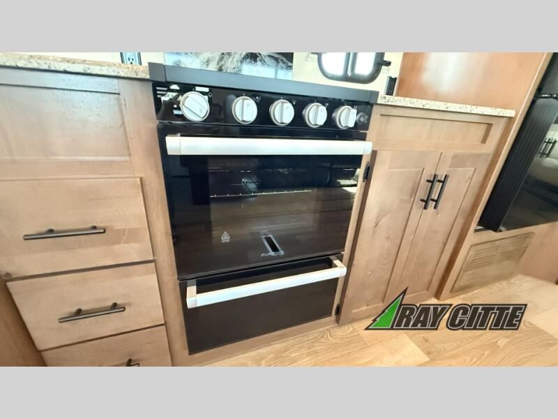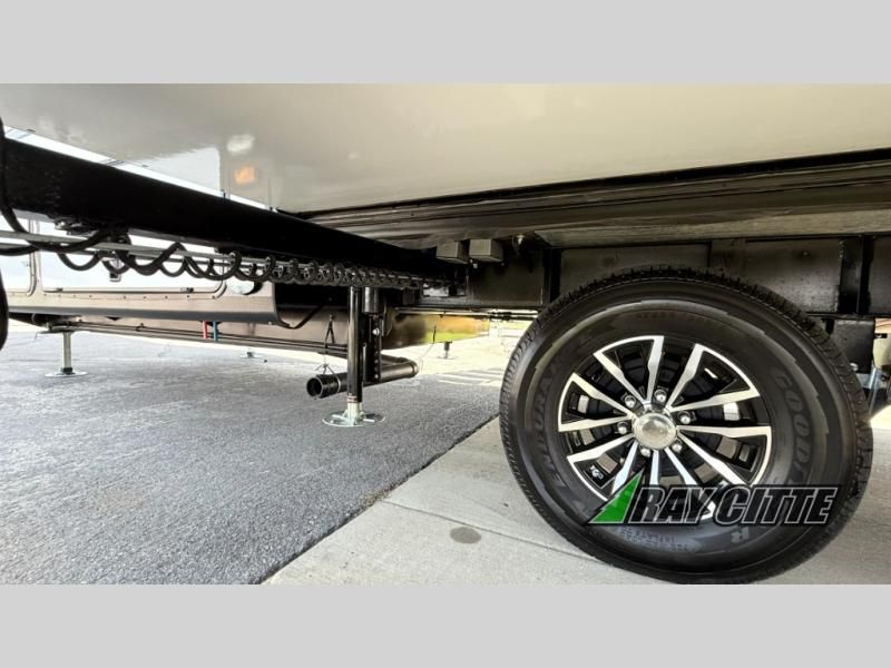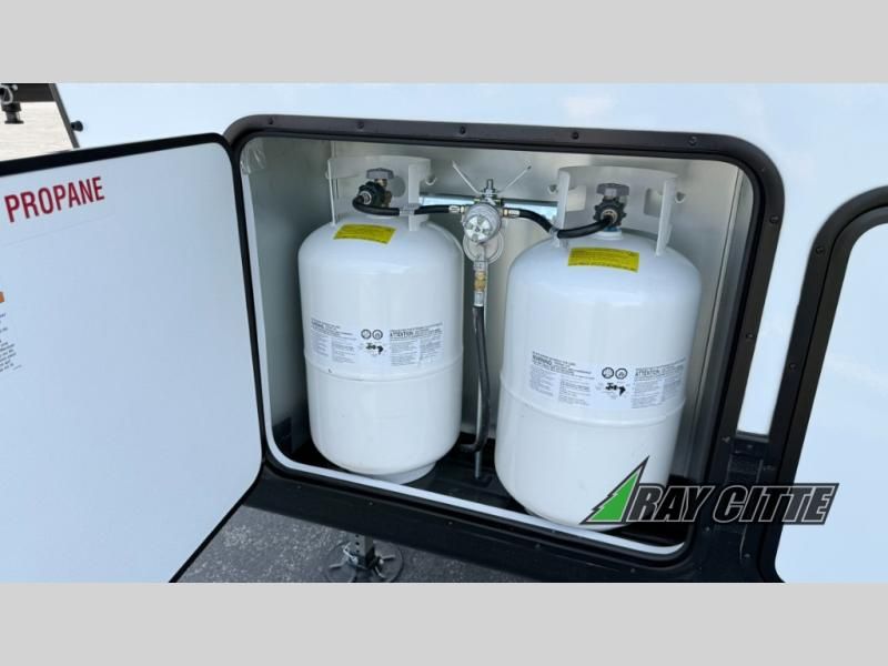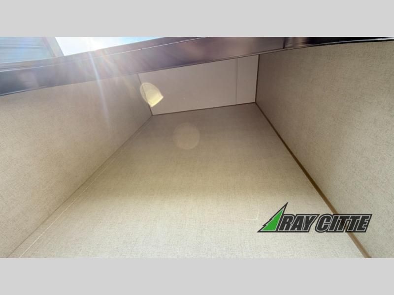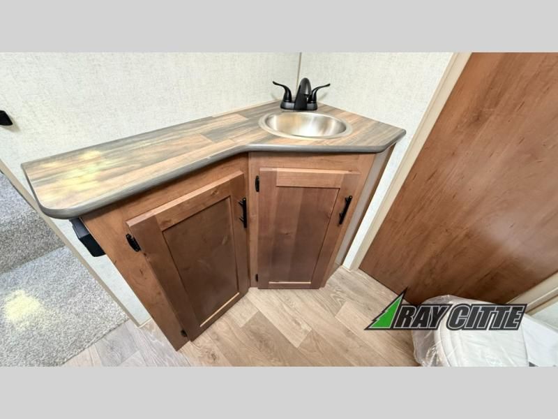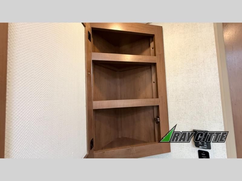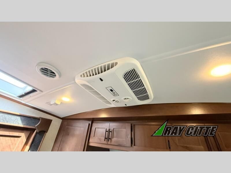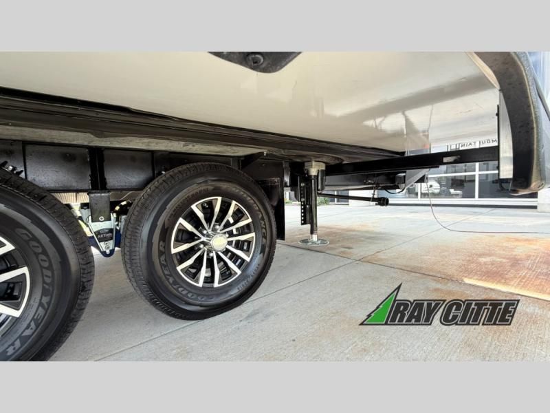 You can travel to the mountains, hilltops or the ocean with this fifth wheel hitched up to your vehicle! Once at your destination, you can easily setup the two slide outs, and the 20' power awning. Then you can relax inside while watching the swing-out 40" TV and sitting on the residential sofa with built-in recliners or the mountain dinette, both are within a large slide and both provide sleeping space for overnight guests. The kitchen is across the way and offers full amenities to make warm meals and store leftovers in the 12V refrigerator. You will find lots of storage inside as well as outside. When you are ready for bed, head to the front private bedroom after getting cleaned up in the double entry bathroom.