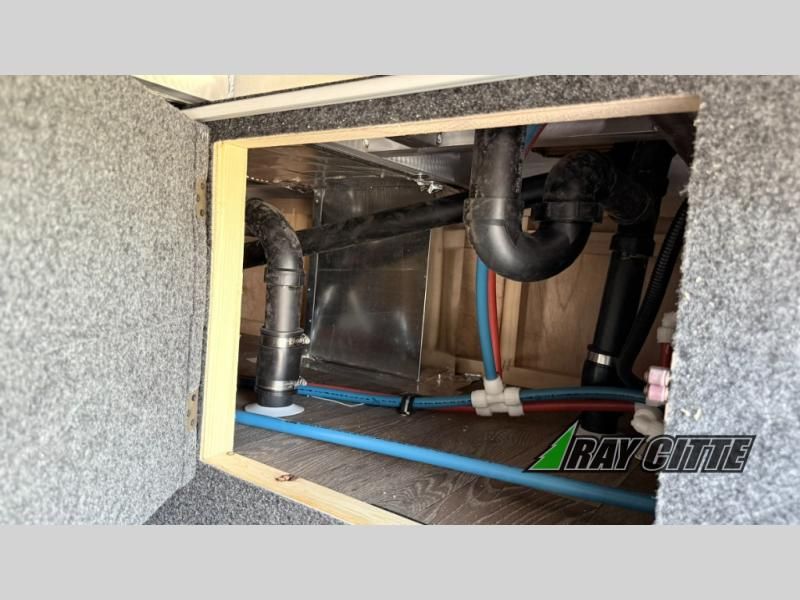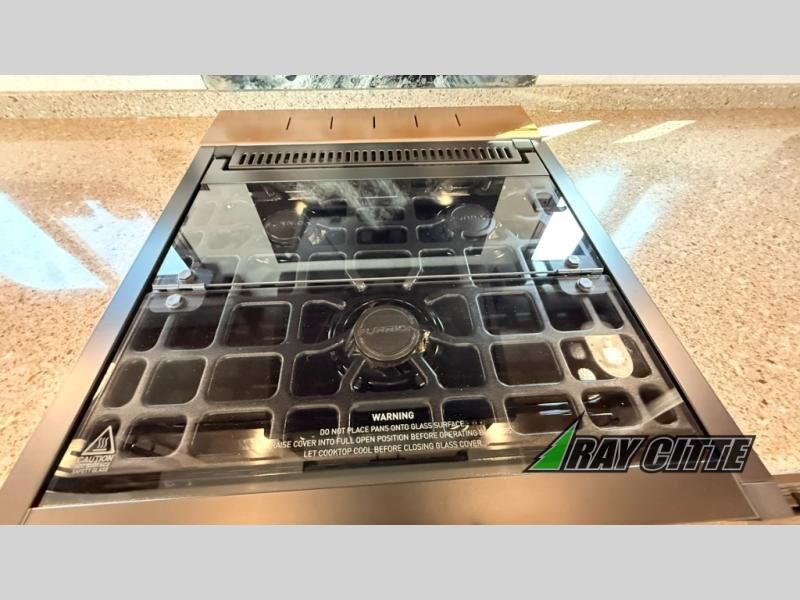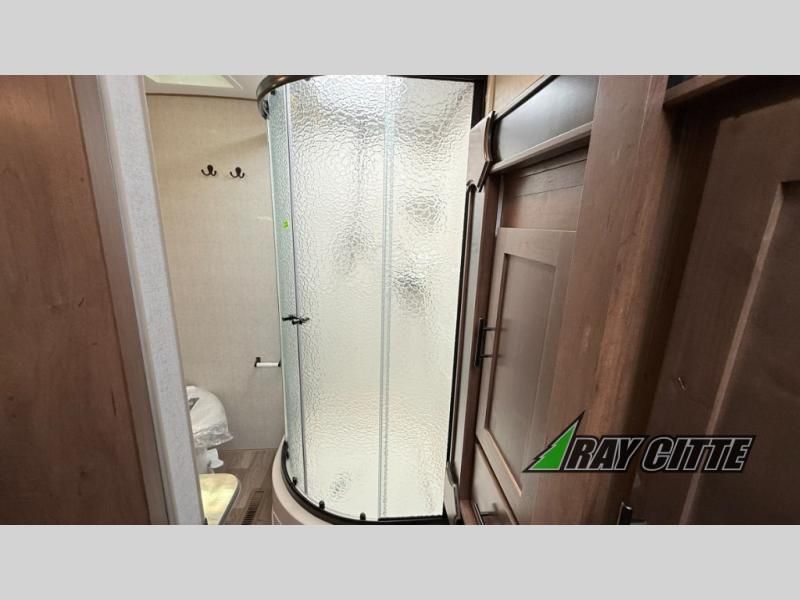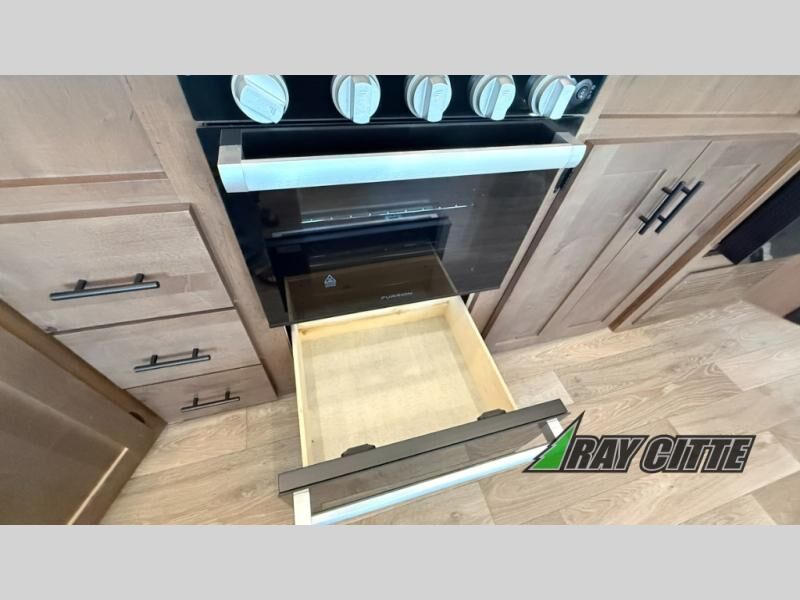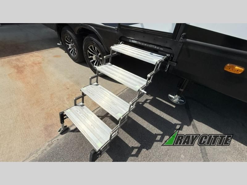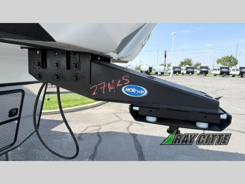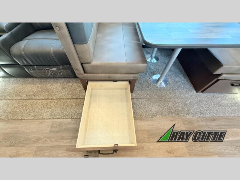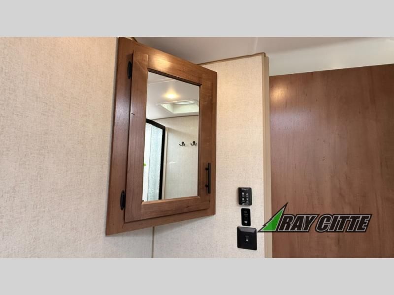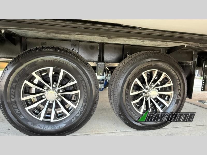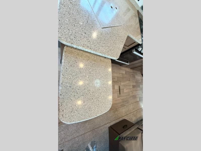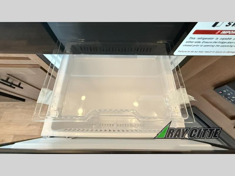 You can travel to the mountains, hilltops or the ocean with this fifth wheel hitched up to your vehicle! Once at your destination, you can easily setup the two slide outs, and the 20' power awning. Then you can relax inside while watching the swing-out 40" TV and sitting on the residential sofa with built-in recliners or the mountain dinette, both are within a large slide and both provide sleeping space for overnight guests. The kitchen is across the way and offers full amenities to make warm meals and store leftovers in the 12V refrigerator. You will find lots of storage inside as well as outside. When you are ready for bed, head to the front private bedroom after getting cleaned up in the double entry bathroom.