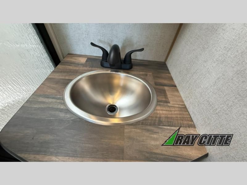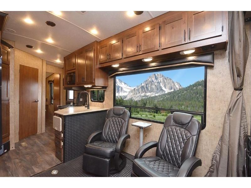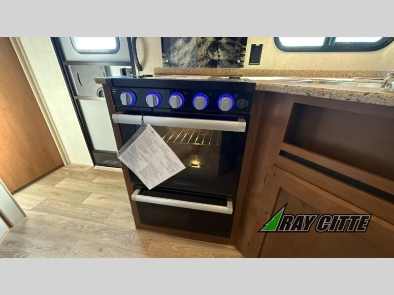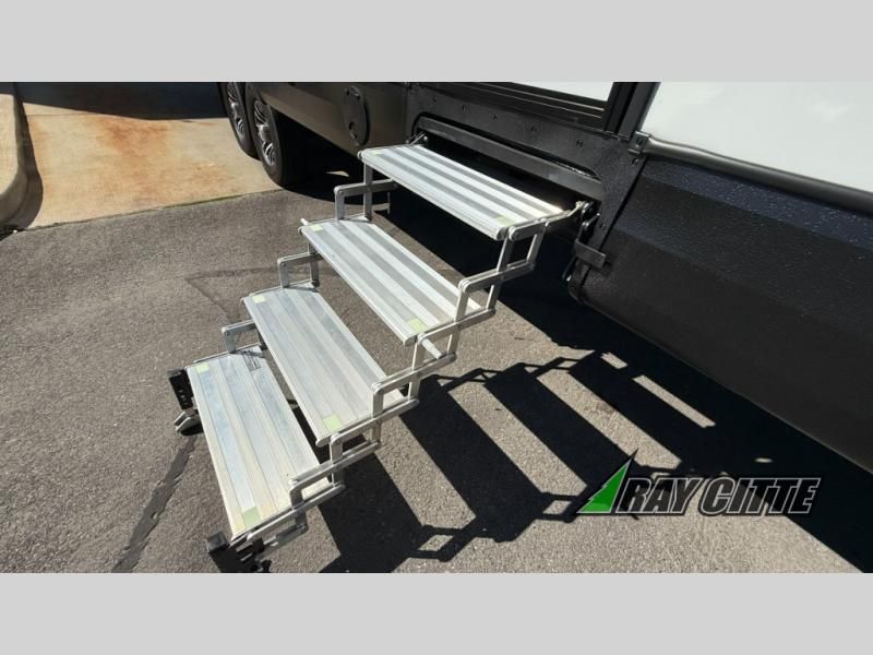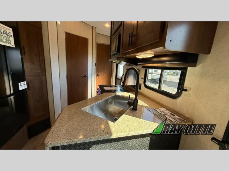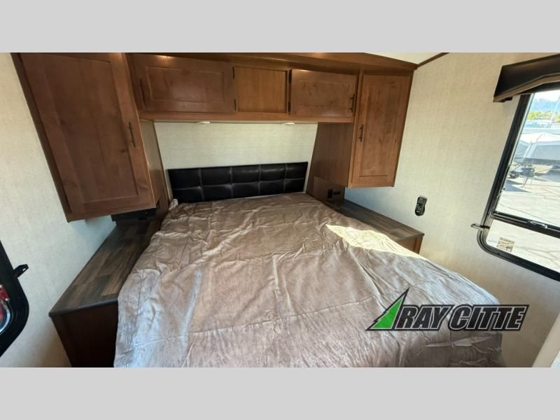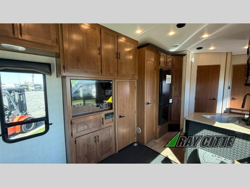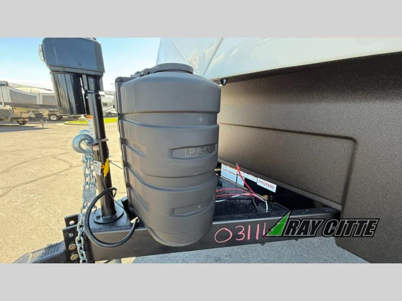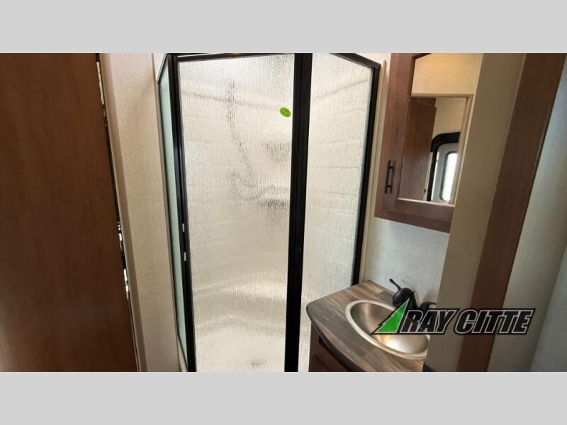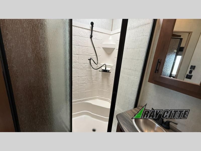 The kids will be begging you to go camping with this toy hauler! They can sleep on the loft queen bed in the 13' 4" garage area above dual opposing sofas with a table in between, and you can sleep comfortably in the front private bedroom with the queen bed. The bedroom also has an entrance into the dual entry bathroom which has a neo-angled shower with a skylight above for added natural lighting as you get ready. Keep everyone's bellies full with the fully equipped kitchen and entertained with the entertainment center that has a 32" swing out TV. Across from the entertainment center are two recliners to relax in each night too. The in-floor tool box makes life easier and the high pressure exterior spray washer is handy after trail riding through the mud!