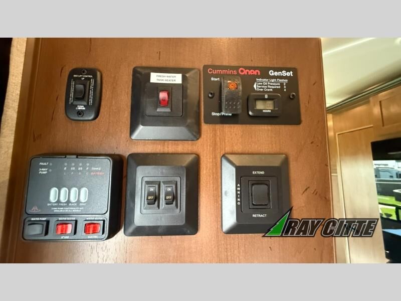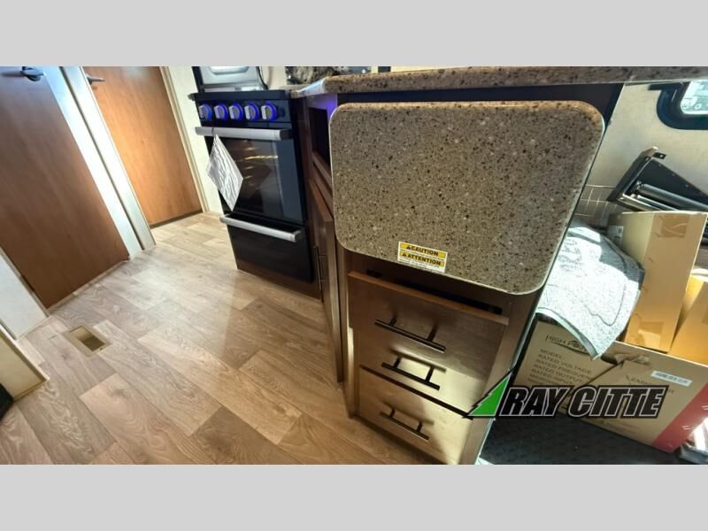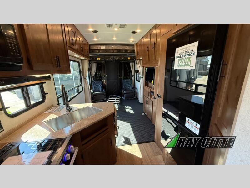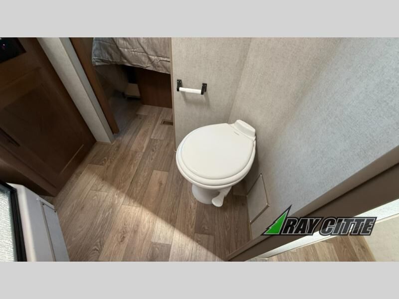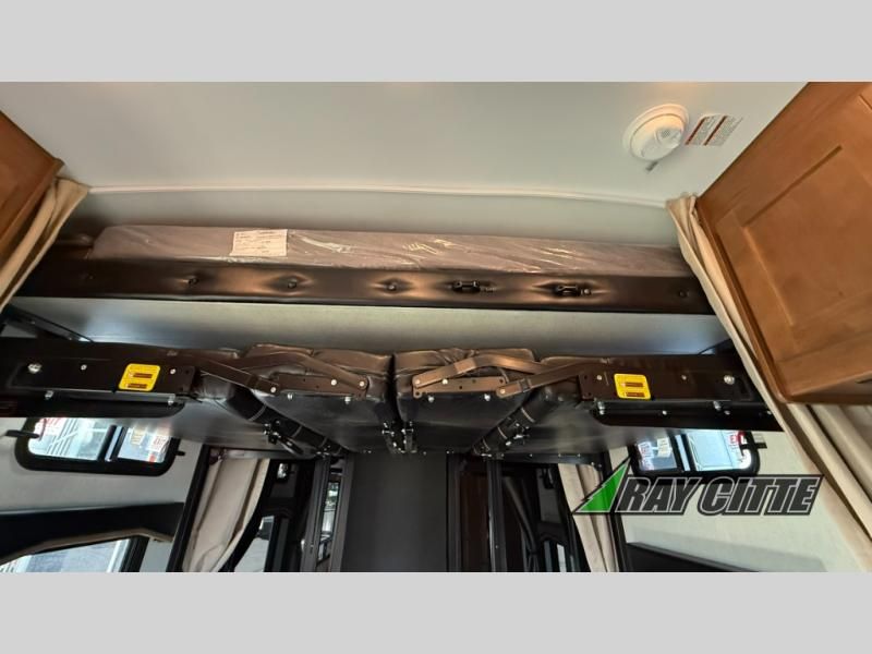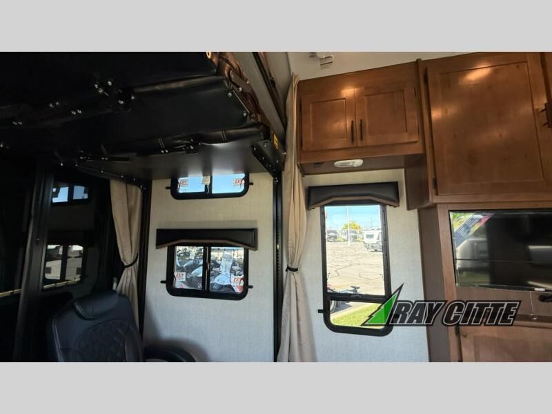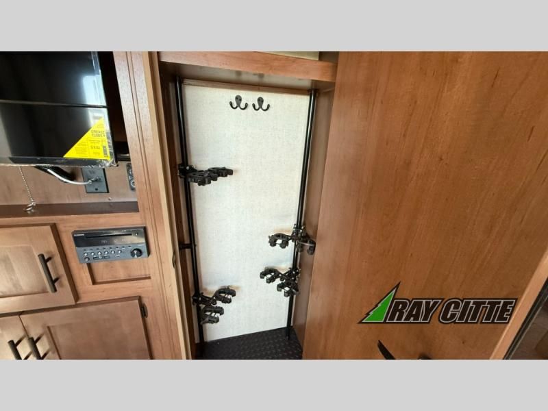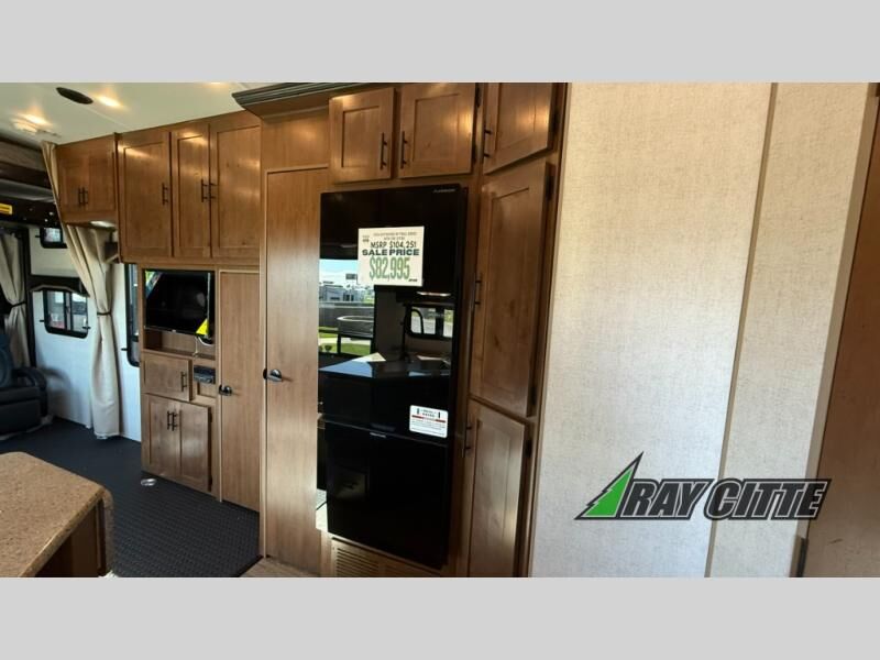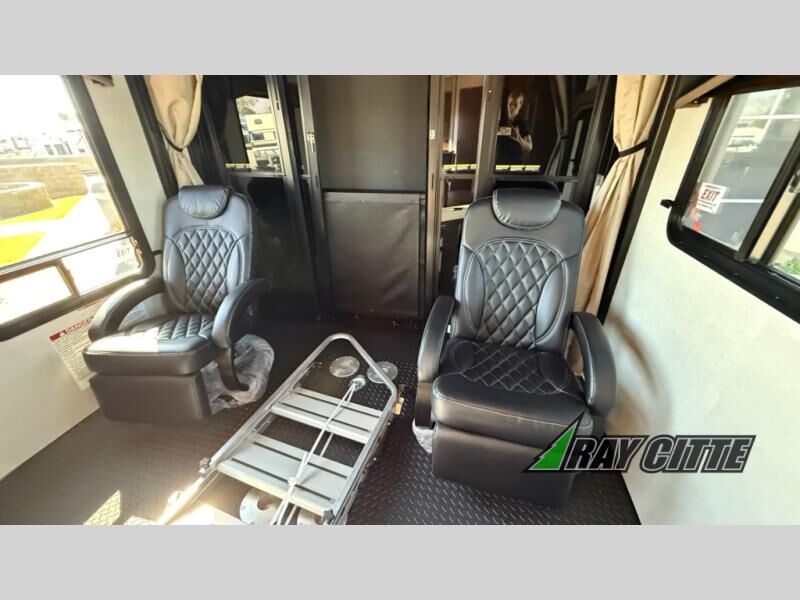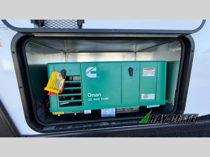 The kids will be begging you to go camping with this toy hauler! They can sleep on the loft queen bed in the 13' 4" garage area above dual opposing sofas with a table in between, and you can sleep comfortably in the front private bedroom with the queen bed. The bedroom also has an entrance into the dual entry bathroom which has a neo-angled shower with a skylight above for added natural lighting as you get ready. Keep everyone's bellies full with the fully equipped kitchen and entertained with the entertainment center that has a 32" swing out TV. Across from the entertainment center are two recliners to relax in each night too. The in-floor tool box makes life easier and the high pressure exterior spray washer is handy after trail riding through the mud!