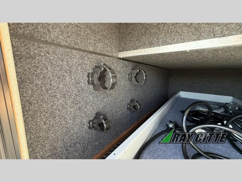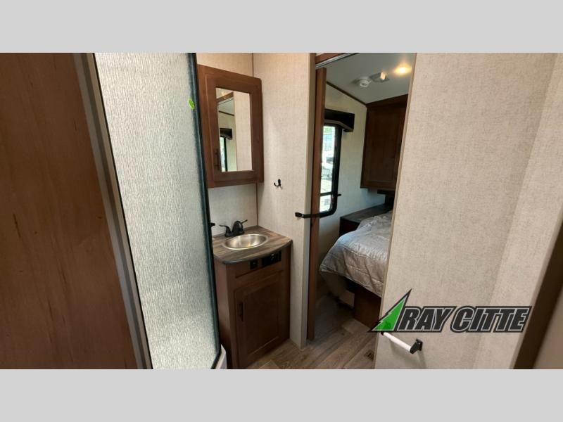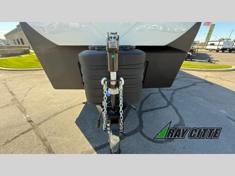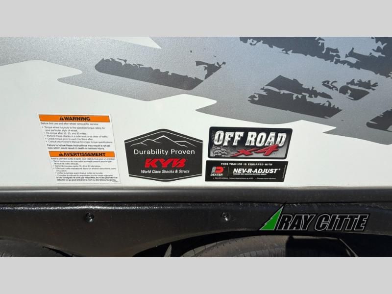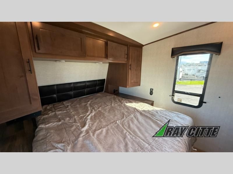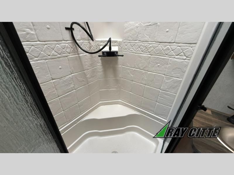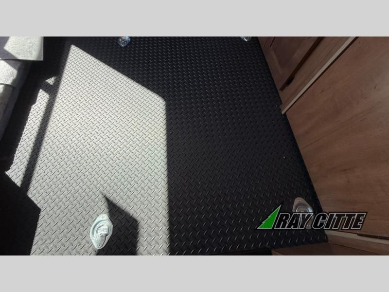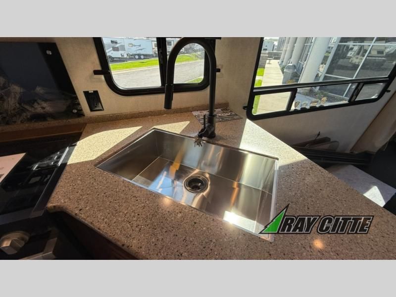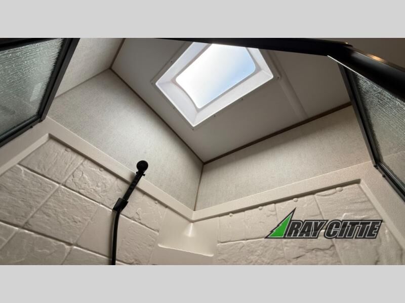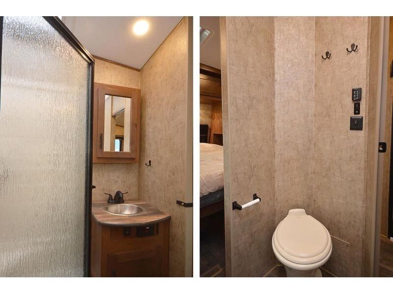 The kids will be begging you to go camping with this toy hauler! They can sleep on the loft queen bed in the 13' 4" garage area above dual opposing sofas with a table in between, and you can sleep comfortably in the front private bedroom with the queen bed. The bedroom also has an entrance into the dual entry bathroom which has a neo-angled shower with a skylight above for added natural lighting as you get ready. Keep everyone's bellies full with the fully equipped kitchen and entertained with the entertainment center that has a 32" swing out TV. Across from the entertainment center are two recliners to relax in each night too. The in-floor tool box makes life easier and the high pressure exterior spray washer is handy after trail riding through the mud!