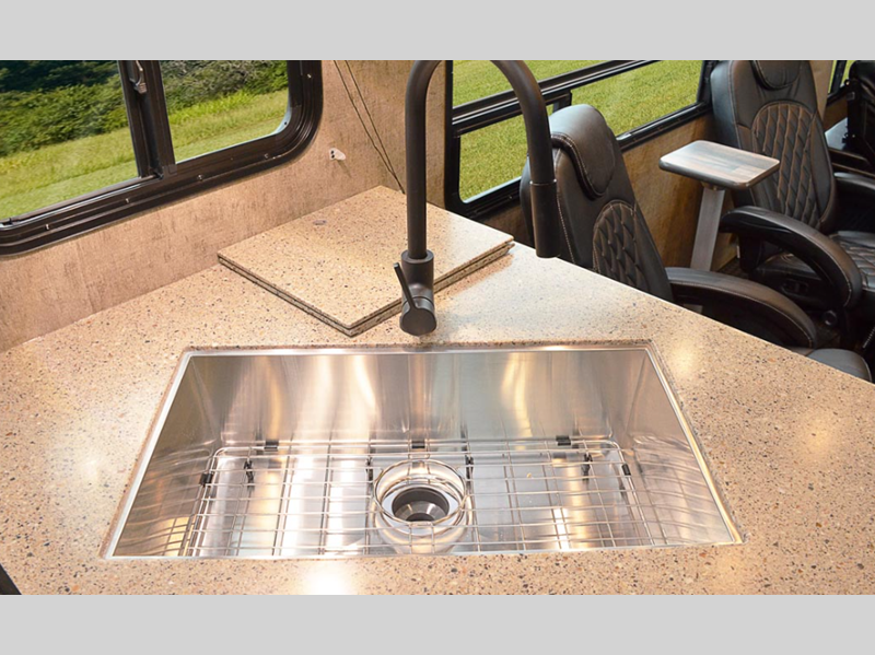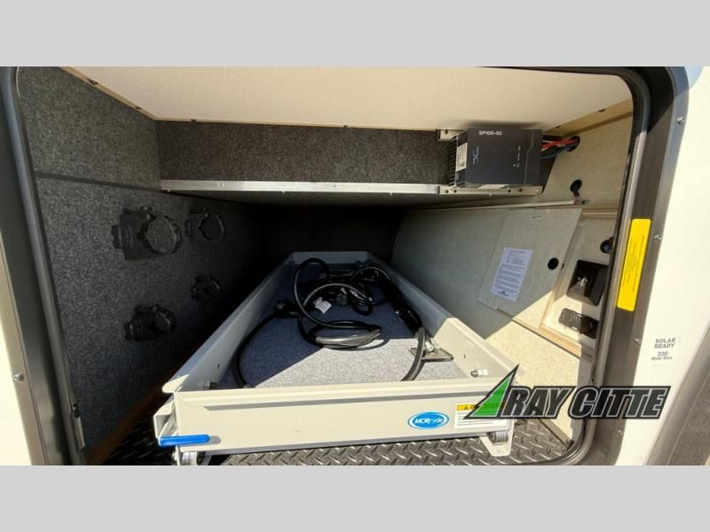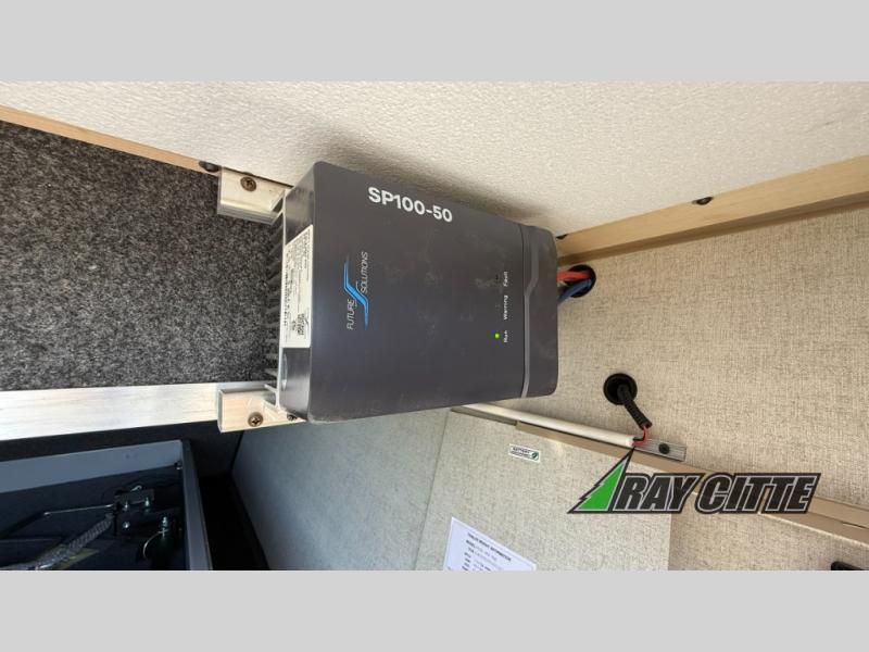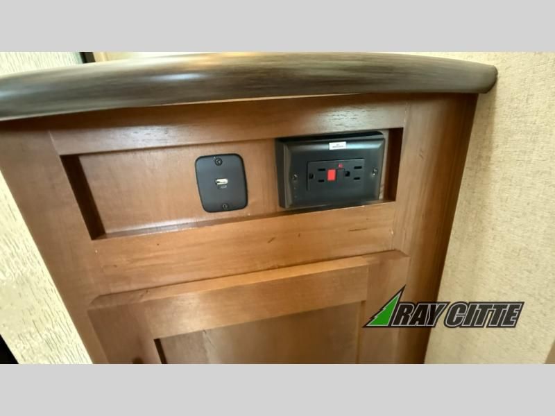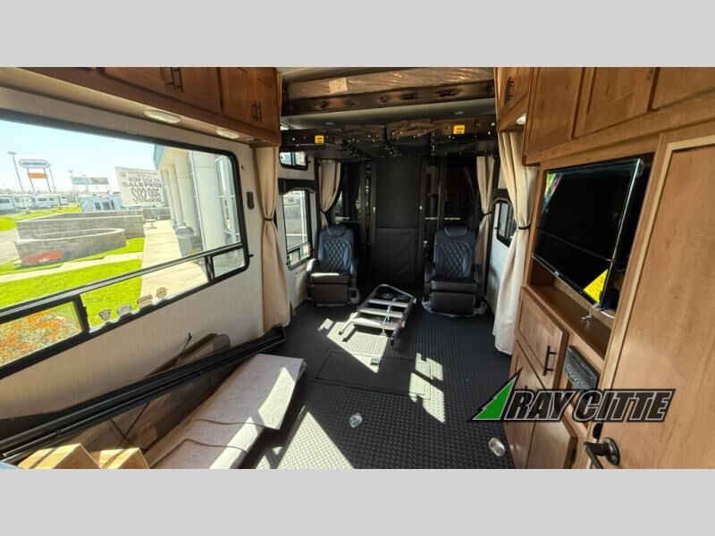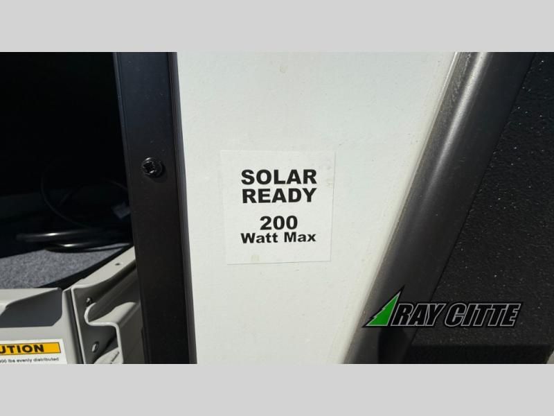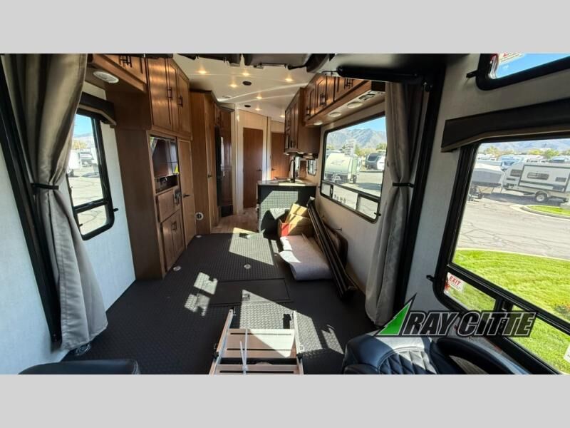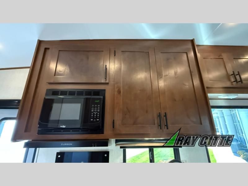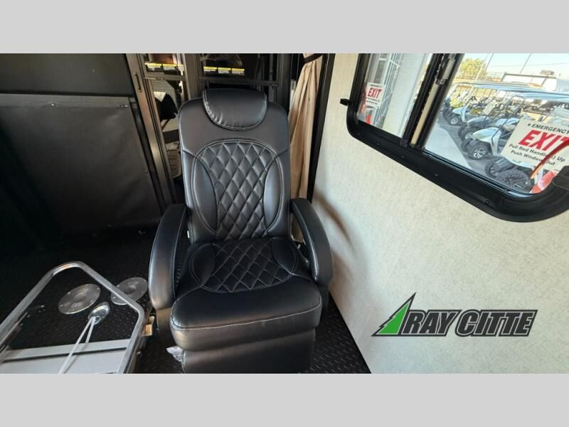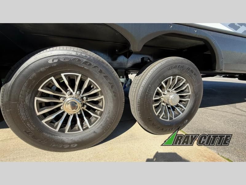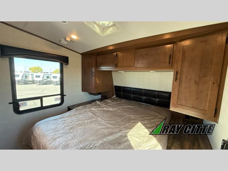 The kids will be begging you to go camping with this toy hauler! They can sleep on the loft queen bed in the 13' 4" garage area above dual opposing sofas with a table in between, and you can sleep comfortably in the front private bedroom with the queen bed. The bedroom also has an entrance into the dual entry bathroom which has a neo-angled shower with a skylight above for added natural lighting as you get ready. Keep everyone's bellies full with the fully equipped kitchen and entertained with the entertainment center that has a 32" swing out TV. Across from the entertainment center are two recliners to relax in each night too. The in-floor tool box makes life easier and the high pressure exterior spray washer is handy after trail riding through the mud!
