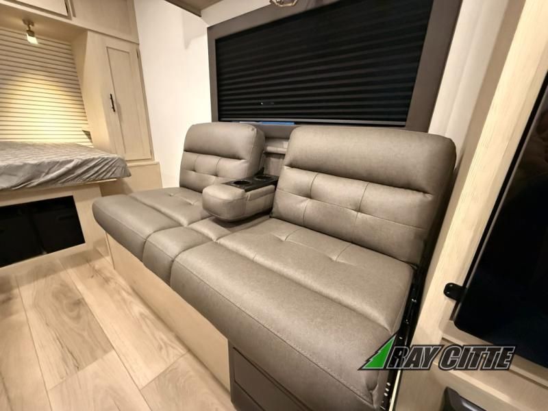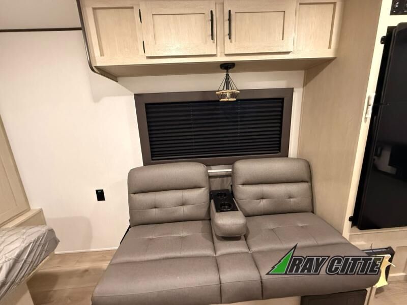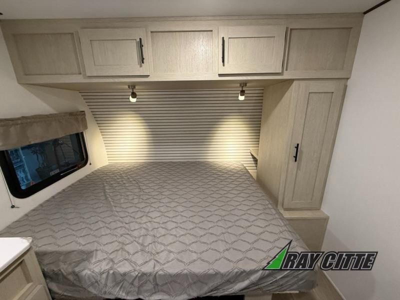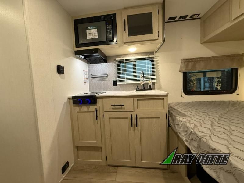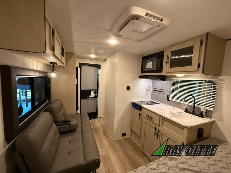 This trailer is perfect for couples or weekend trips to the lake with your buddy. There is a front queen bed with an overhead cabinet, a wardrobe, plus a bed shelf to keep valuables close by, and the sofa will provide seating and sleeping space for guests. There is a private bathroom with a toilet and a shower so you won't have to use the camp's facilities in the middle of the night. You will love having a two burner cooktop and microwave oven to cook meals each day, plus there is a 4.5 cu. ft. refrigerator for cold items!
