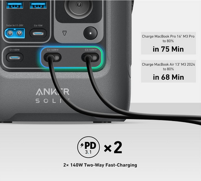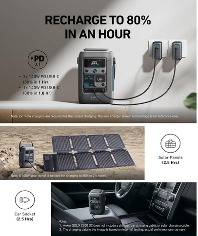 Massive Power on the Go: Take portable power anywhere and deliver 300W and 288Wh to your devices. Fast charge with two 140W two-way USB-C ports. LiFePO4 battery with a 3-year guarantee: featuring LiFePO4 batteries, smart temperature control, and impact-resistant design ensures this power station lasts for years, providing reliable and durable performance in any situation. 7 Device Charging Ports: Power all your tech with versatile ports, including 1× car socket (120W), 2× USB-C (140W), 1× USB-C (100W), 1× USB-C (15W), and 2× USB-A (12W). Go Anywhere Design: Embrace full portability with a 30% smaller design than similar power stations. Attach the strap (sold separately) for more convenience. Solar-Powered Escapes: When your journey needs endless charging, do so seamlessly and sustainably with a 100W solar panel. We recommend 100W or 60W Anker Solar Panel. This power station is not compatible with Anker SOLIX PS30 (or other 5V~3A USB-C panels), PS200, PS400. Your Choice of Recharging: Fast Recharge to 80% in an hour with the dual PD 3.1 USB-C port, or use solar panels or your car. Stay charged, no matter where you are. What is in the Box: Anker SOLIX C300X DC Portable Power Station, 60cm 140W USB-C to C charging cable, Safety Manual, and Warranty Info Manufacturer Anker