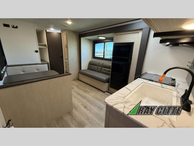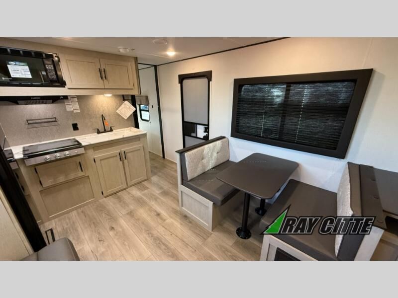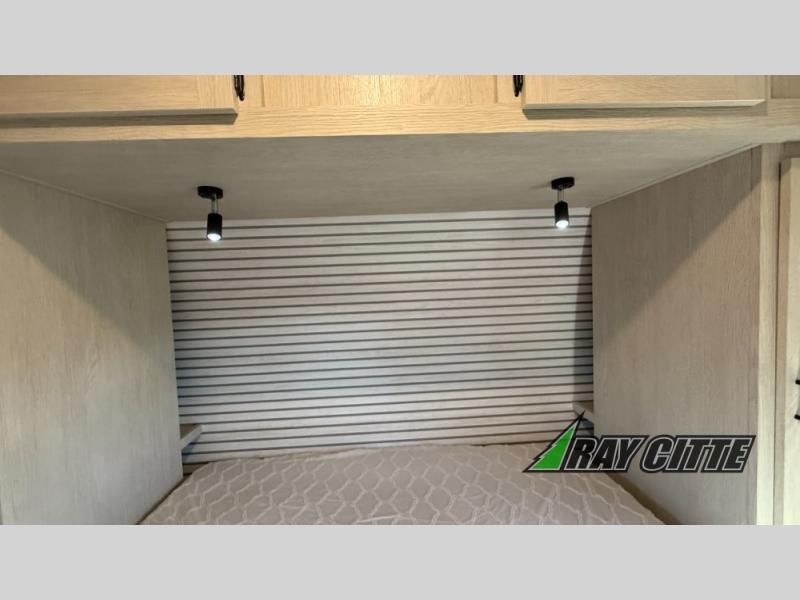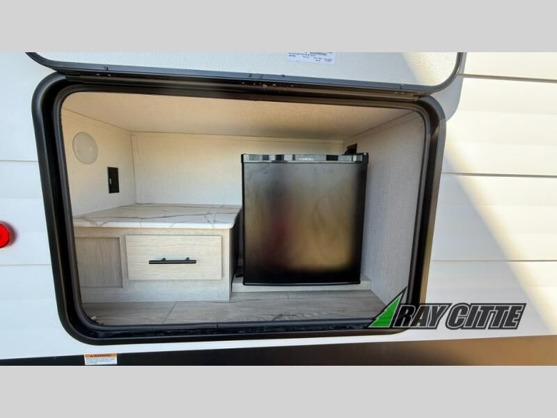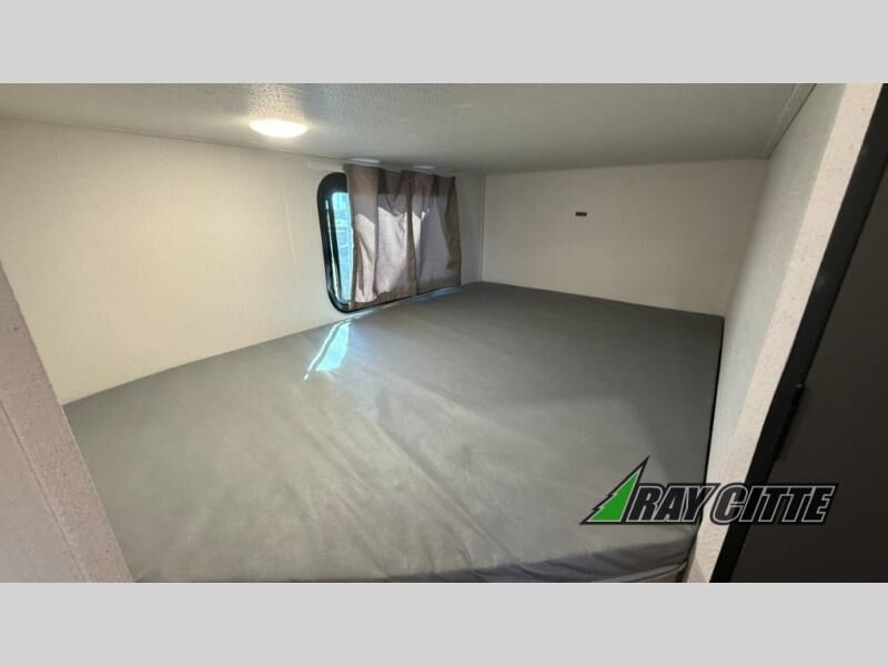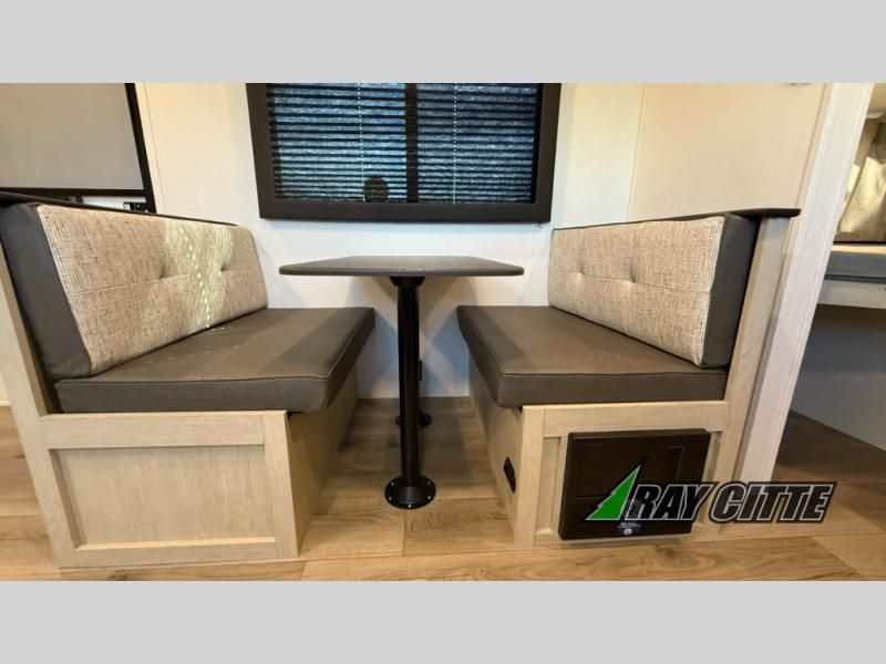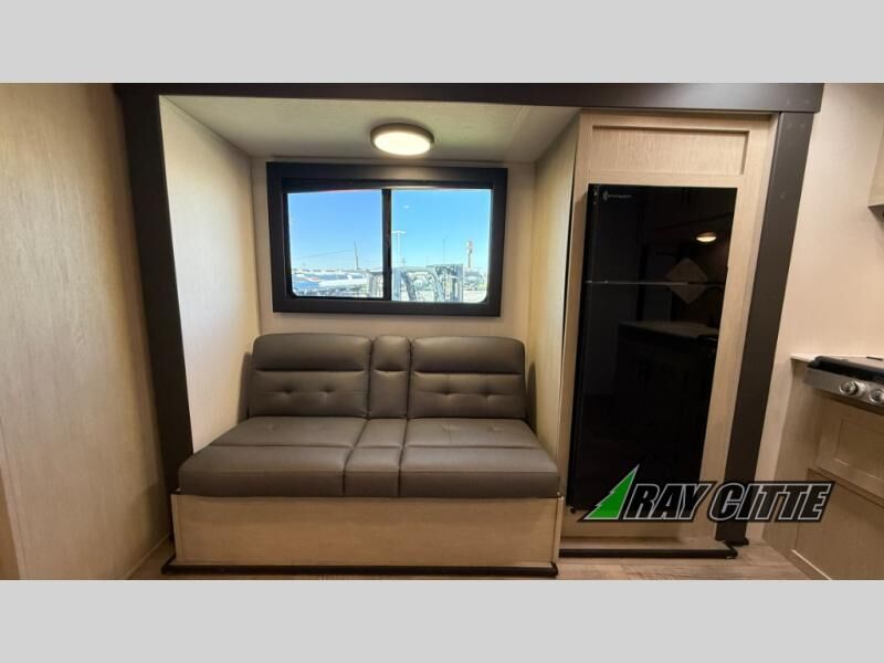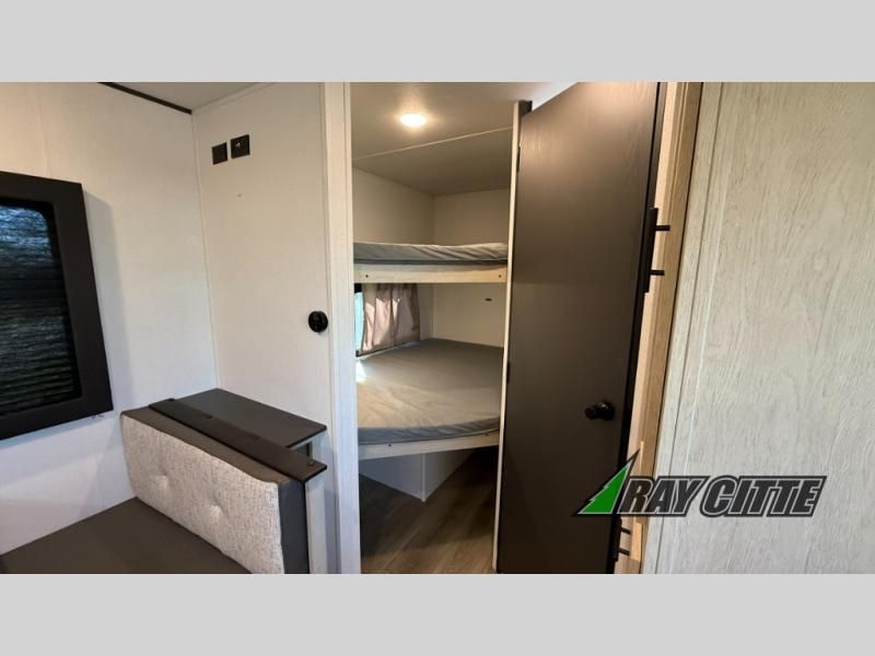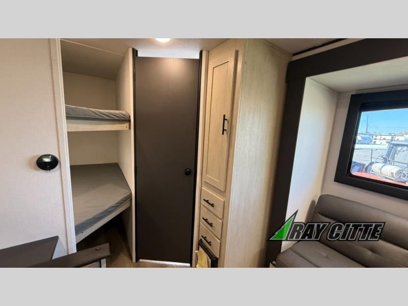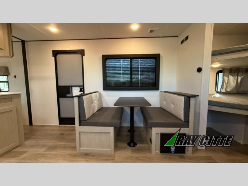 Your kids will love this travel trailer's double-size bunks that provide a cozy spot for children or guests, while the full bathroom offers convenience and comfort. The booth dinette is perfect for sharing meals with family or friends, and the pantry keeps your essentials organized. An entertainment center and sofa create a relaxing atmosphere to enjoy your favorite shows, and a refrigerator keeps your favorite snacks and drinks fresh. The front bedroom features a spacious queen bed, a dual wardrobe, and shelves for ample storage. On the exterior, the pass-through storage provides additional space for gear or equipment, and an outside kitchen offers the perfect spot for alfresco cooking and entertaining.