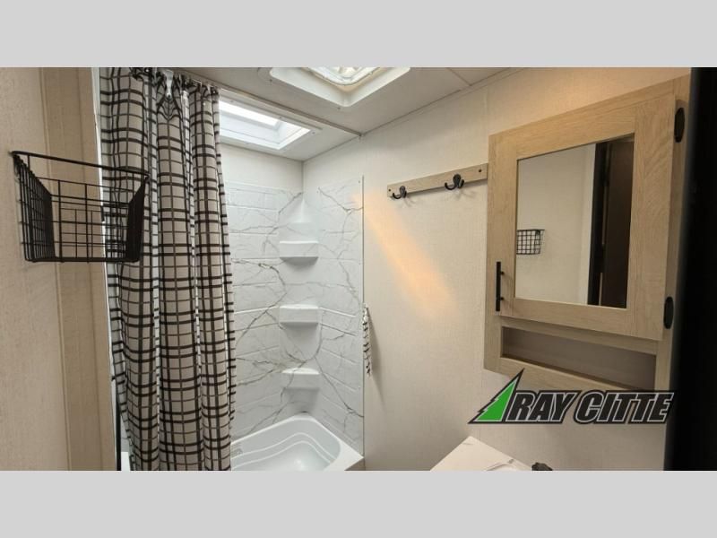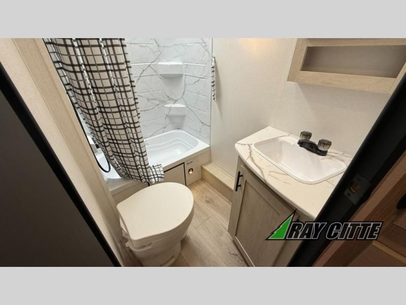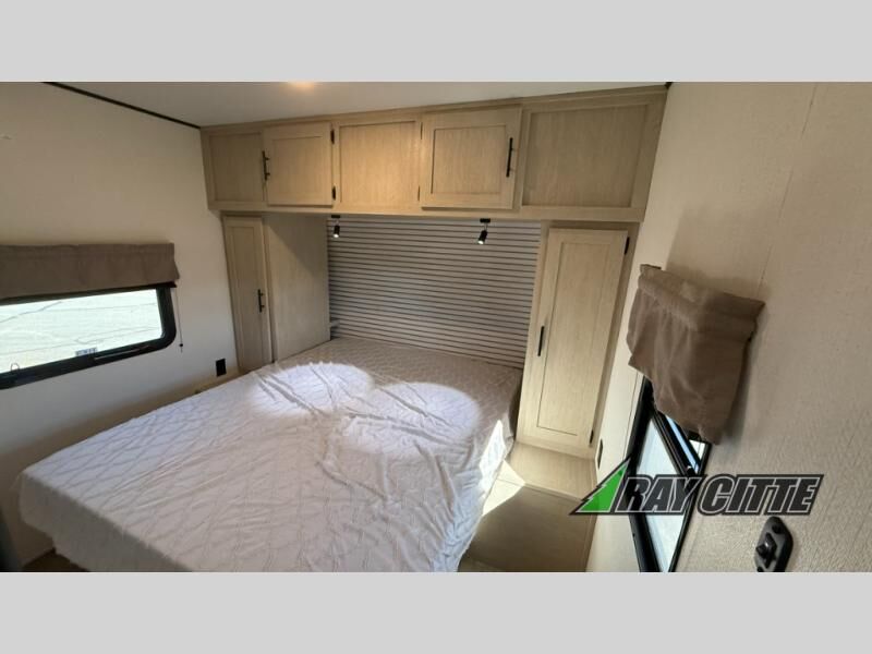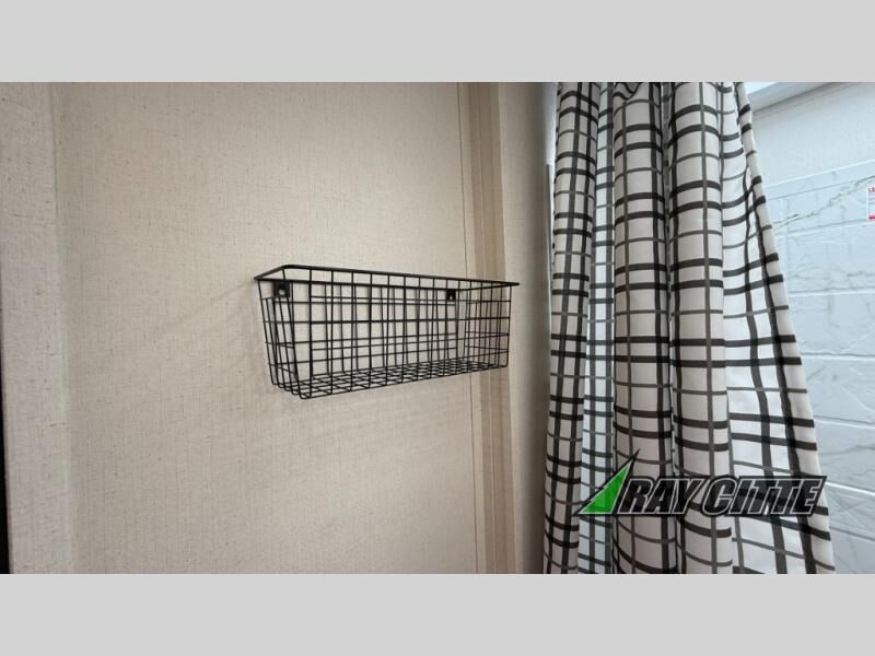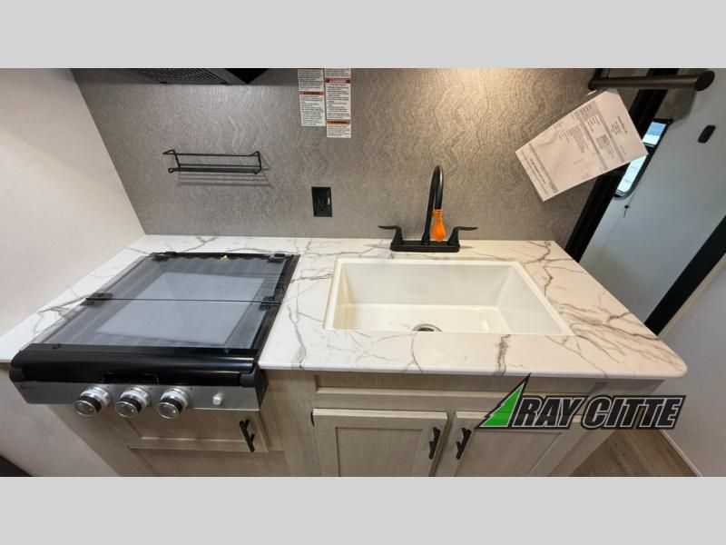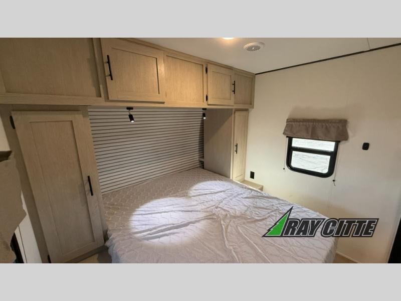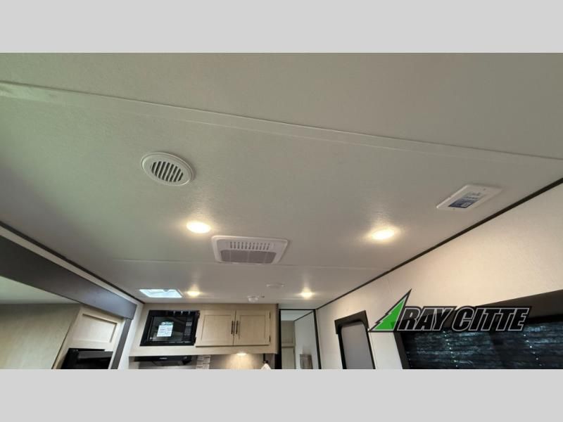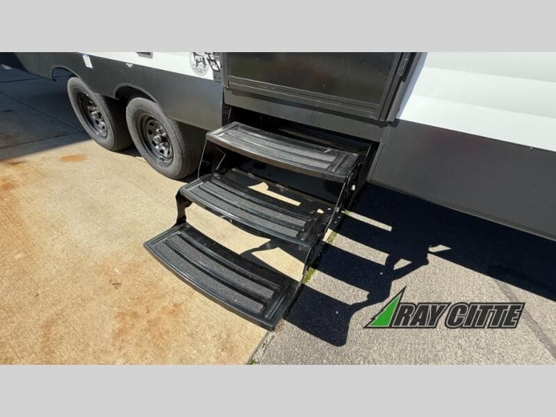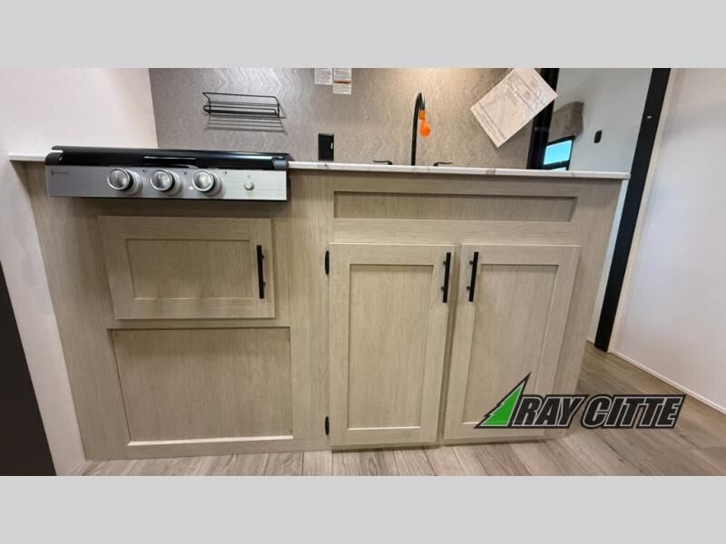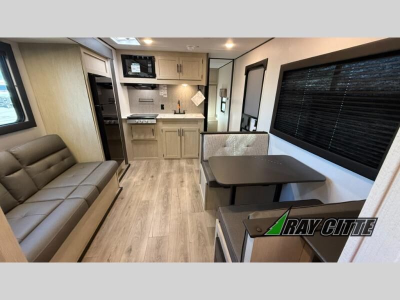 Your kids will love this travel trailer's double-size bunks that provide a cozy spot for children or guests, while the full bathroom offers convenience and comfort. The booth dinette is perfect for sharing meals with family or friends, and the pantry keeps your essentials organized. An entertainment center and sofa create a relaxing atmosphere to enjoy your favorite shows, and a refrigerator keeps your favorite snacks and drinks fresh. The front bedroom features a spacious queen bed, a dual wardrobe, and shelves for ample storage. On the exterior, the pass-through storage provides additional space for gear or equipment, and an outside kitchen offers the perfect spot for alfresco cooking and entertaining.
