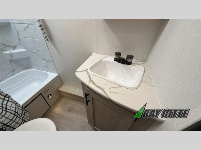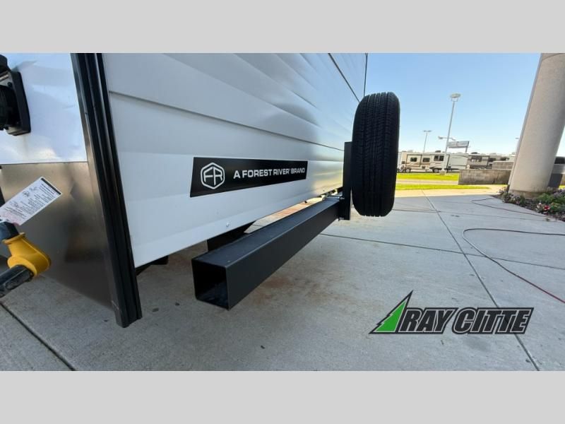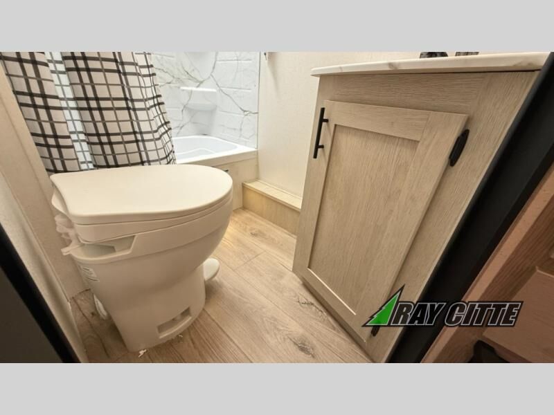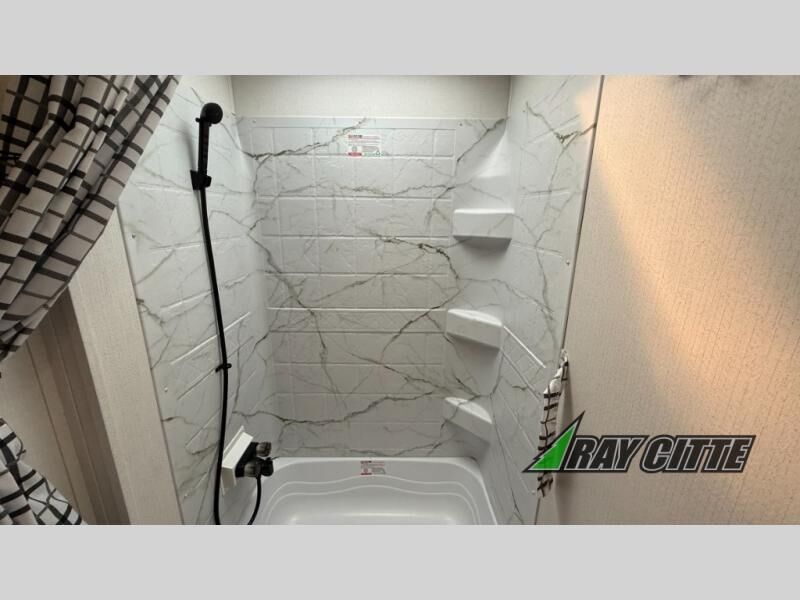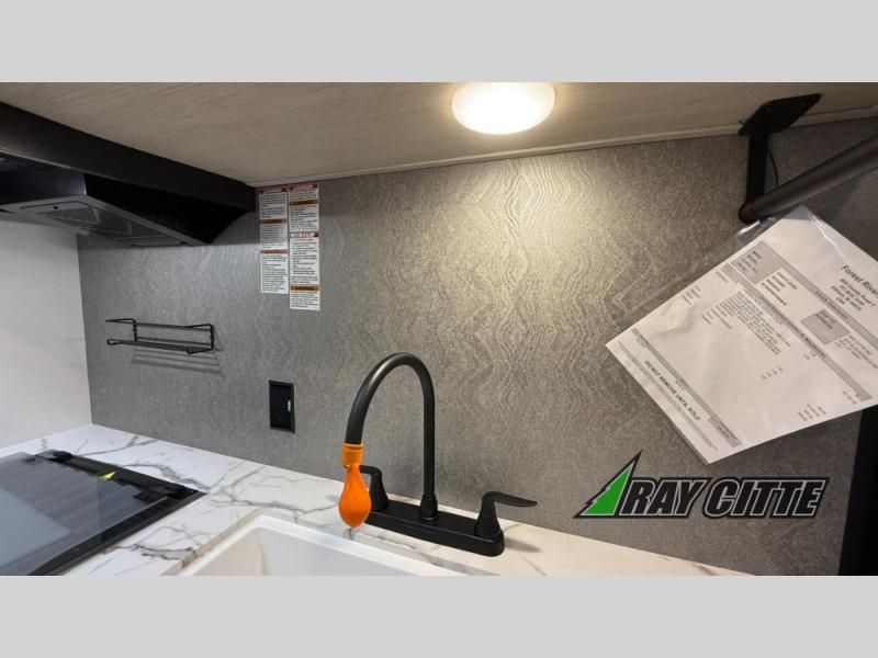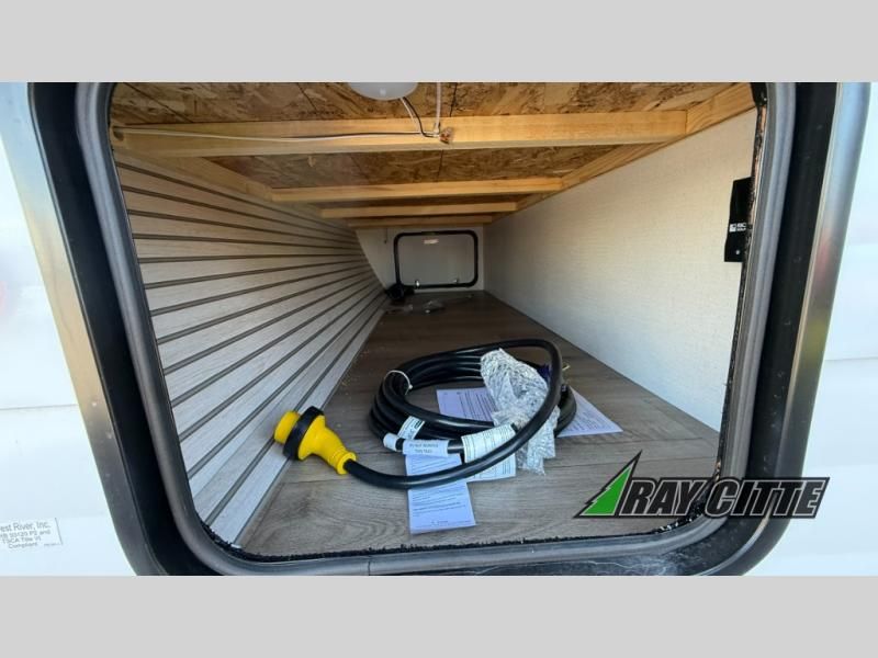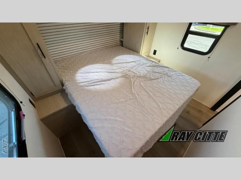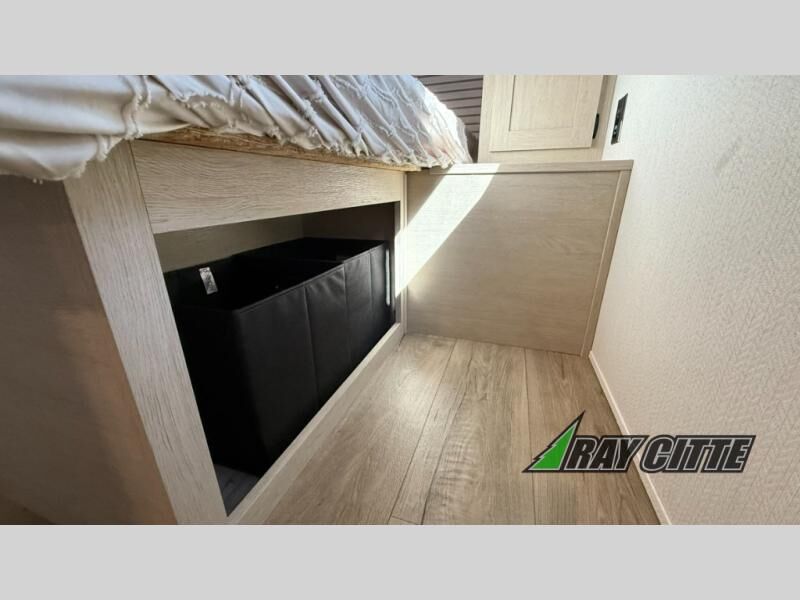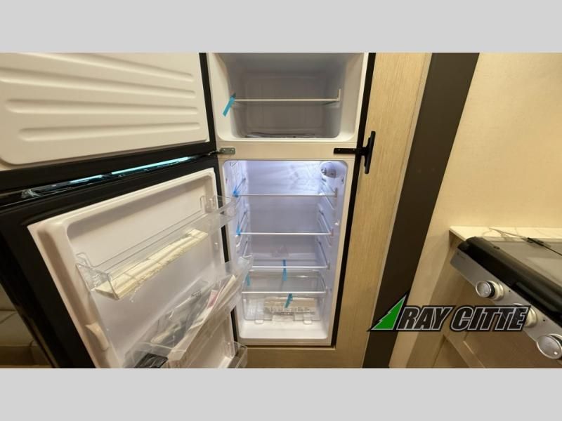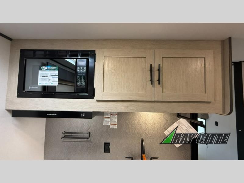 Your kids will love this travel trailer's double-size bunks that provide a cozy spot for children or guests, while the full bathroom offers convenience and comfort. The booth dinette is perfect for sharing meals with family or friends, and the pantry keeps your essentials organized. An entertainment center and sofa create a relaxing atmosphere to enjoy your favorite shows, and a refrigerator keeps your favorite snacks and drinks fresh. The front bedroom features a spacious queen bed, a dual wardrobe, and shelves for ample storage. On the exterior, the pass-through storage provides additional space for gear or equipment, and an outside kitchen offers the perfect spot for alfresco cooking and entertaining.