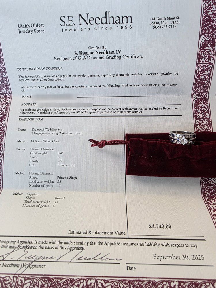 PayPal**** MOTIVATED TO SELL **** Exquisite custom women's wedding ring with certified appraisal. Crafted by local master jewelers S.E Needham of Logan, UT. Women's size 7 magnificent craftsmanship of 14k white gold, sapphires, and natural diamonds. Asking $1700 - OBO, please contact if interested or if you have questions.