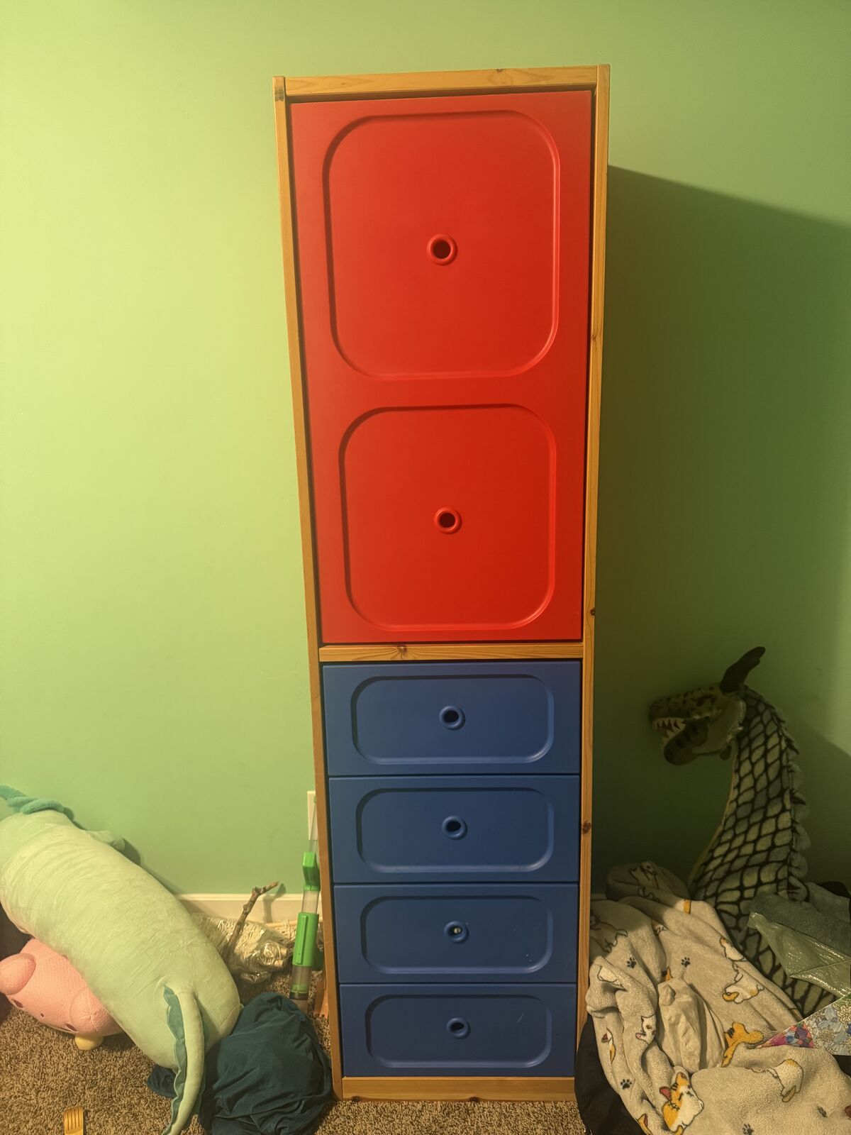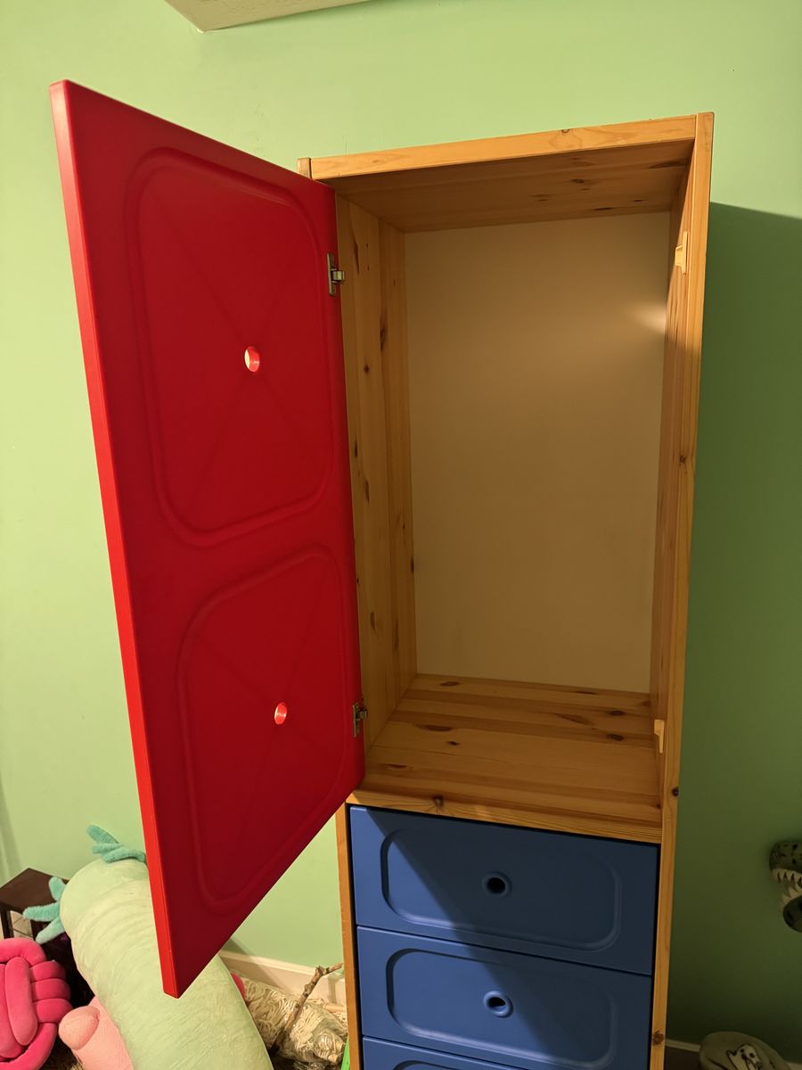 VenmoStorage cabinet, wood frame with plastic doors. Excellent condition. This has been used to store toys and craft supplies. About 70” tall and 18” wide. Asking $100 obo