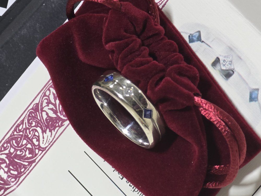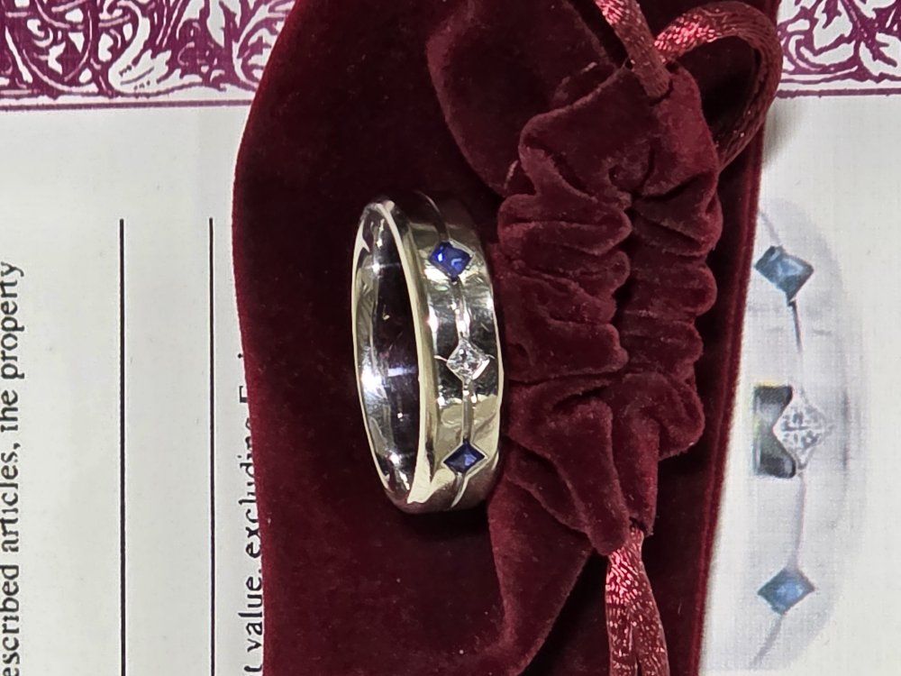 PayPal**** MOTIVATED TO SELL **** Darling custom men's wedding ring with certified appraisal. Crafted by local master jewelers S.E Needham of Logan, UT. Men's size 12.5 exquisite craftsmanship of 14k white gold, sapphires, and natural center diamond. Asking $1700 - OBO, please contact if interested or if you have questions.