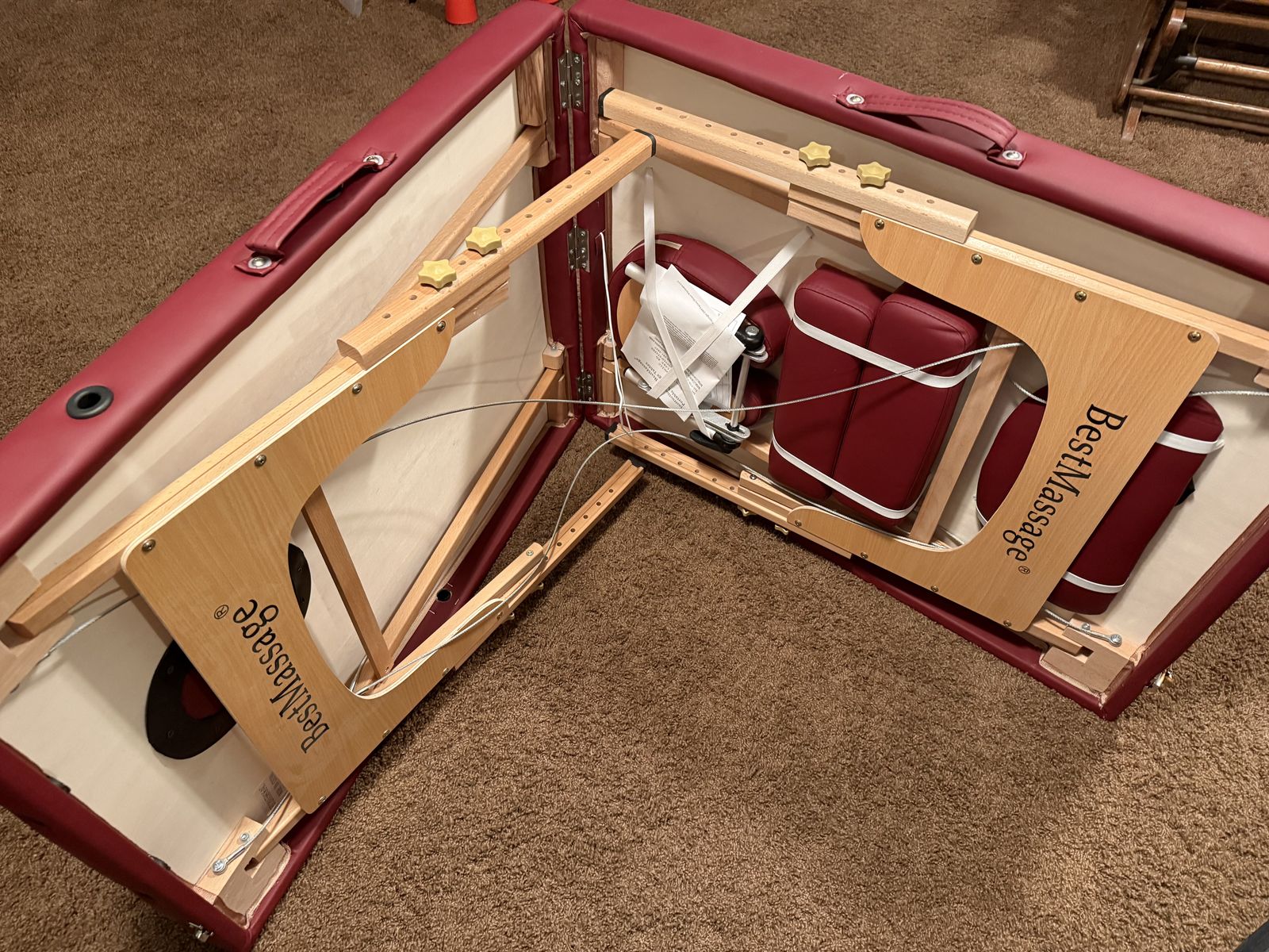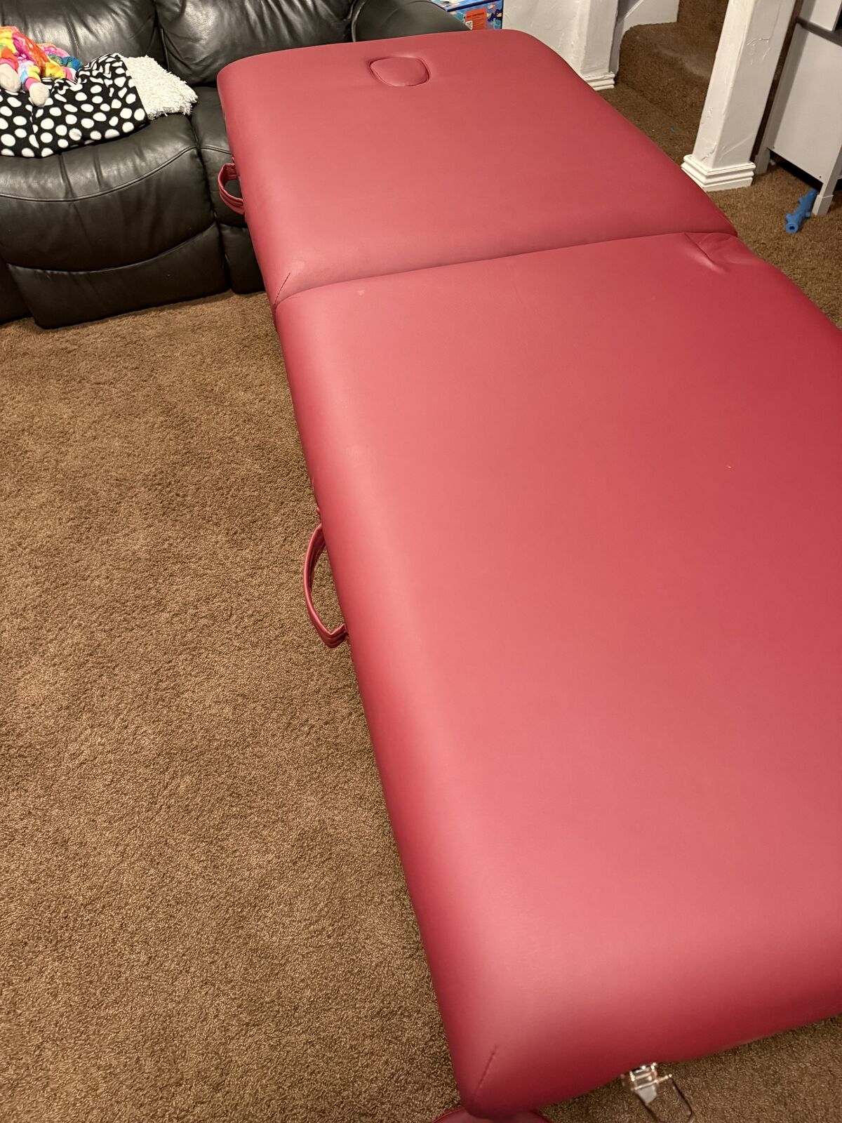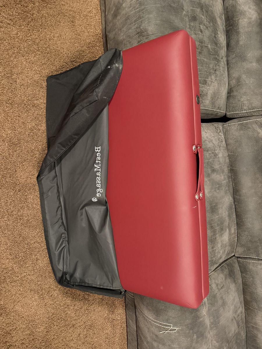 VenmoBestMassage Portable Massage Table. Lightly used, no damage. Adjustable height, adjustable headrest, Face Pillow, Hanging Arm Shelf, Carrying Case, 14" bolster, Reiki Panels. Currently retails for $140.00.