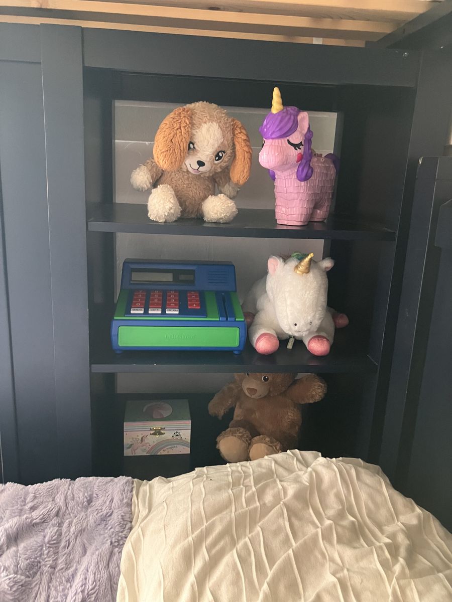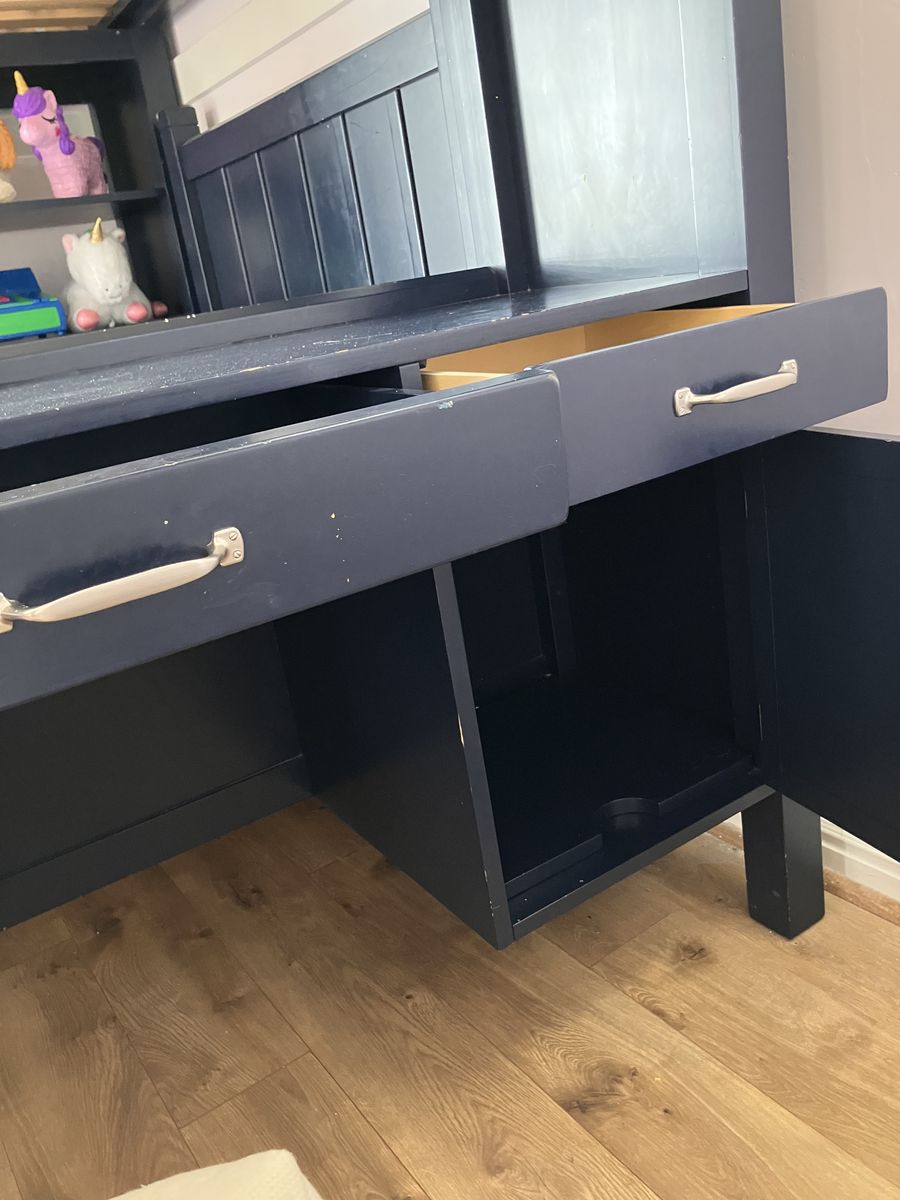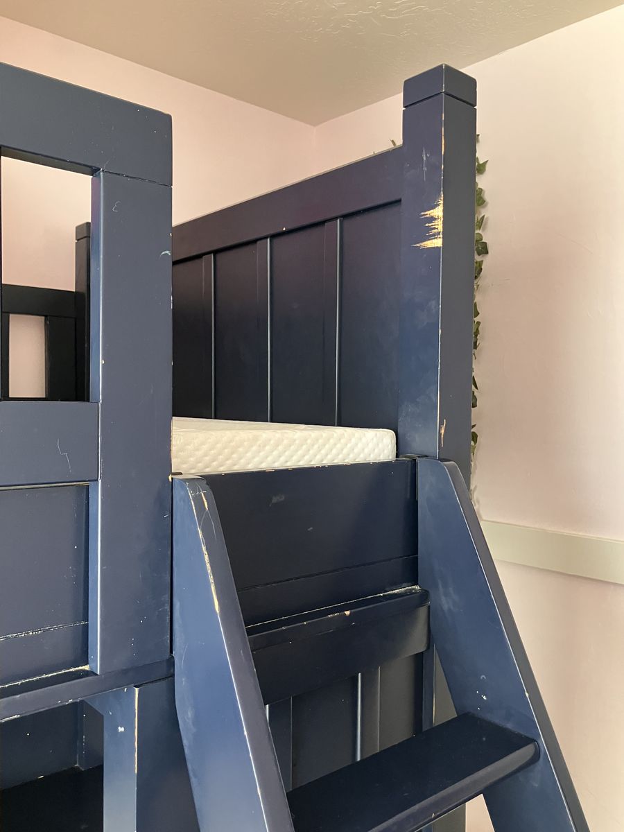 Navy Blue Pottery Barn twin over twin beds with desk, five drawers, and storage shelves. Includes red Pottery Barn Bankers chair. Measures 79” H, 80”L, 42” W. Very solid and well-made furniture. Drawers and cabinet open perfectly. Disassembles in several pieces: two twin beds (foot boards, headboards, side rails, wood slats), the desk is one piece, ladder is one piece, and the drawers with storage shelves is one piece. Need a trailer/truck and 2-3 people to move. The twin beds can be moved with one person, but the desk and drawer pieces are extremely heavy. Will be disassembled upon pick up. Easy assembly.