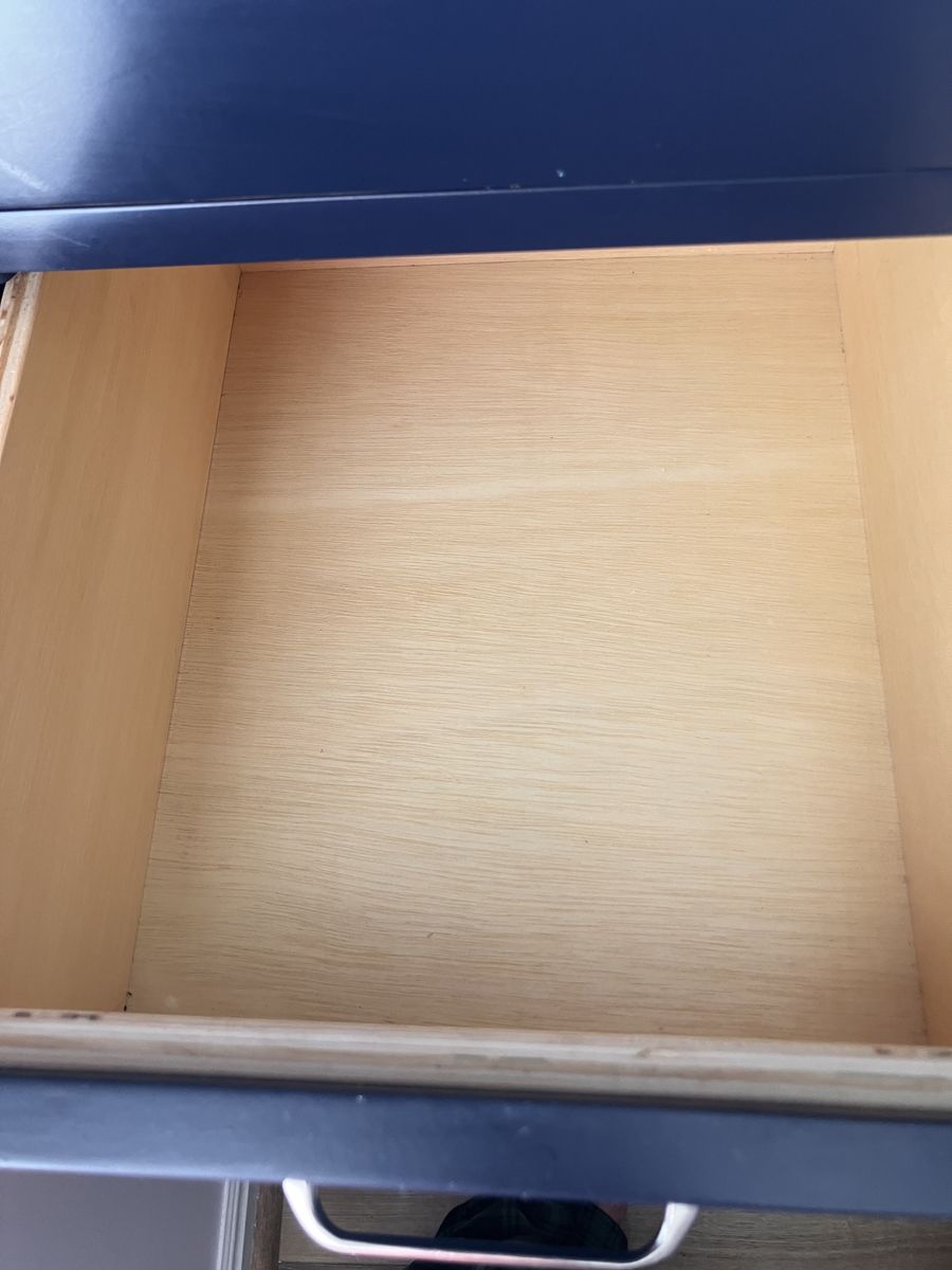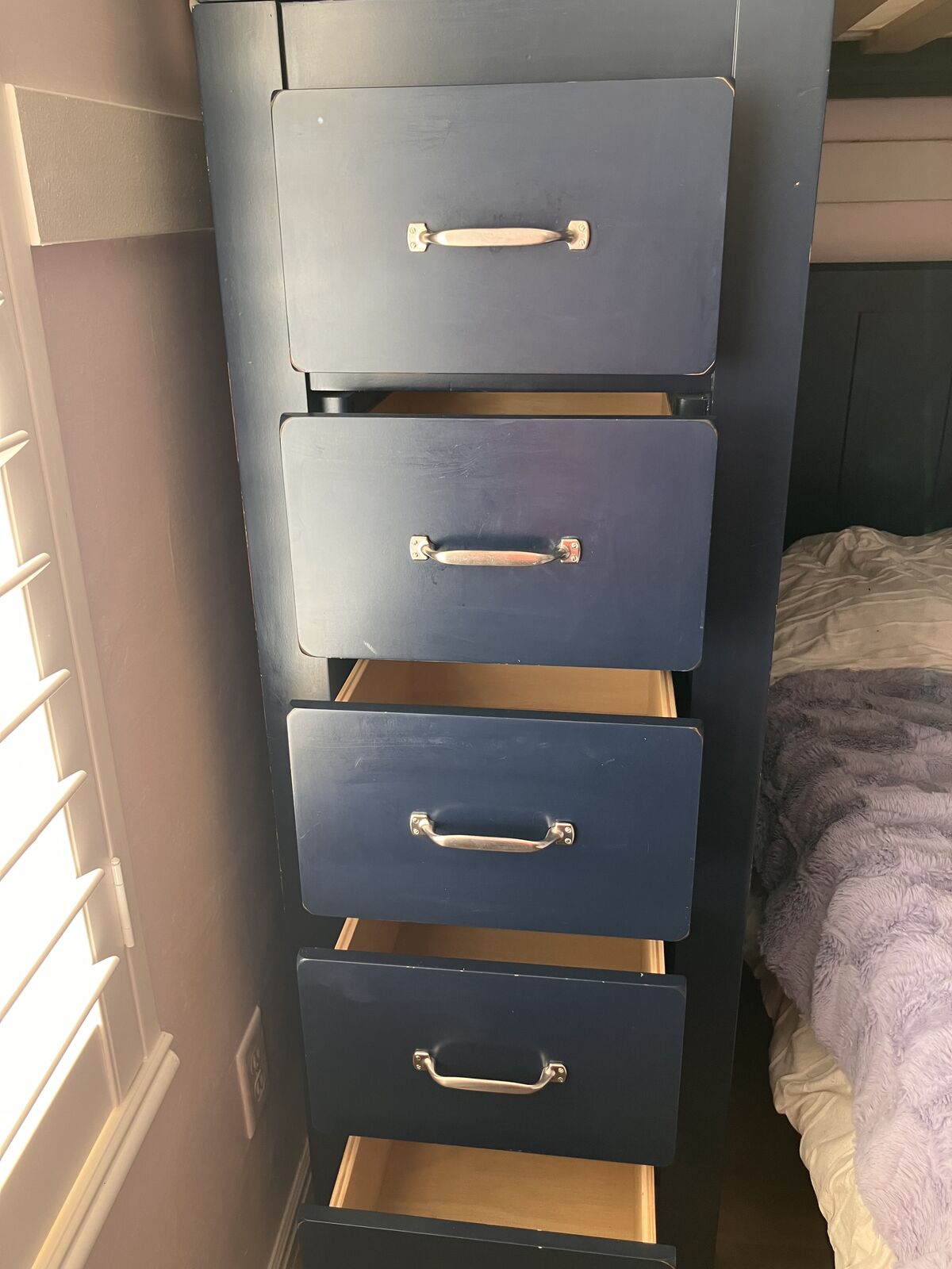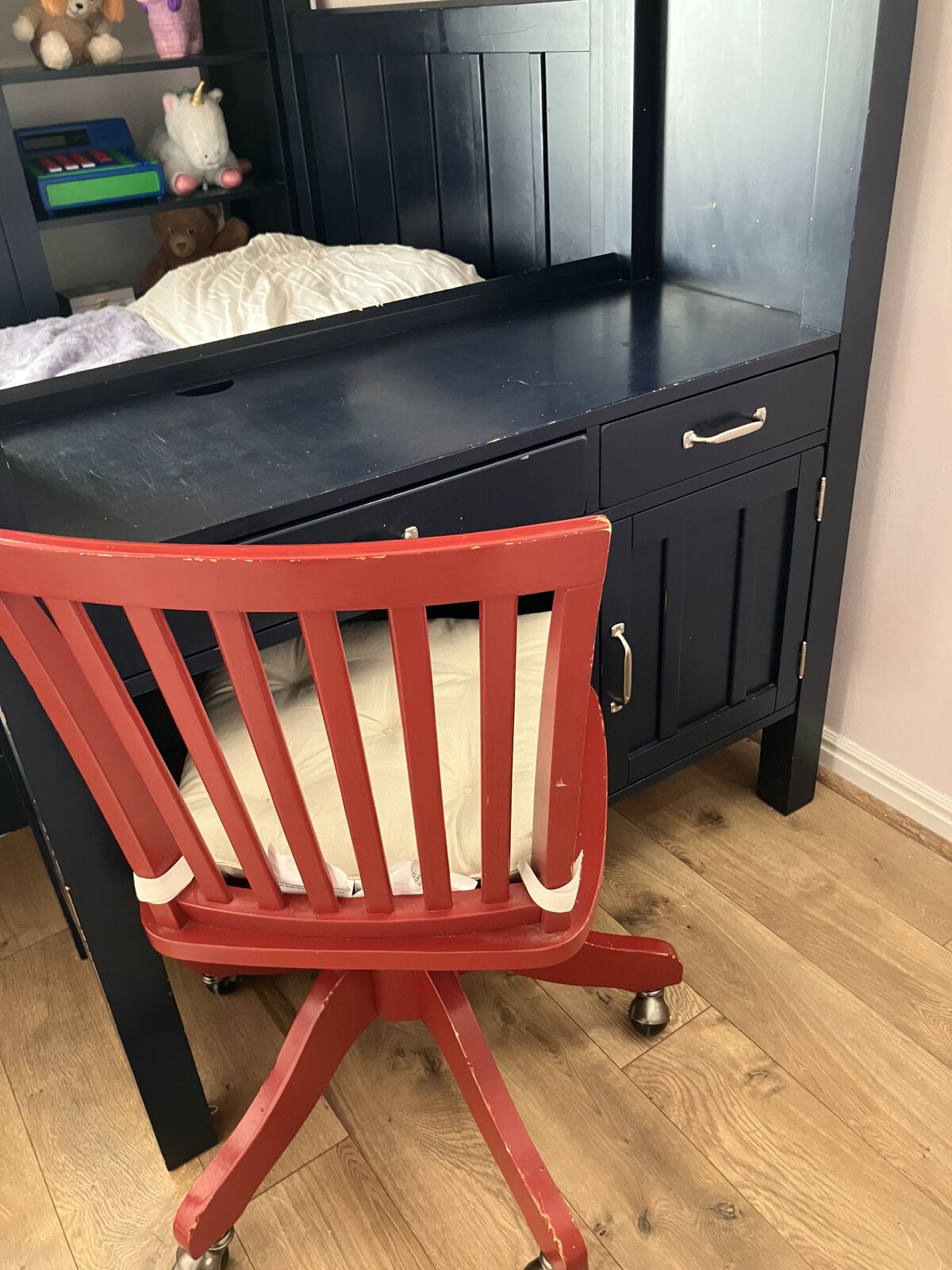 Navy Blue Pottery Barn twin over twin beds with desk, five drawers, and storage shelves. Includes red Pottery Barn Bankers chair. Measures 79” H, 80”L, 42” W. Very solid and well-made furniture. Drawers and cabinet open perfectly. Disassembles in several pieces: two twin beds (foot boards, headboards, side rails, wood slats), the desk is one piece, ladder is one piece, and the drawers with storage shelves is one piece. Need a trailer/truck and 2-3 people to move. The twin beds can be moved with one person, but the desk and drawer pieces are extremely heavy. Will be disassembled upon pick up. Easy assembly.