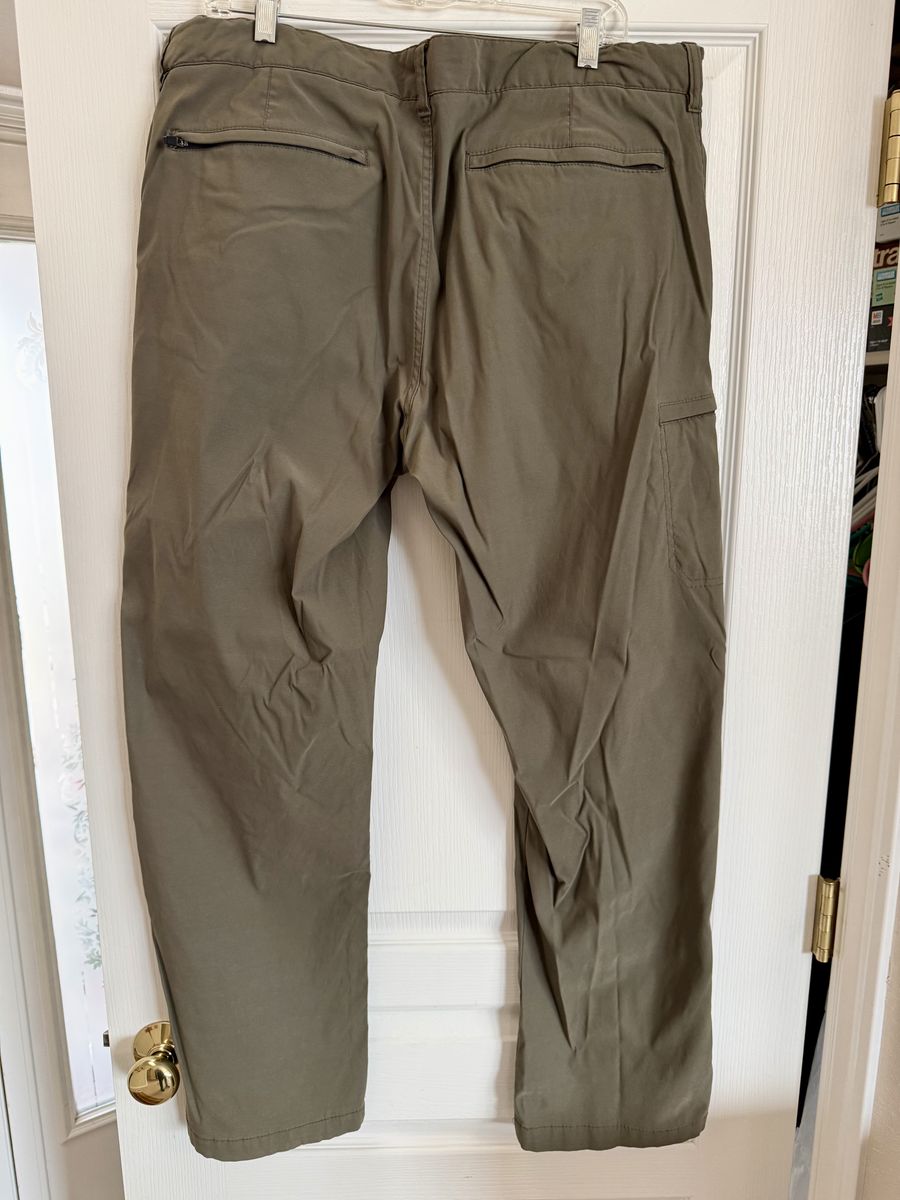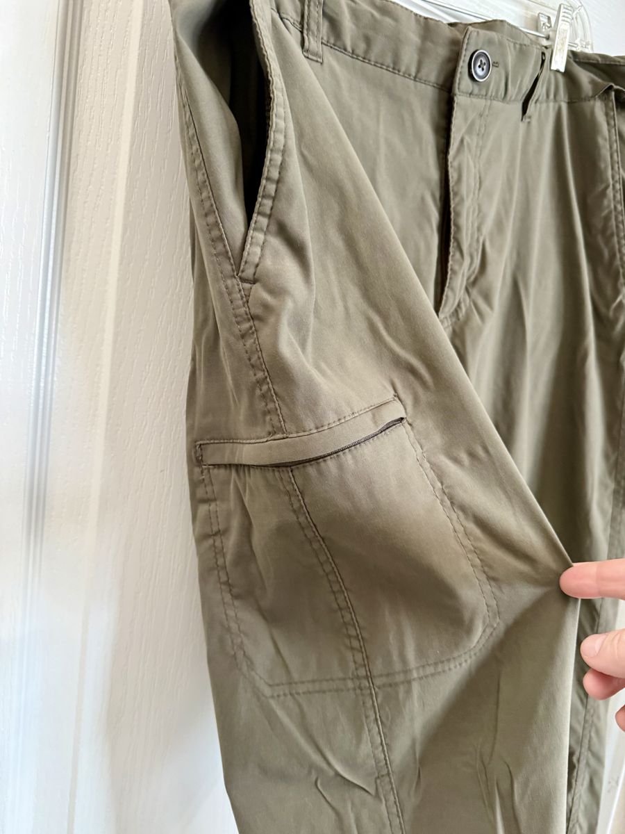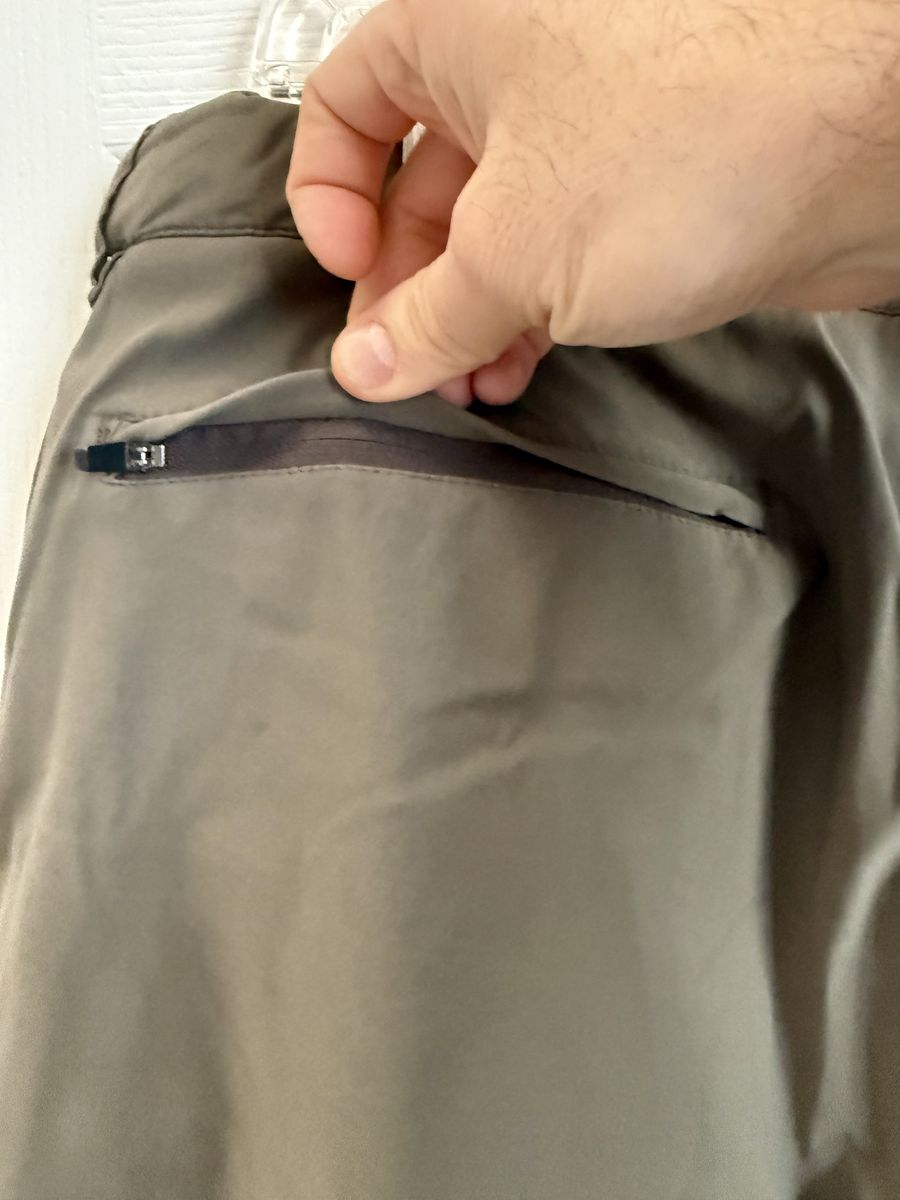 All pockets have a zipper except the 2 front hand pockets. Great hiking pants or anything active. Olive green color. $10.