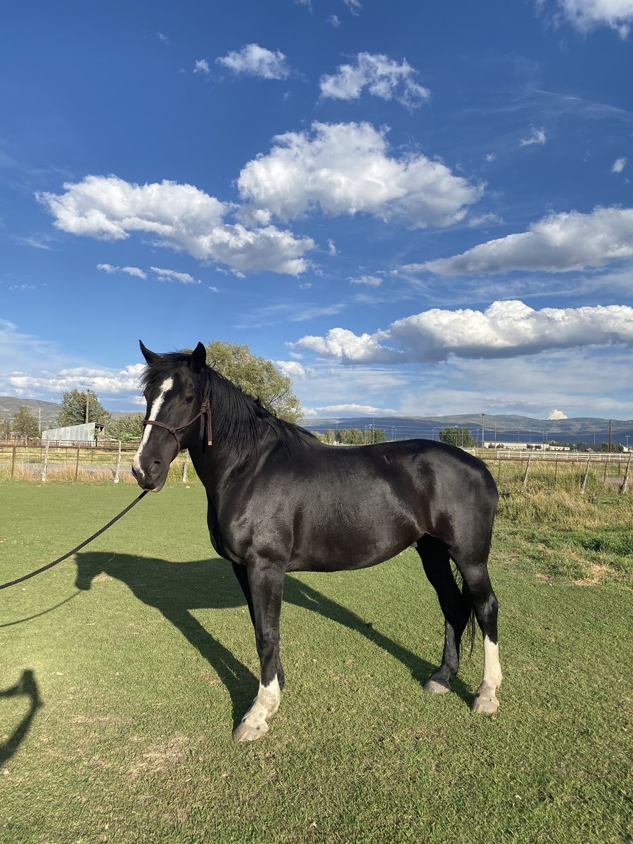 Ghost is a striking 14-year-old Percheron/Quarter Horse cross standing a powerful 18 hands. He’s the kind that makes people stop and look — big, solid, and impressive — yet surprisingly light and athletic under saddle. He moves out beautifully and is a joy to cover miles on.