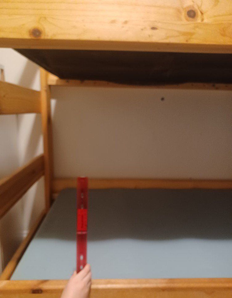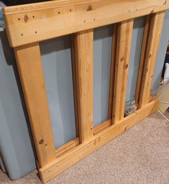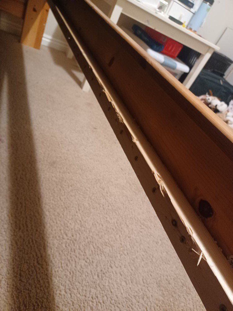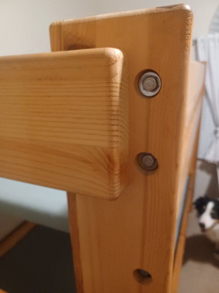 My daughter decided to move out of the bunk bed, because older sibling left to College. Strong bolt screws hold it together. This bunk bed frame is now disassembled and ready for pickup!