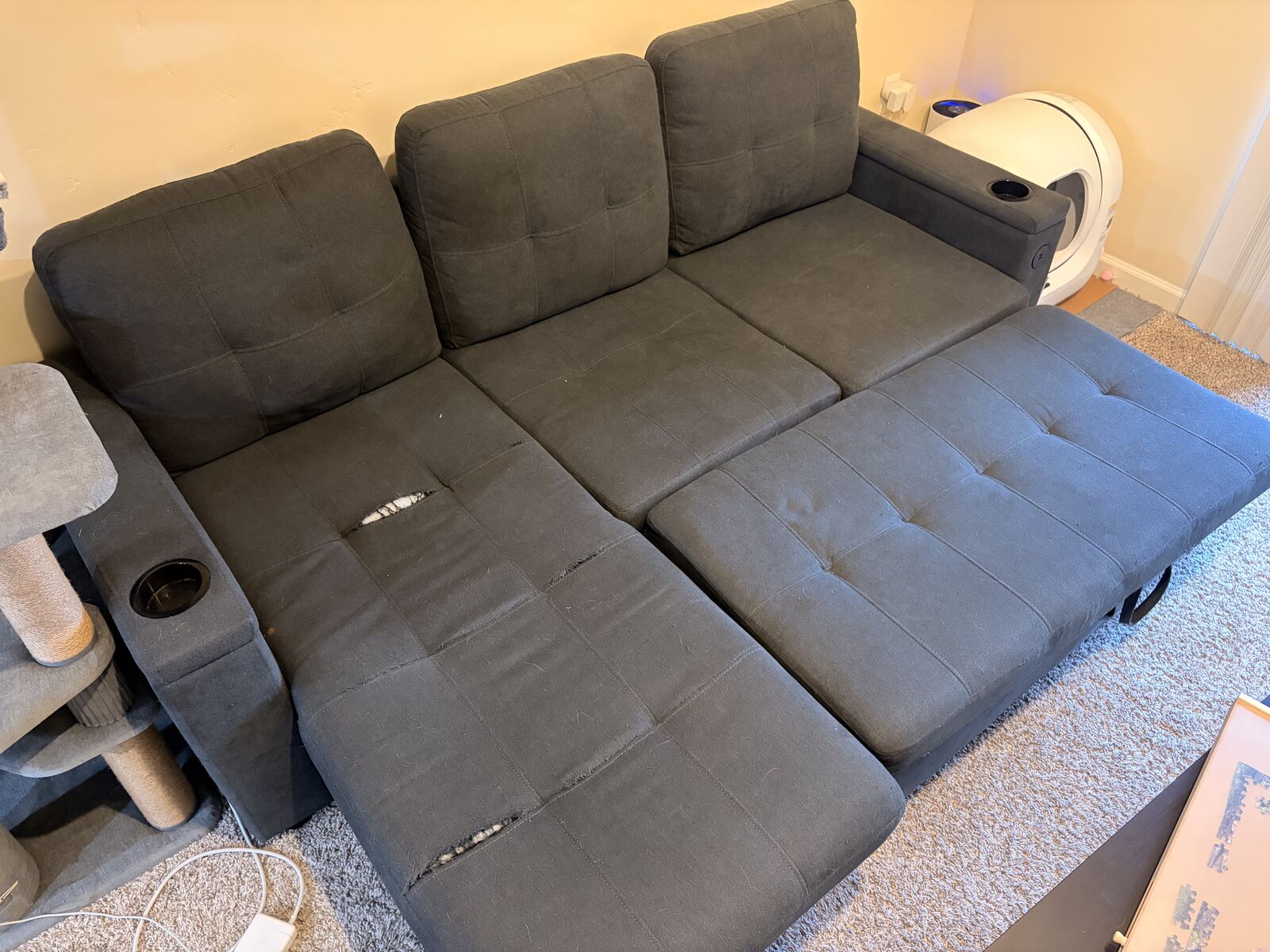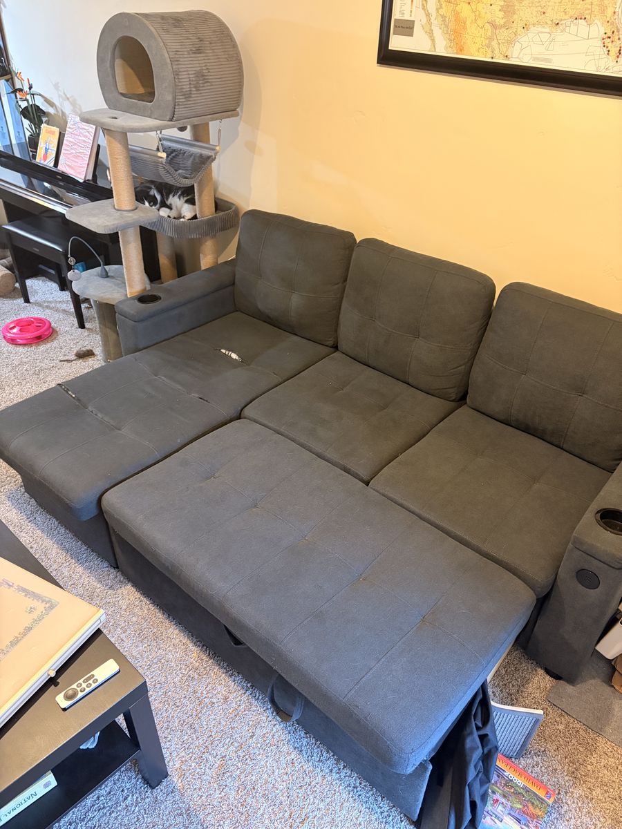 Cute little grey L shape sleeper sofa! Super comfortable and functional sofa! Can be pushed in to create a little L shape sofa or pulled out into a full bed! Minimum wear and tear (a few tears) but could easily be fixed and not noticeable with pillows! Must pick up located in Sugar house! $150 OBO Text me at 1 (385) 218-7381