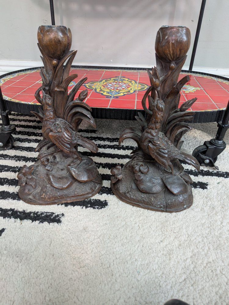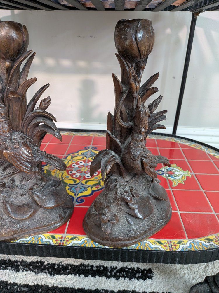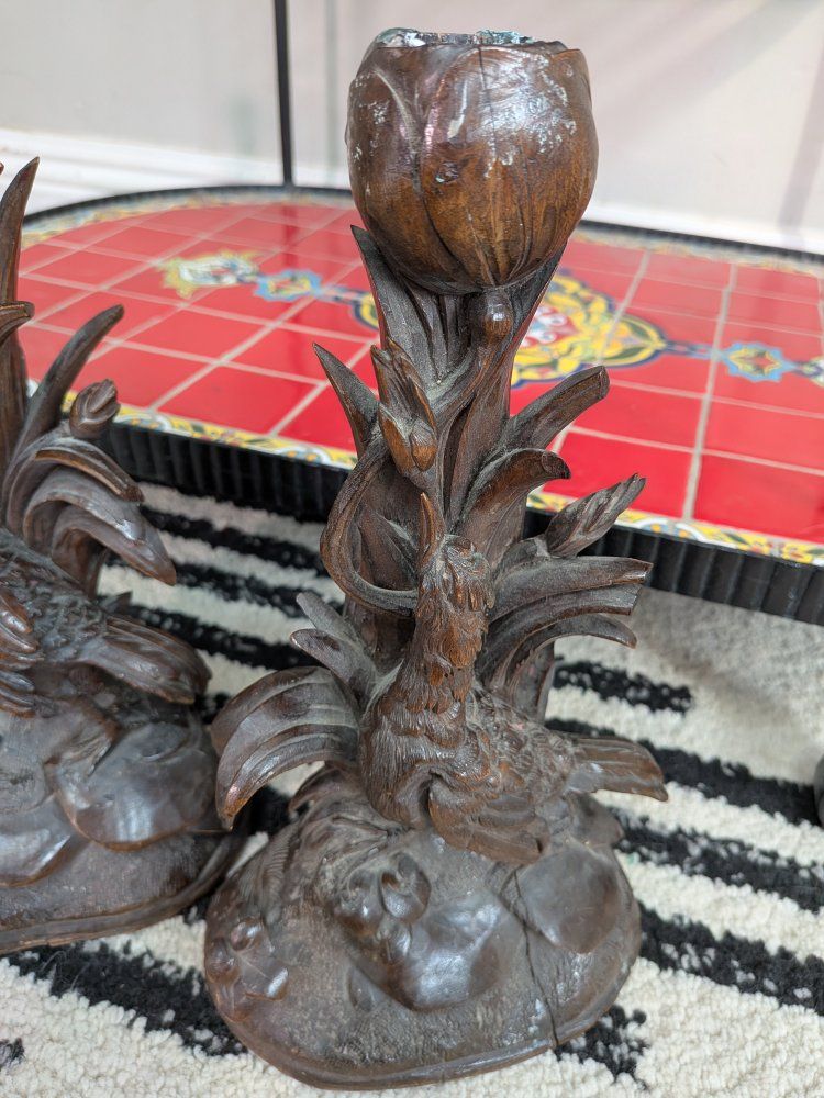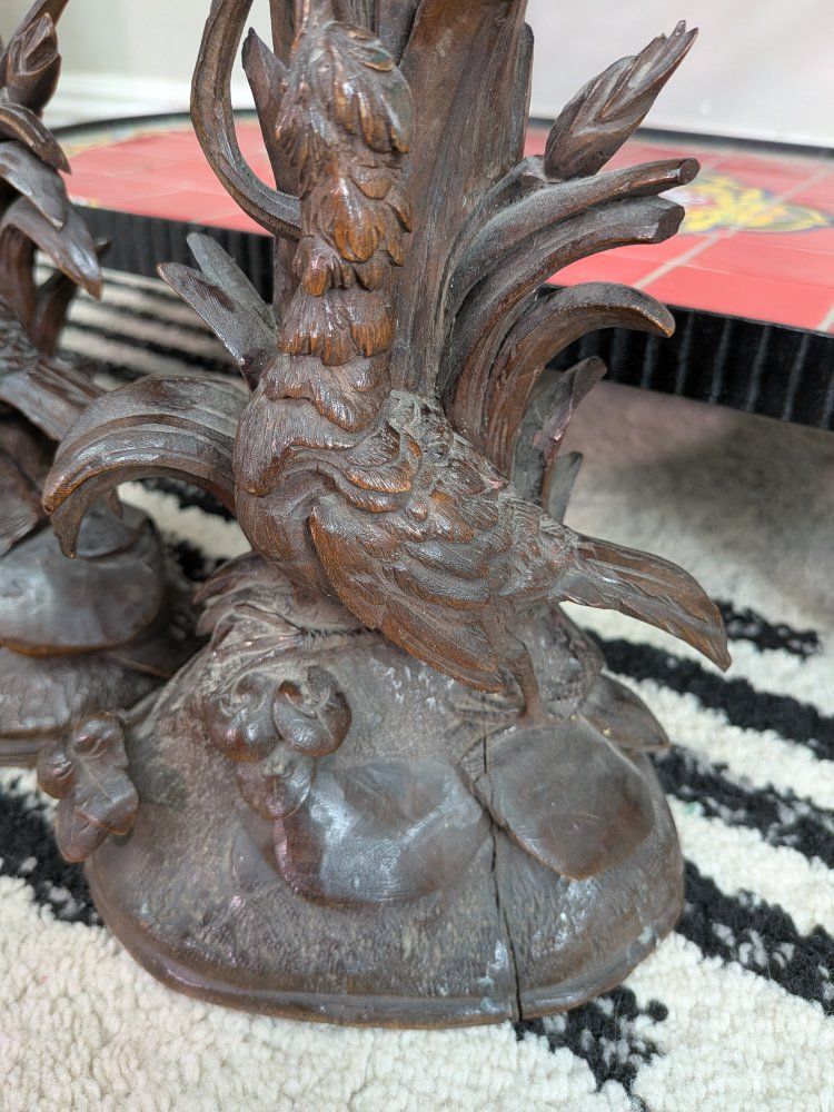 Pair of Antique German Black forest Candle holders Bird figurine wood carved. A few cracks and little edges broken off but overall really beautiful and intricately carved. Measurements in photos.