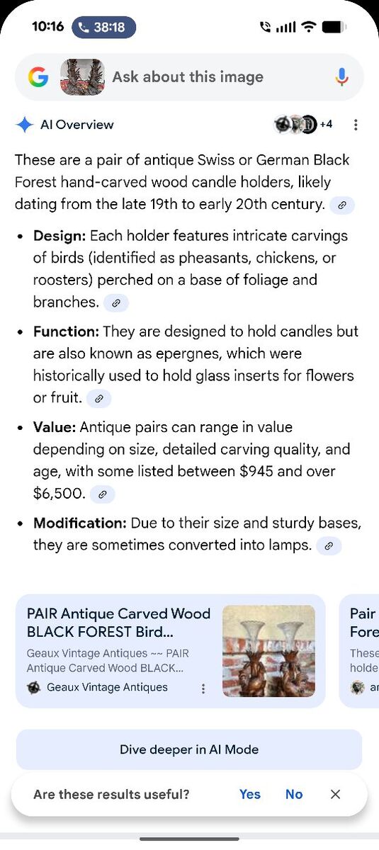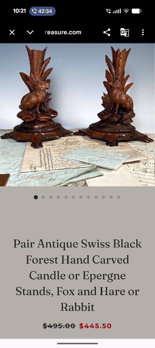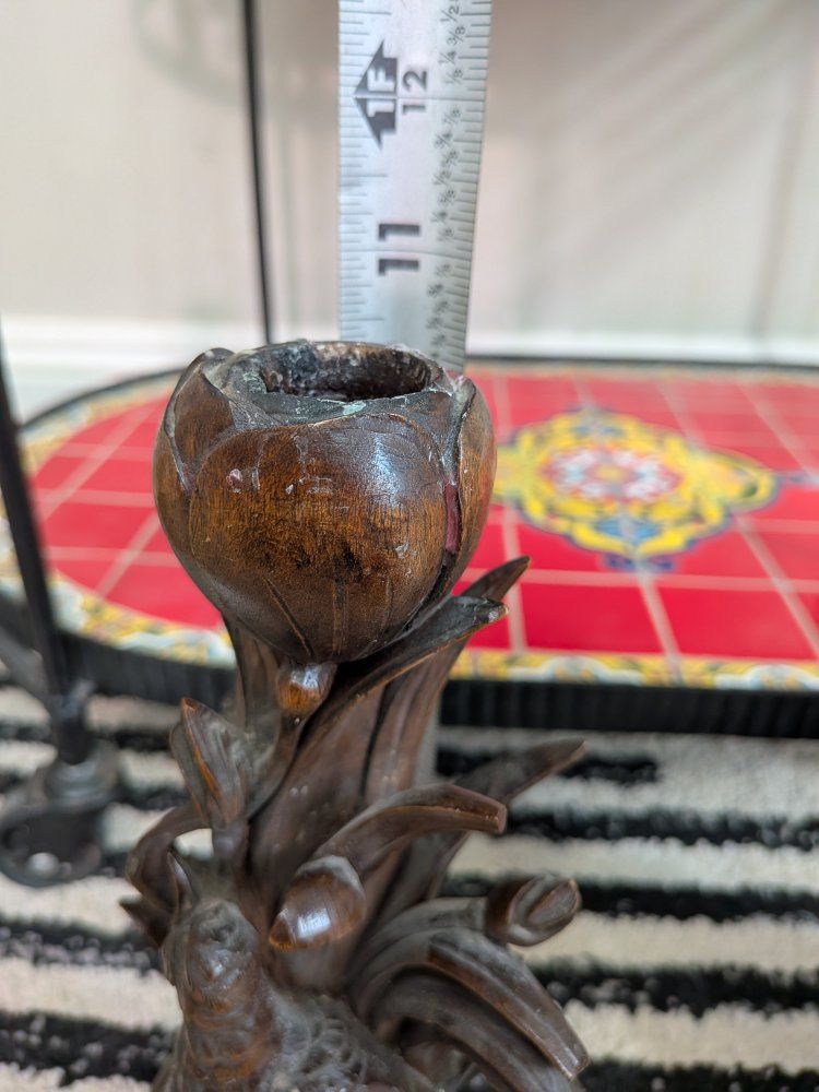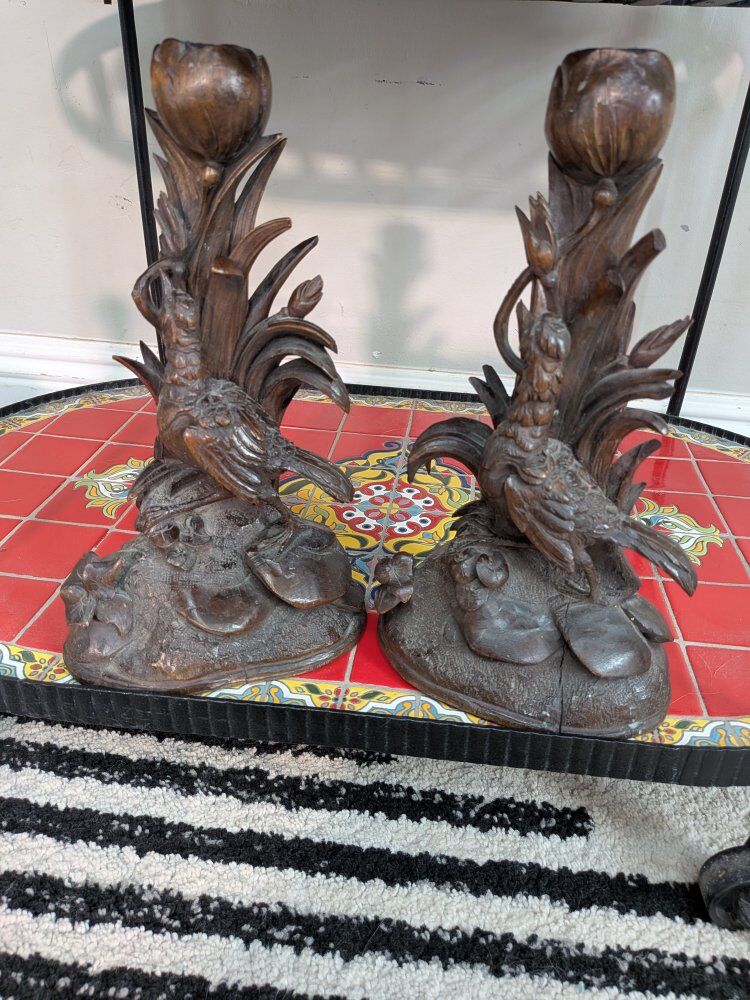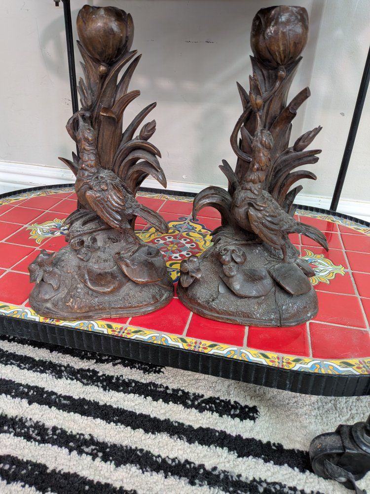 Pair of Antique German Black forest Candle holders Bird figurine wood carved. A few cracks and little edges broken off but overall really beautiful and intricately carved. Measurements in photos.