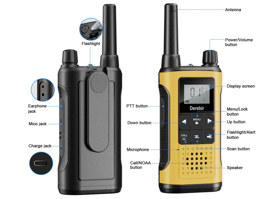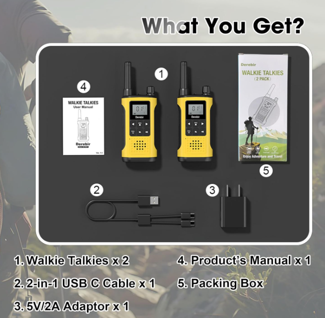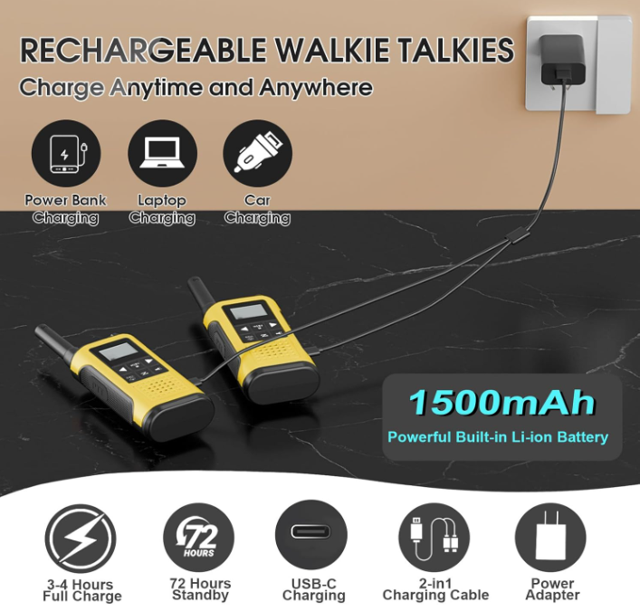 ZelleRechargeable & Long-lastingEach rechargeable walkie talkie comes with a built-in 1500mAh lithium battery that is safe and long-lasting, you don't need to replace batteries frequently, save the environment and your wallet. Equipped with 2-in-1 USB-C charging cable, you can fully charge up 2 pack walkie takies simultaneously within 3-4 hours. Outstanding standby time up to 72 hours, making them perfect for outdoor activities