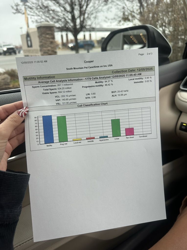 Cooper has passed his OFA exams and full health testing. He only carries for one copy of CDDY (no CDPA) and consistently shows high sperm count and motility—a recent analysis is attached below. He’s producing stunning puppies with amazing color variety and large litters!