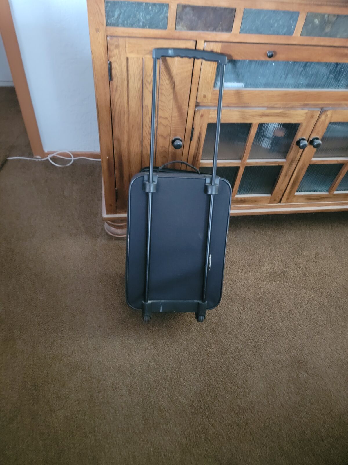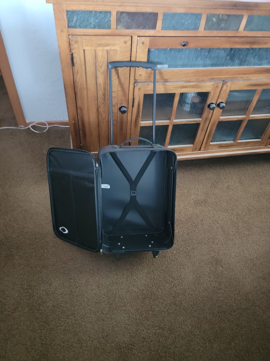 ROLLING SUITCASE. 20" TALL 13" WIDE 7" DEEP.