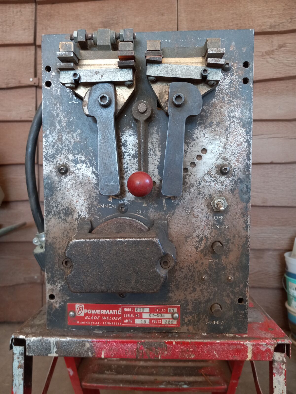 Powermatic Model 600 welder. This unit is designed to square the blade ends, weld them together, anneal the blade, and grind to correct thickness. This model requires a 220 Volt, 15 Amp circuit and can weld blades of 1/16" thru 3/4" in width. Also included are full Operating Instructions and a 12 foot extension cord.