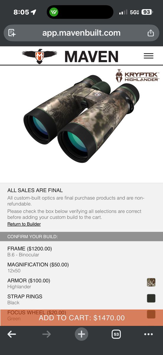 VenmoI’m looking to sell my lightly used Maven B.6 12x50 custom binos. I had these as a back up pair and they only went into the field a few times. They are a couple years old but in excellent condition with zero flaws. Text is best. Thanks for looking