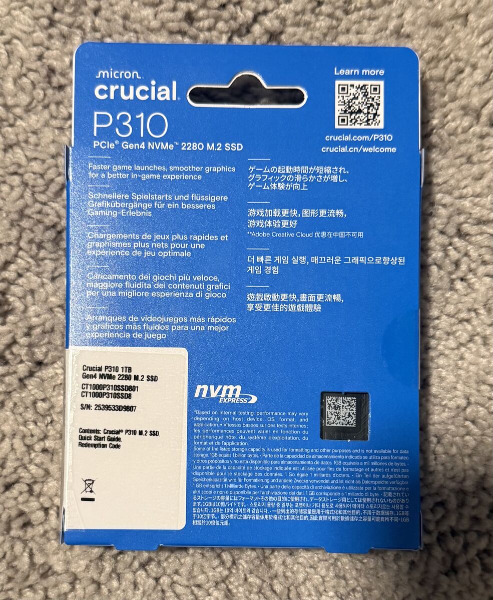 ApplePayBrand new Crucial P310 1TB PCIe Gen4 NVMe M.2 2280 SSD — factory sealed. Great upgrade for a gaming PC or laptop that supports NVMe M.2 2280.\