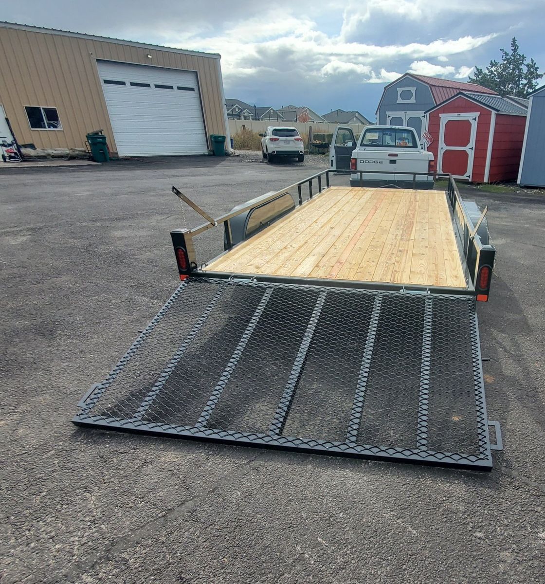 available now: 7x14 single axle, 7x14 Tandem 7700lbs, 7X16 Tandem 7700lbs, 7x18 Tandem 7700lbs Black Powdercoated Rear Ramp 205/75R 14" Radial Recessed Lights Swivel Jack Tie Down Loops Lighted License 3500 Lb Axle Greasable Spindles Tailgate L.E.D. Lights Mountain Tech Motorsports/Trailers 5551 West 5500 South, Hooper Ut 84315 Shawn Keller 801-309-8290