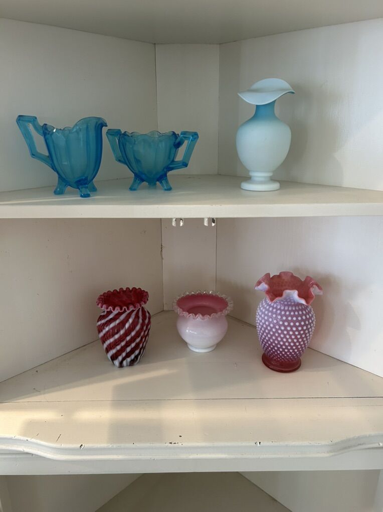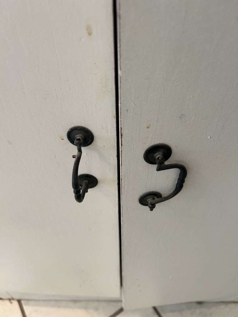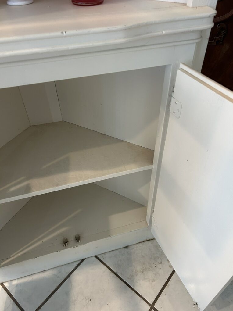 Simple but easy to fit decor. The one glass piece in upper cabinet is missing and one handle in bottom but they were not original so would change anyway. Solid