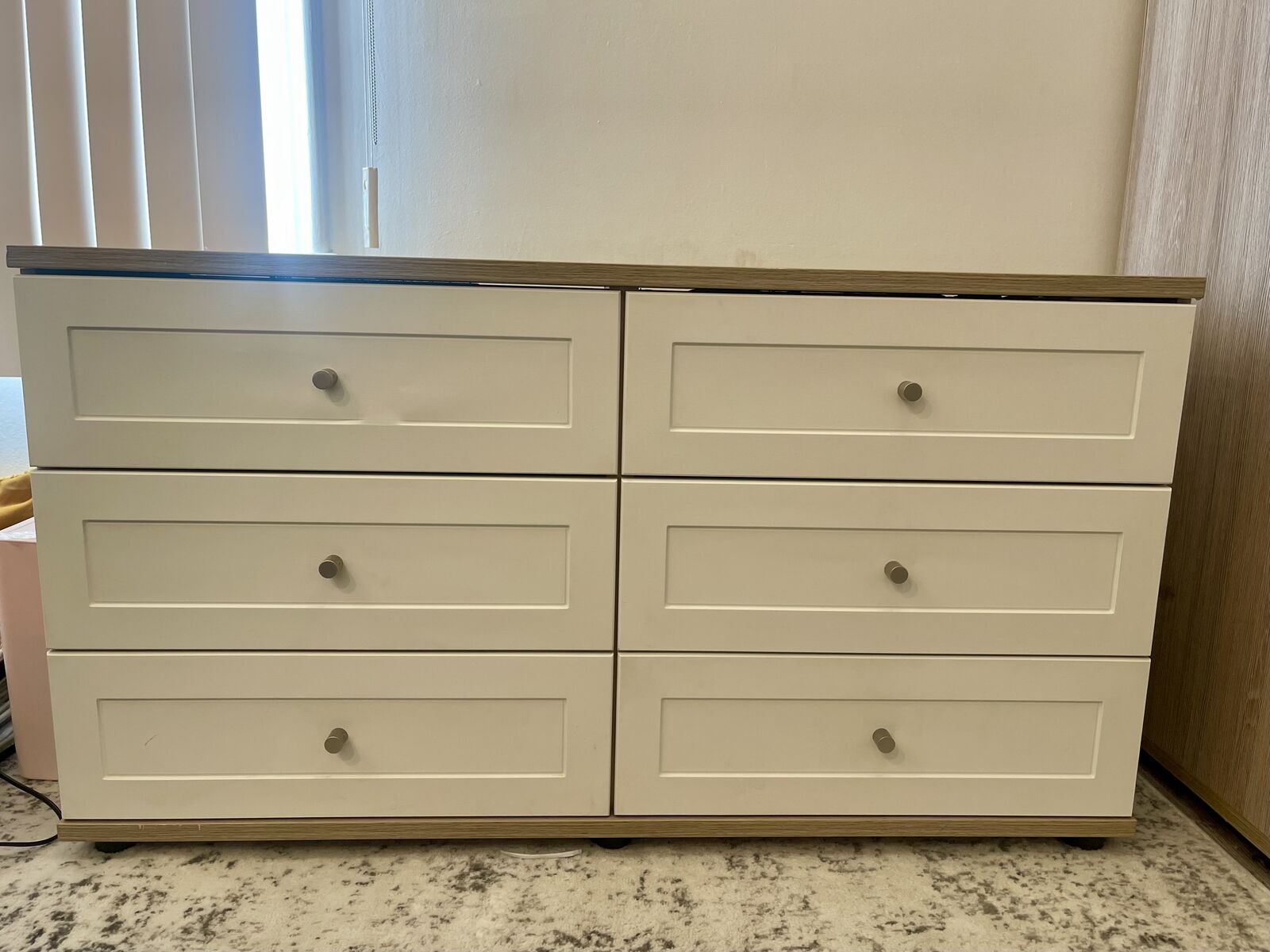 VenmoModern white and oak bedroom furniture set including a 2-door wardrobe with drawers and a 6-drawer dresser. Clean, contemporary style with lots of storage — perfect for bedrooms, guest rooms, apartments, or staging.