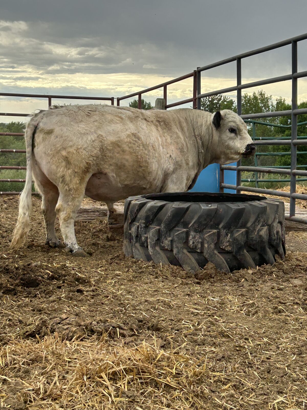 Dexter/British white cross bull for sale. This bull has great temperament with a good size and build. Would make a great replacement throws good hardy calves with color.
