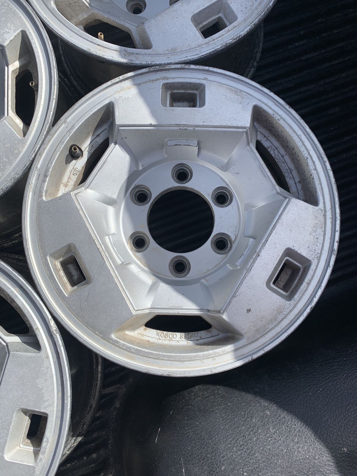 VenmoSet of 4 OEM Nissan Hardbody wheels with original center caps! 6 lug factory alloys from a late 80s to early 90s D21. Solid set in good shape with normal wear for their age. Perfect for a Hardbody or early Pathfinder restoration, mini truck build, or classic 4x4 setup!