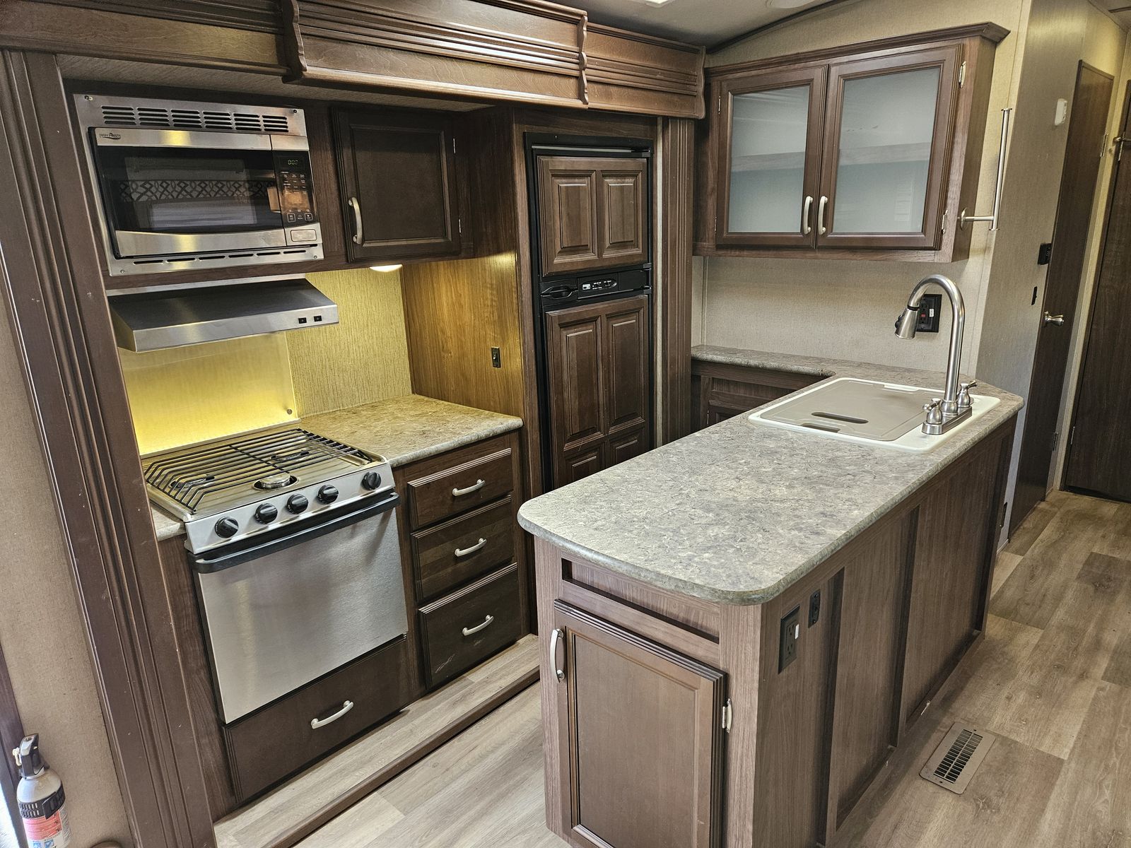 Large L-Shaped Kitchen with Full Size Gas/Elec Fridge, 3 Burner Cooktop with Range, Oven, Microwave, and Double Sink with Cover!