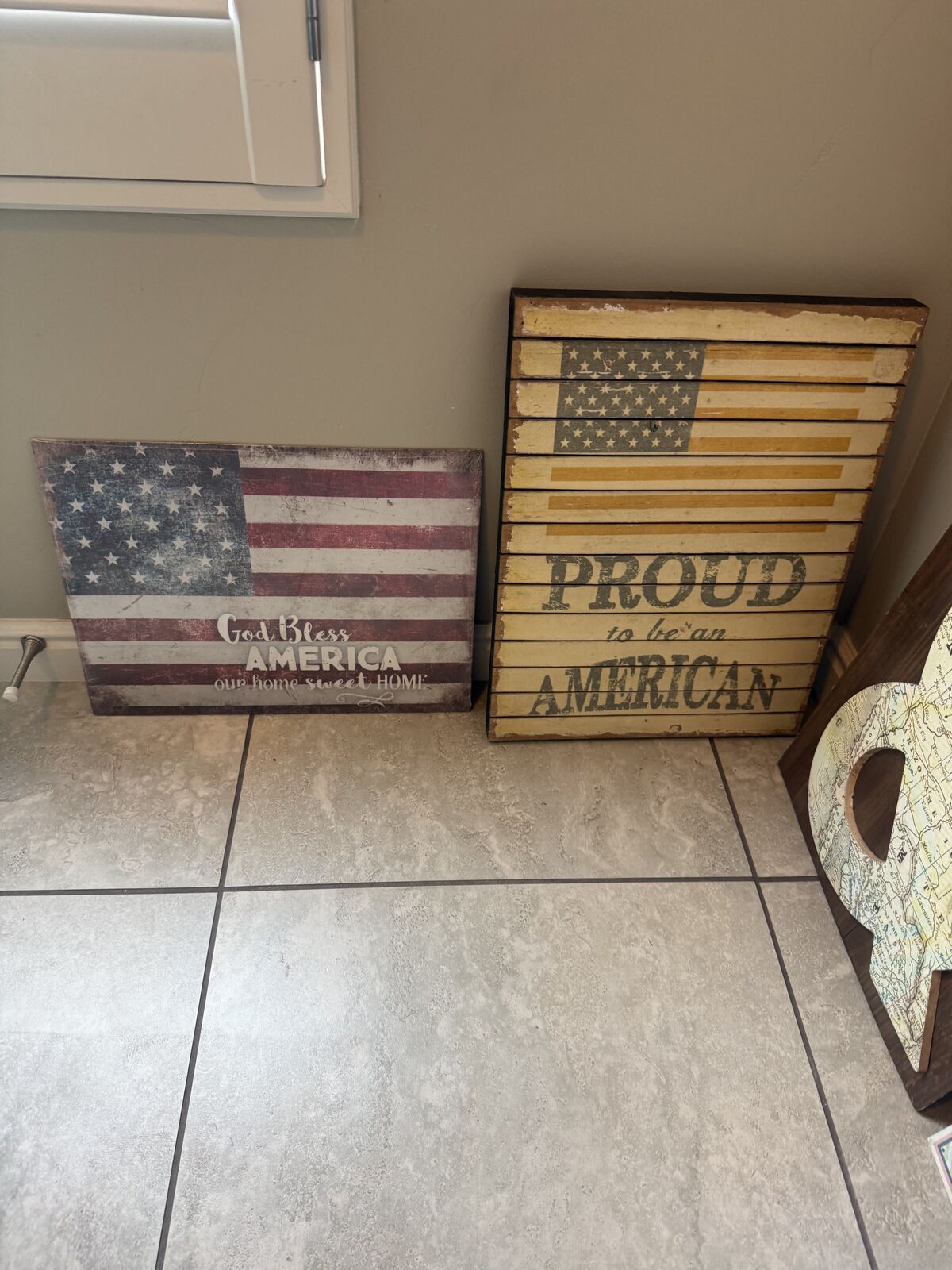 ZelleThe American flag and the Eat At Mom’s signs are new in plastic wrap. The proud American and the ampersand are wood. The others are tin.