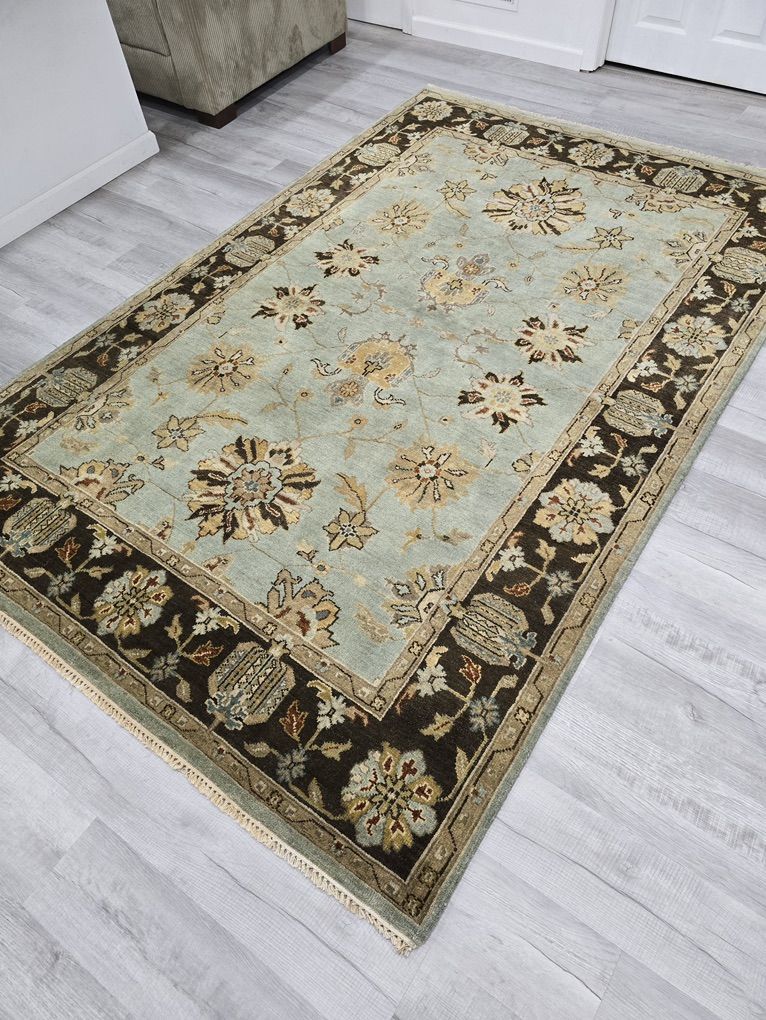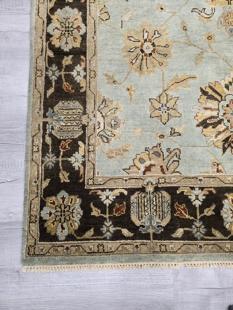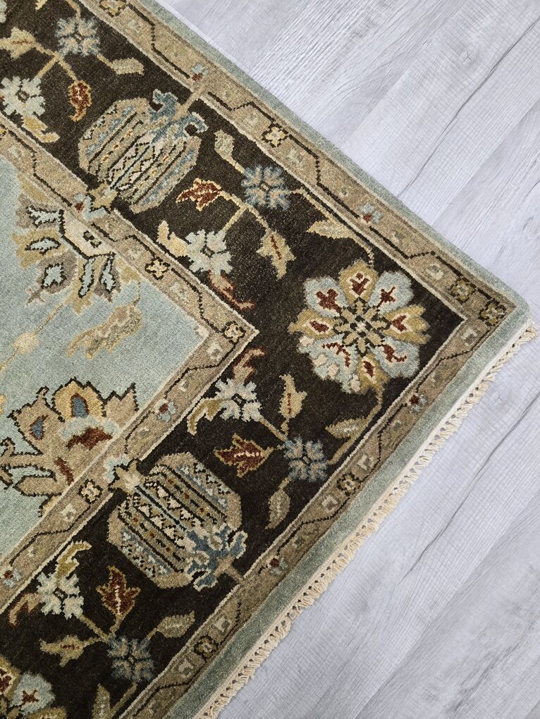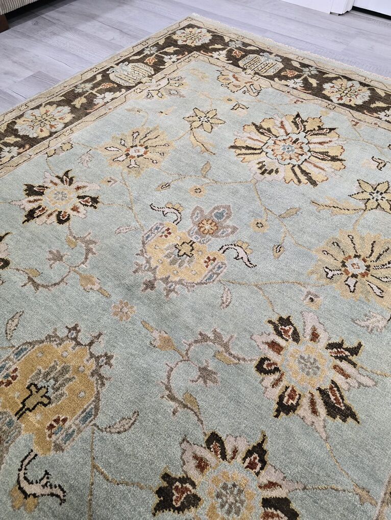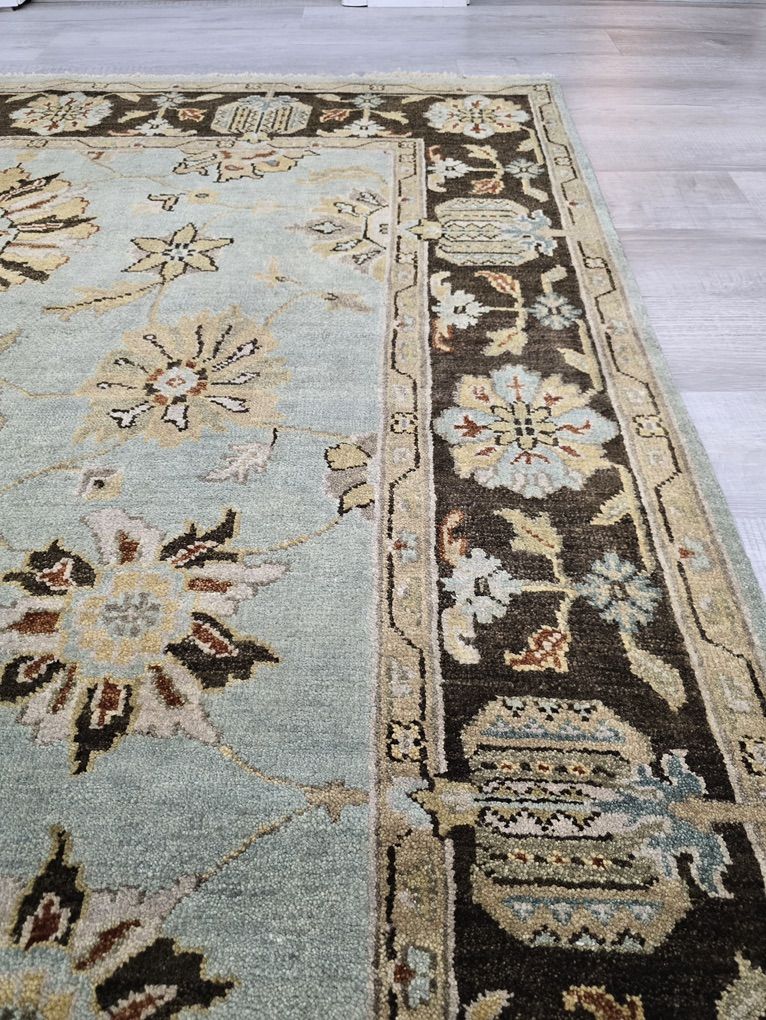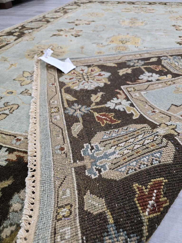 ZelleThis rug features a soft, muted blue field framed by a rich chocolate brown border, creating the perfect balance of light and depth. It showcases a classic Oushak design in warm ivory, golden wheat, soft taupe, and subtle rust accents. Its airy blue center brightens a room, while the darker border grounds the space. Pair it with warm woods, leather, and brass for a cozy, collected look.