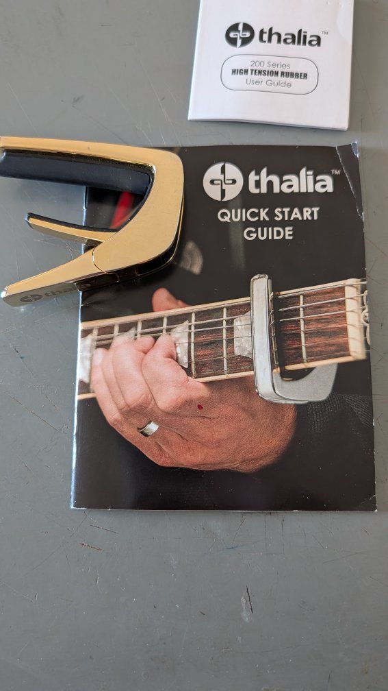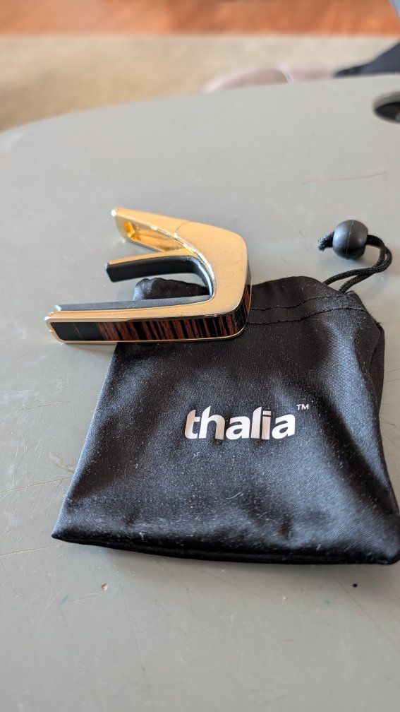 VenmoThalia capo for six-string guitars with changeable fret pads to fit neck radius of many other brands of guitars. Gold finish with wood insert. Protective bag, extra pads and user guide and quick start guide. These sell for considerably more than I'm asking and really give your guitar the look.