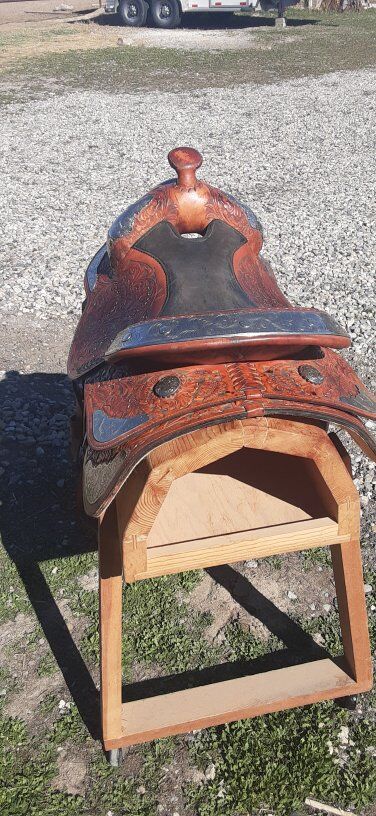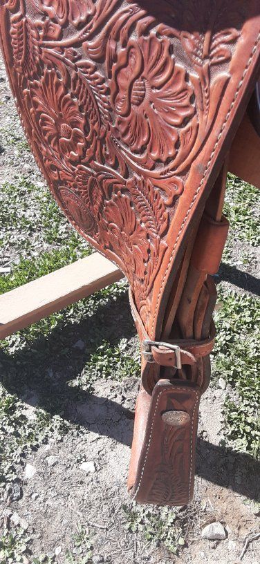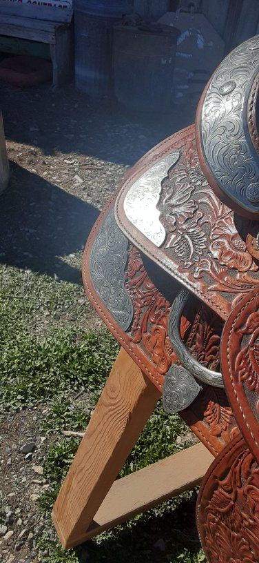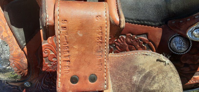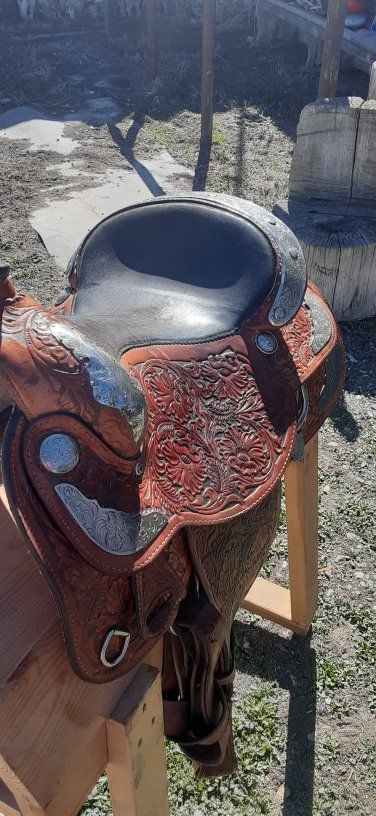 Amazing 15 in Hereford saddle, lots of tooling and silver. 7 on gullet 28 in skirt fleece is in great condition. This is a really pretty saddle.