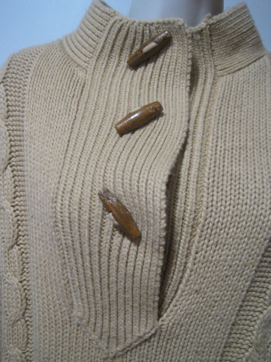 The Chesley Tan Cable Knit Wood Button Tasseled Acrylic Poncho Sweater is a stylish and versatile addition to any woman's wardrobe. This sleeveless sweater features a mock neck neckline and is made from cozy acrylic material. The geometric cable-knit pattern adds a touch of sophistication, while the tasseled and button accents give it a unique and trendy look. Perfect for travel, parties, or casual outings, this sweater is easy to care for with machine washable fabric. Whether worn in winter, fall, or spring, this poncho sweater from Chesley is sure to make a statement.
