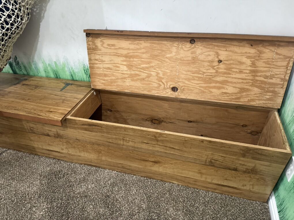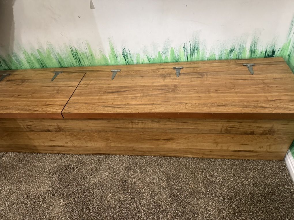 Custom made bench with built in storage. 17” tall 17” deep and 8’ long. Great fur playroom, garage, man cave. First $20 cash gets it. Cash only.