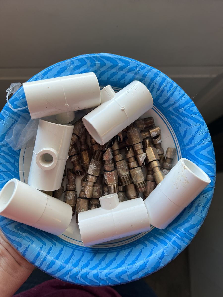 Brass auto water nipples. 28 total, pluss some extra parts and t’s. These are to set up a pvc auto water system. This system was a huge time saver when I was raising rabbits. $1 each, or $25 for everything.