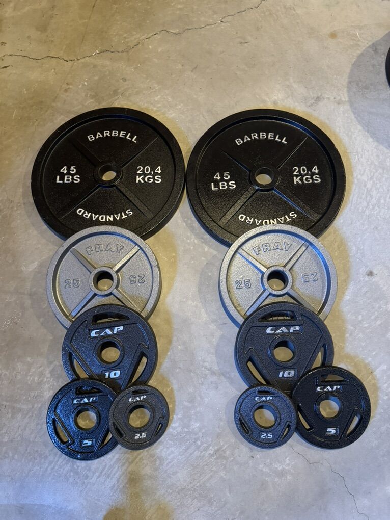 ZelleMoving and selling my gym equipment since I won’t have the space for it anymore. Olympic weight plate set with 2” holes. Set includes: 2x45 2x25 2x10 2x5 2x2.5