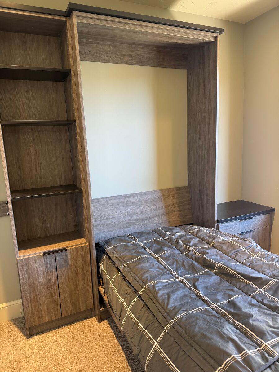 VenmoTwin murphy bed for sale. Matress not included. New murphy bed hardwear along with side cabinet with shelving, nightstand and fold up desk on the front incldued. Installation availible for addtional cost.